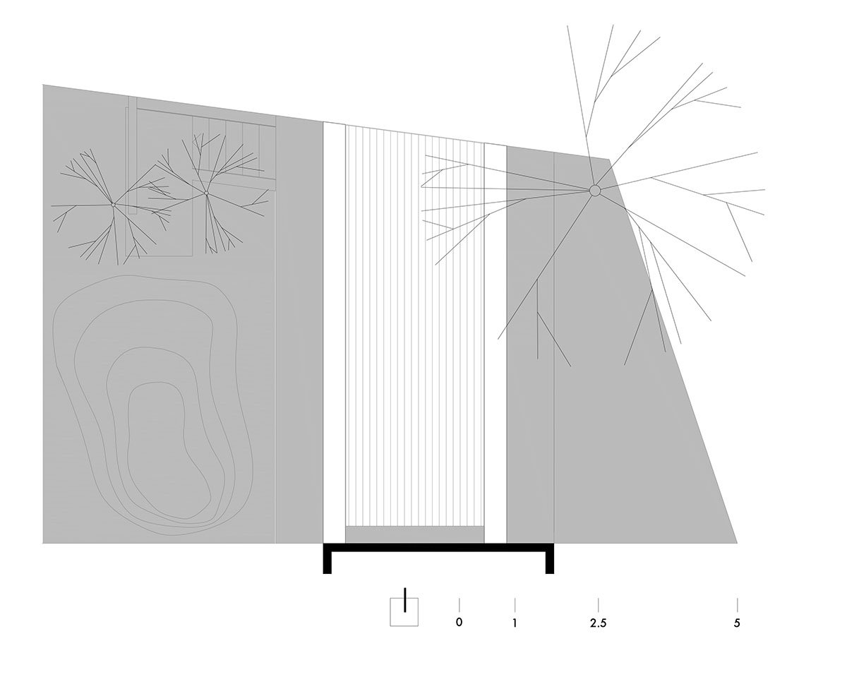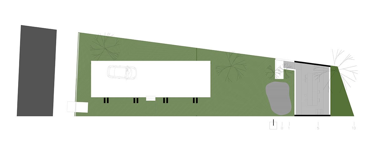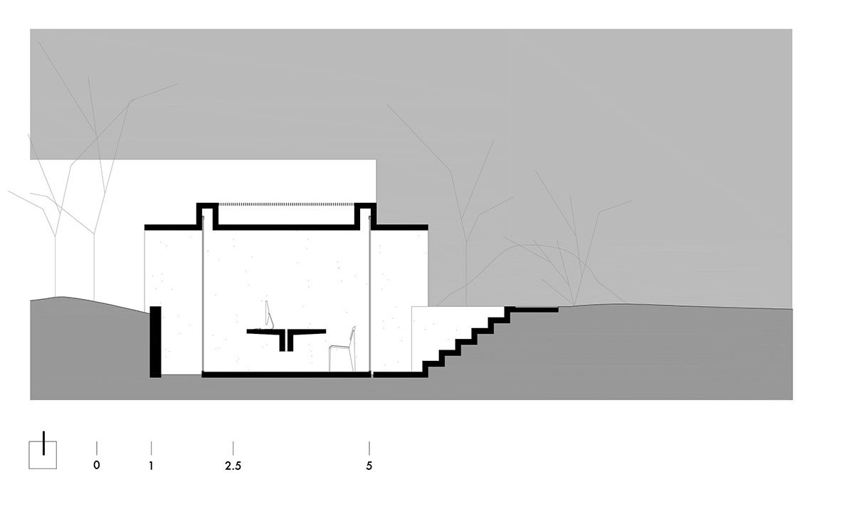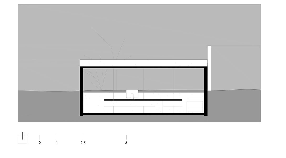 This way, an 7×5 excavation. An absolute connection with the landscape. A 5 centimeters concrete plane that folds generates inertia and because of an absolutely elemental reasoning, a plate becomes a structural support. Everything else is anecdotic.