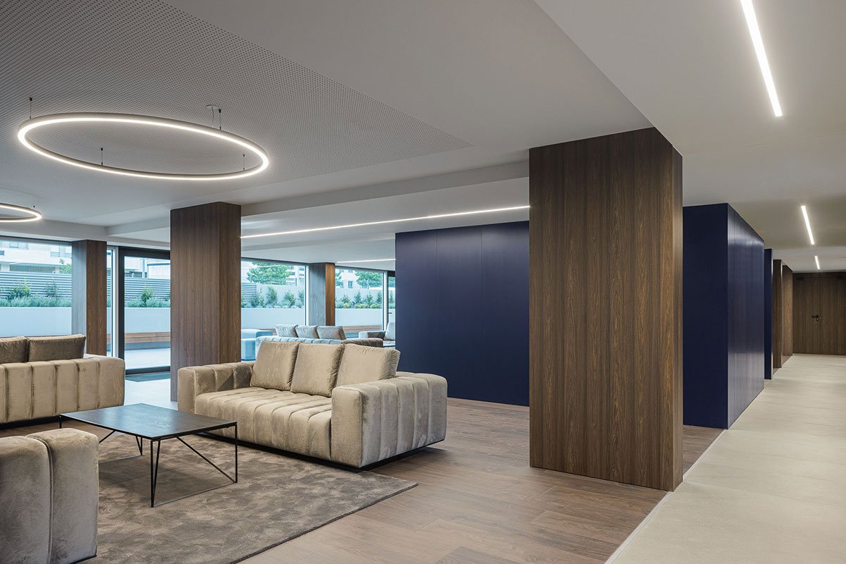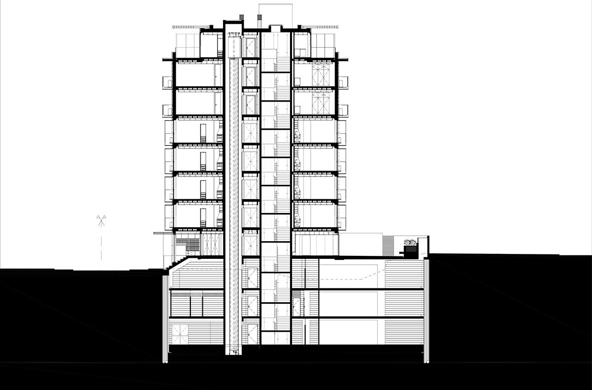 The implantation of the building occupies the entire land with its 3 underground floors intended for the parking program with a capacity of 206 spaces. Above ground the building consists of 8 floors with a front of 90.00m by 17.60m in depth. A large central atrium guarantees the main access to the building, which inside is served by 3 vertical distribution cores.