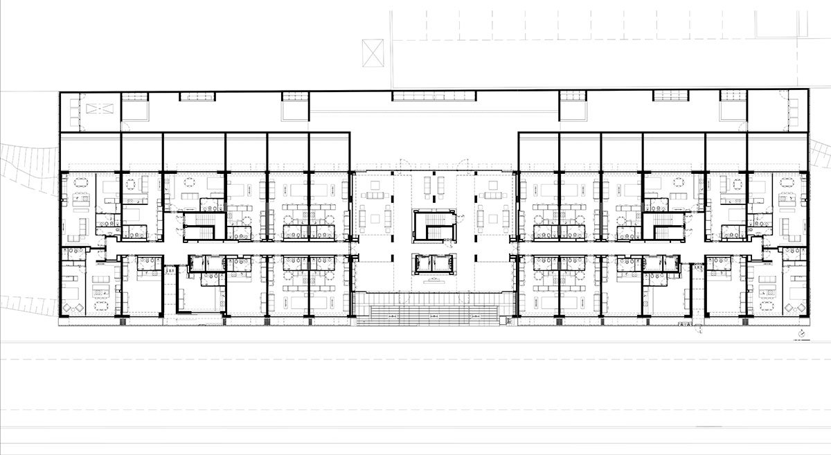 The program is only dedicated to housing and it consists of 170 apartments, divided into the following typologies, 100 T0, 28 T1, 24 T2 and 18 T3. On the outside, the building is clad in a ventilated facade system with aluminum composite in a combination of 3 colors.
