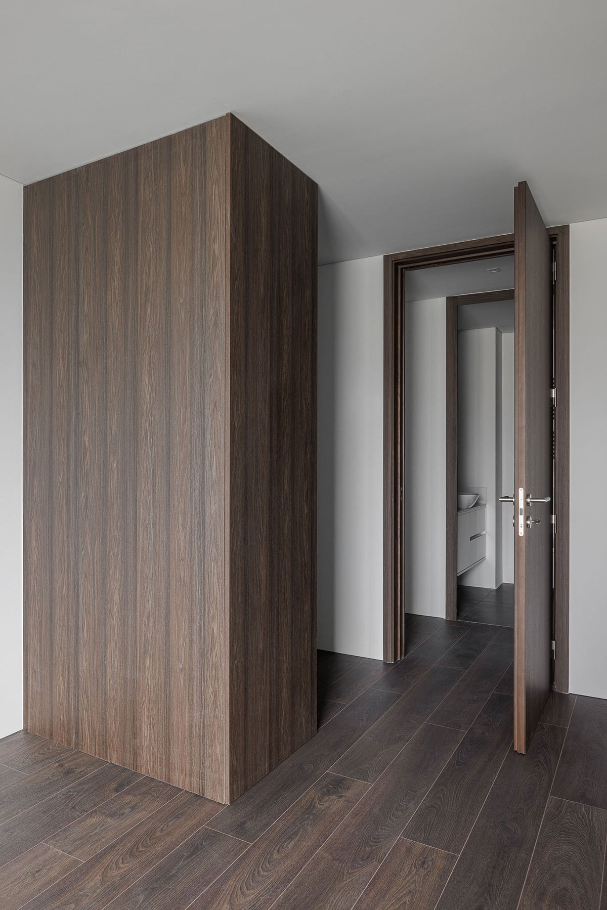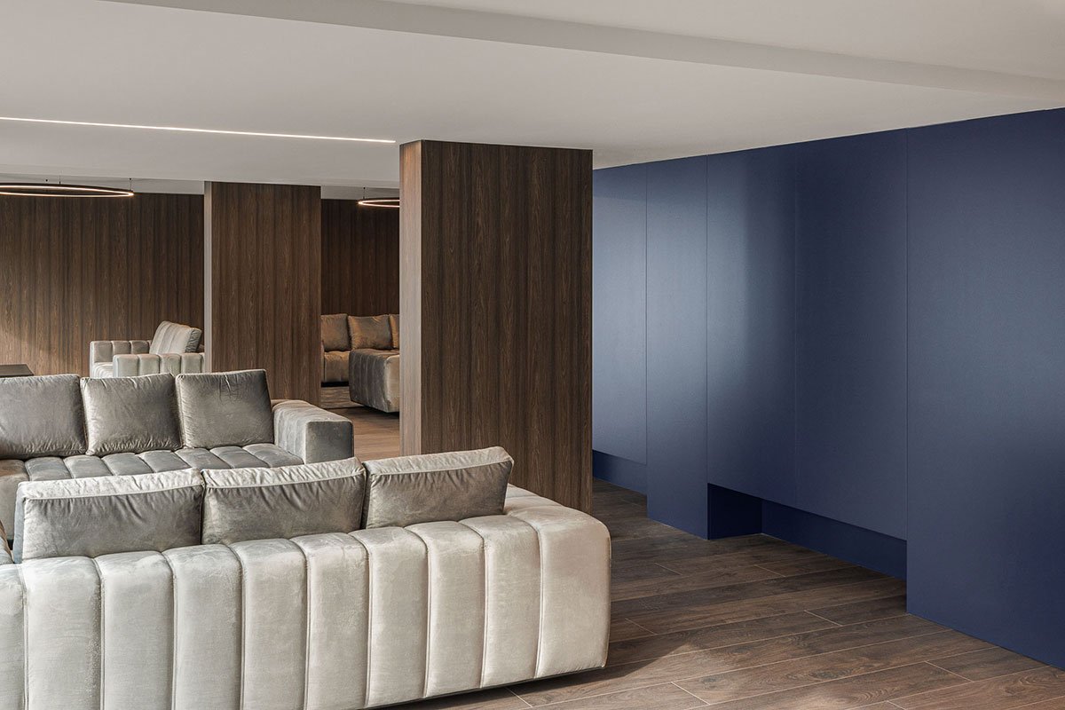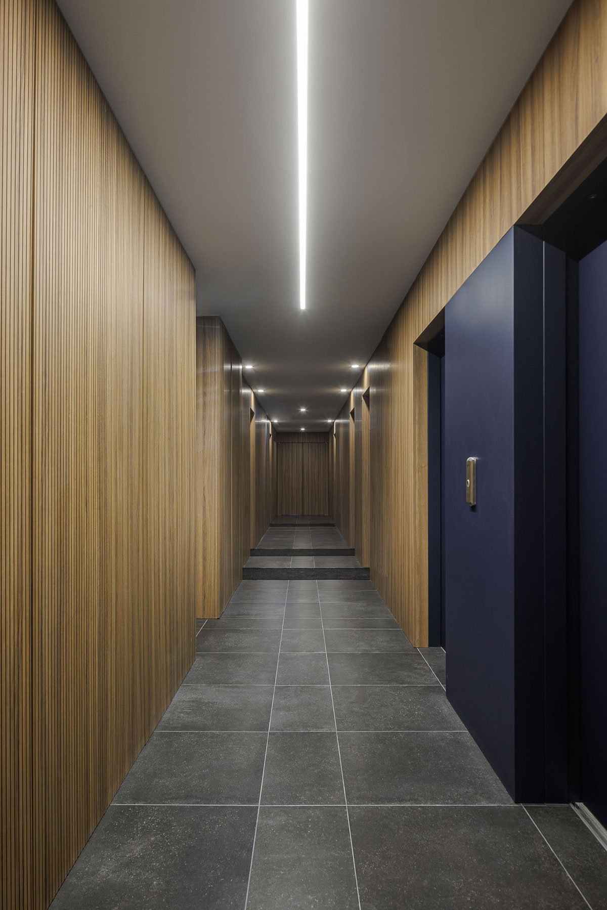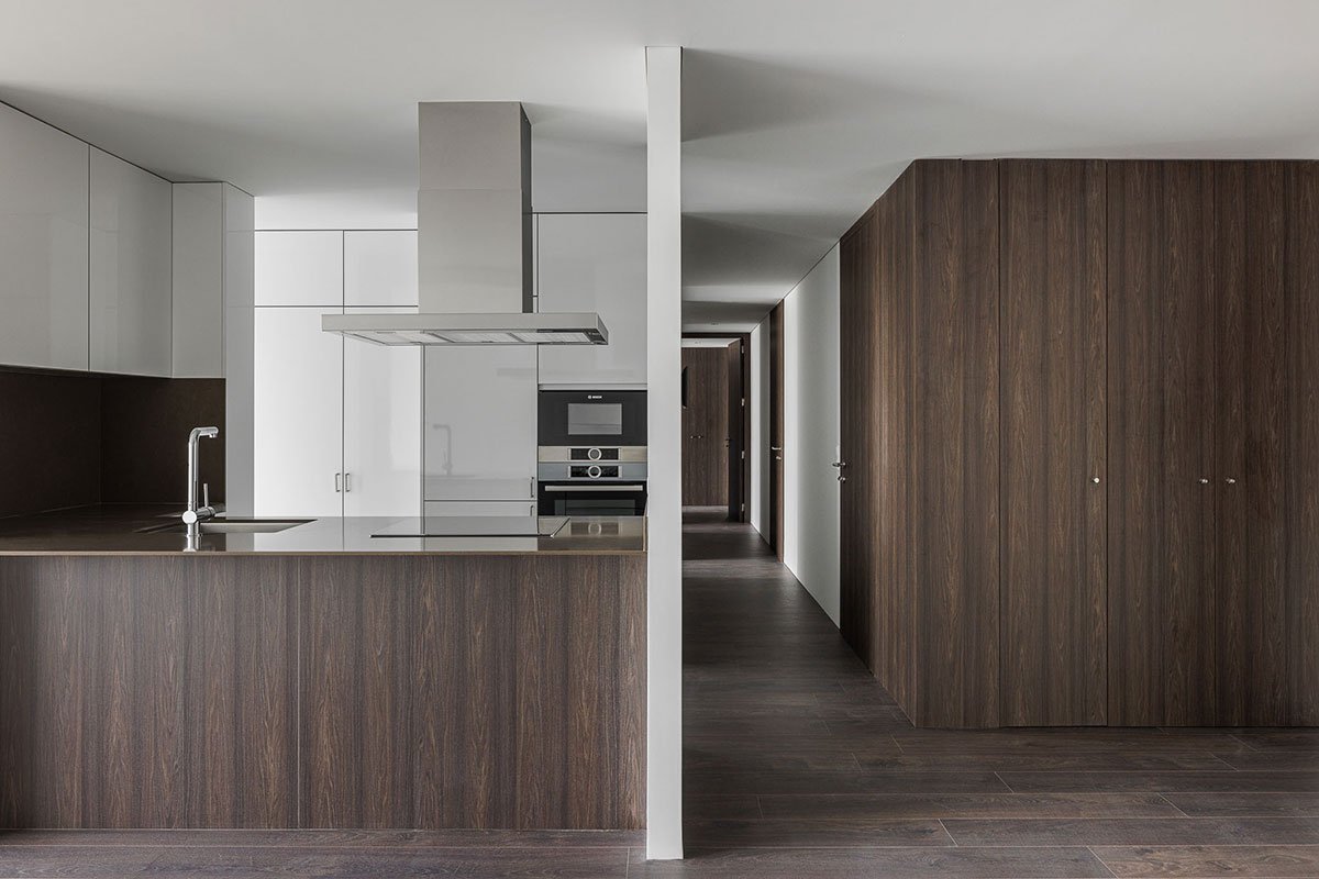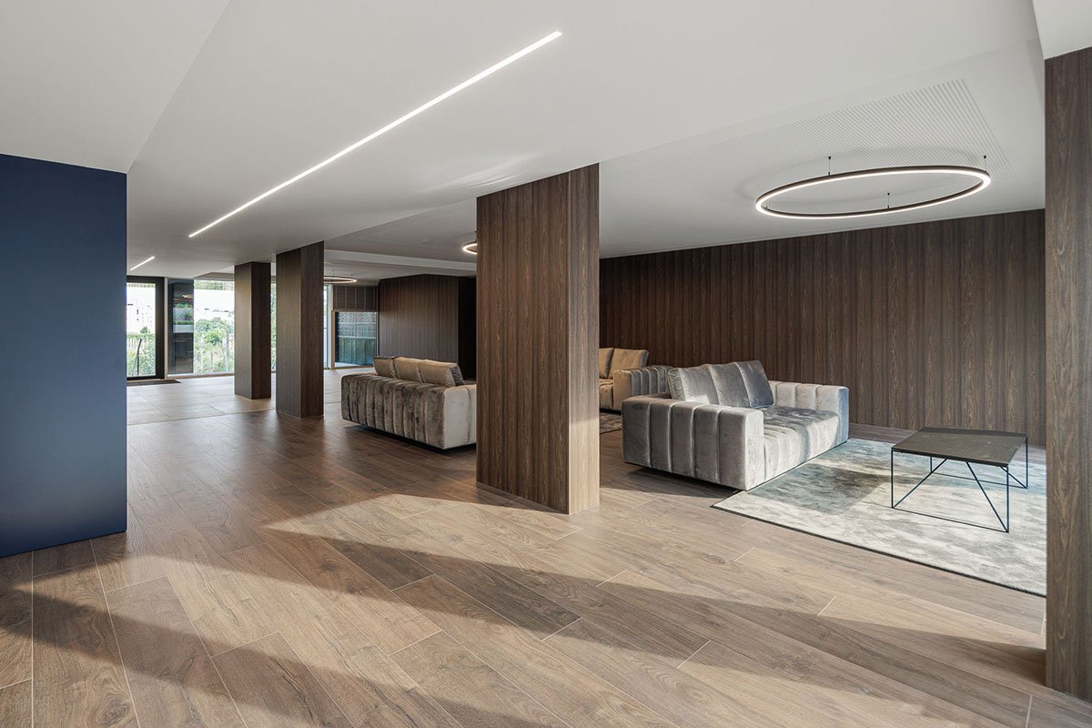 The entire façade follows a regular, vertical and horizontal matrix composition, where the exterior spans are inserted. The use of balconies and “boxes” for the installation of outdoor AC units, enliven the facade and add rhythm and three-dimensionality.