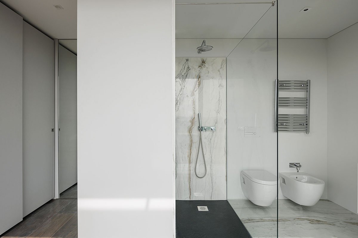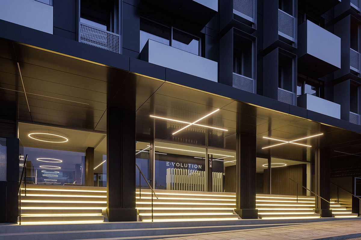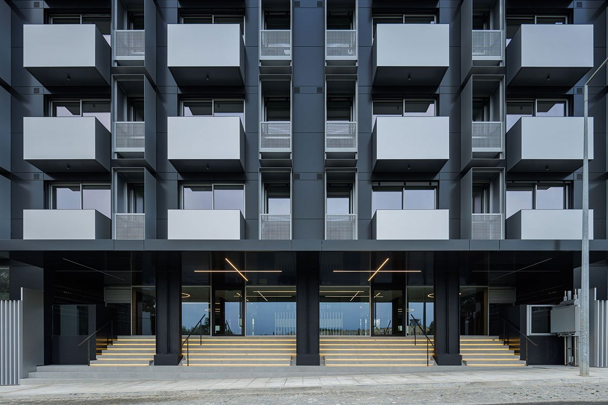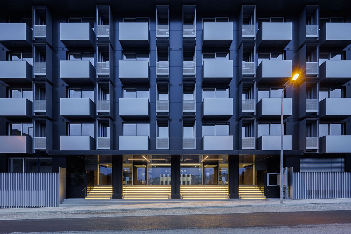 Excerpt: Evolution Apartments Housing by António Paulo Marques, Arquiteto e Associados, Lda features a rectangular configuration with a large central atrium, 3 vertical distribution cores, and 170 apartments. The building features a ventilated facade system following a regular, vertical, and horizontal matrix composition. The use of balconies and “boxes” adds rhythm and three-dimensionality to the facade.