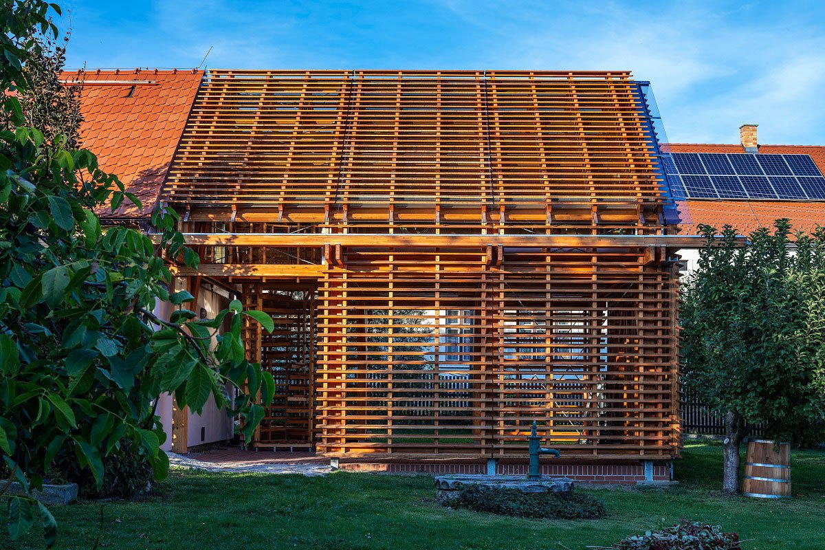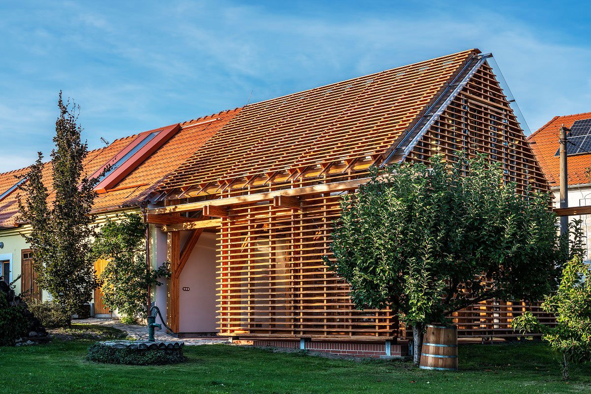 [Text as submitted by architect] To the old farm in southern Bohemia, the investor wanted space for rest and relaxation – the observatory and the observatory. We extended the mass of one wing of the farm with a semi-transparent wooden structure made of spruce and larch. In the basic shape concept, the extension is a harmonious continuation of the original farm, but in the structure and construction, it is a contrasting transparent wooden building with a Zen atmosphere.