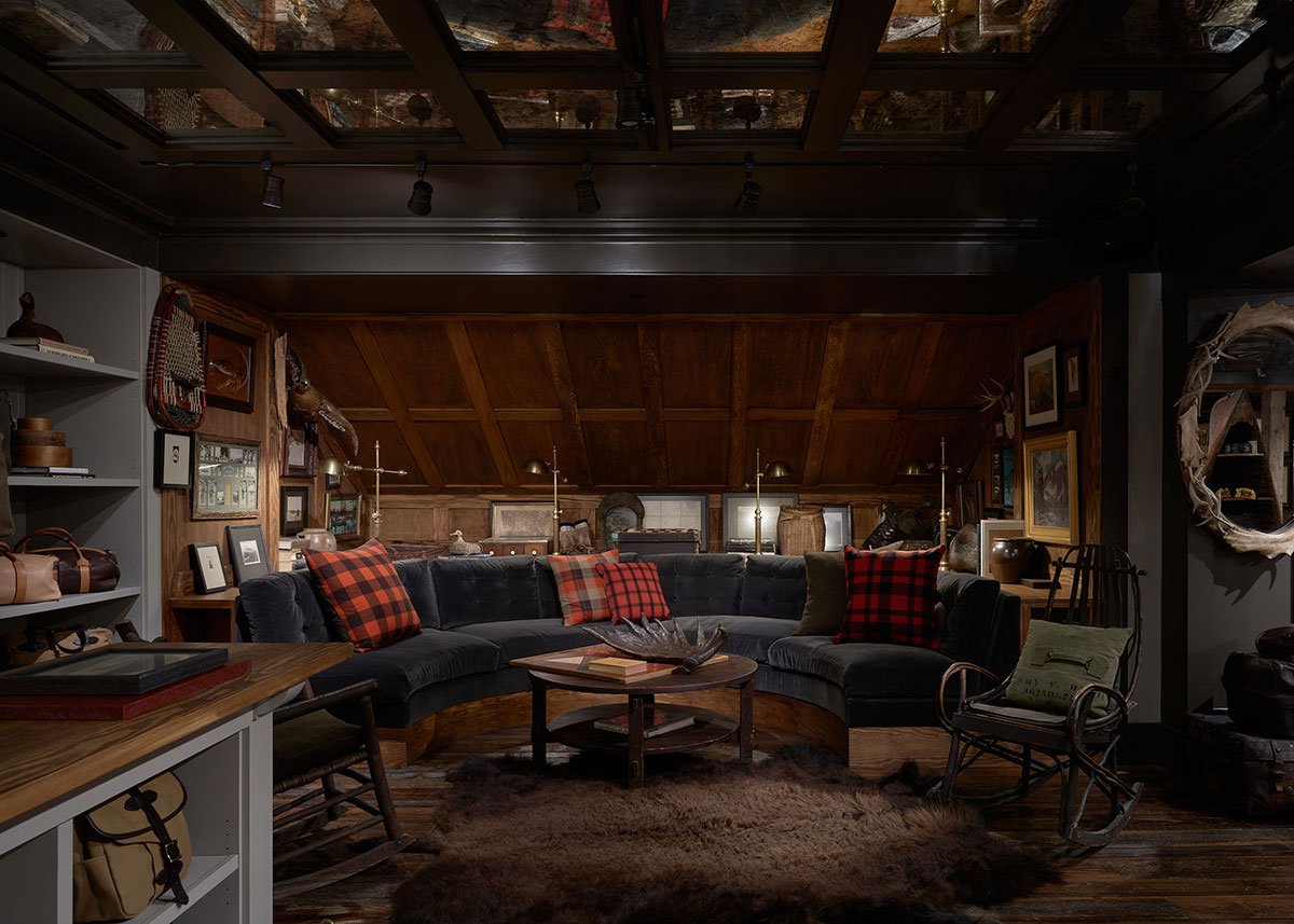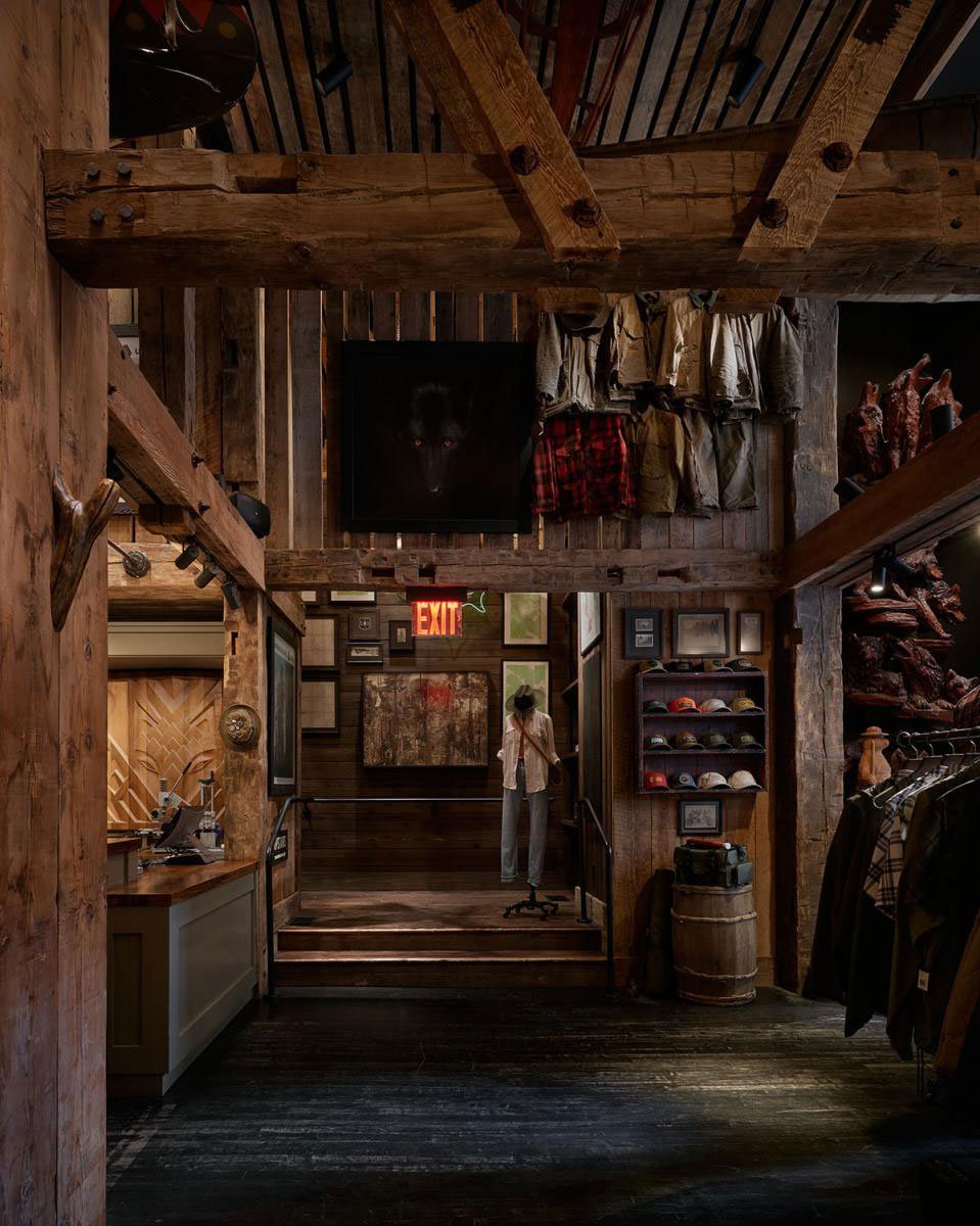 Inside this “barn” we built custom, solid fir and painted wood display cabinets to showcase the men’s product lines, and mounted to the post-and-beam salvaged wood structure above, a gallery of artifacts, hunting decoys, canoe shells, logging equipment, vintage images and maps, that evoke the qualities of a Darius Kinsey photograph. The women’s product line is located on the mezzanine overlooking the “barn,” and is conceived of as the sitting room of an old house. A half-round, built-in, sofa and big round chunky wood coffee table piled with books provides a moment of shopping respite. The mezzanine ceilings are coffered in painted wood and smoked mirror glass. The floors are salvaged pine from York, Pennsylvania.