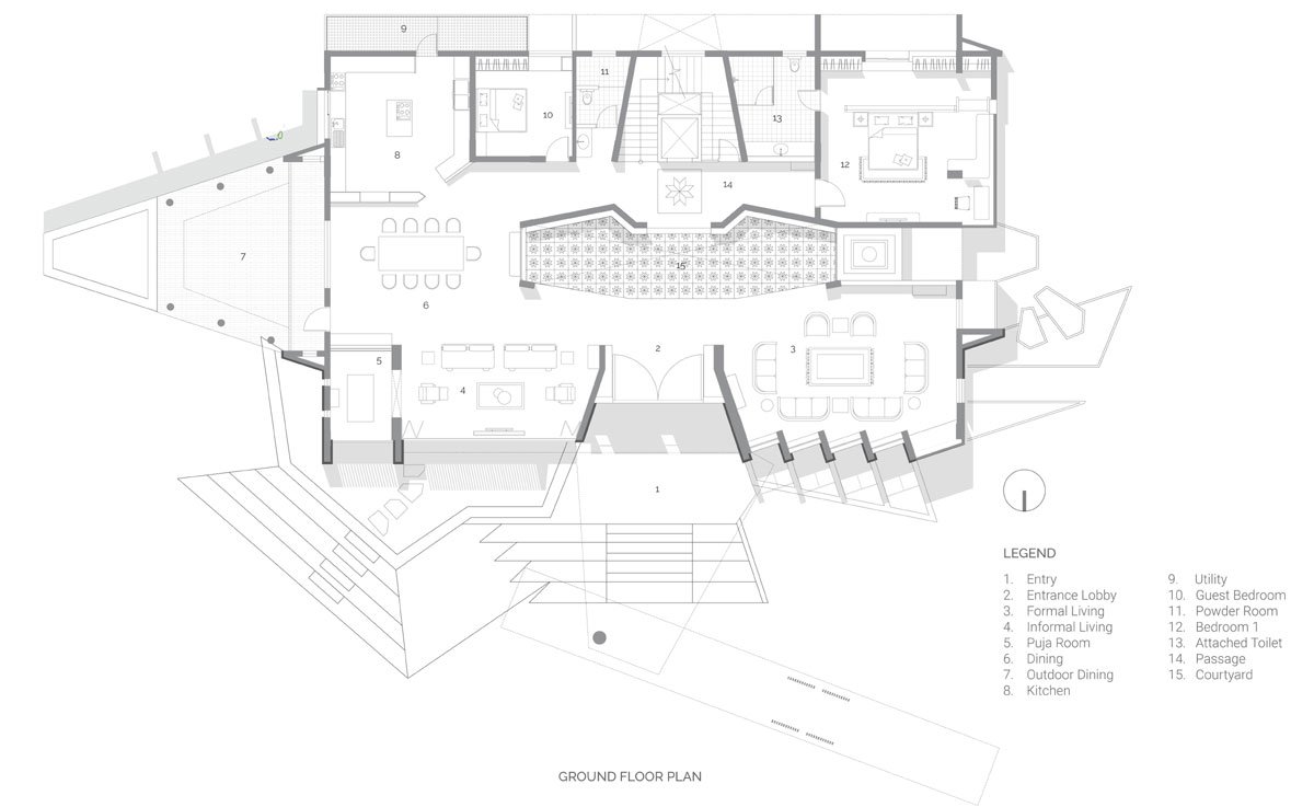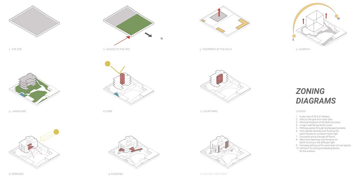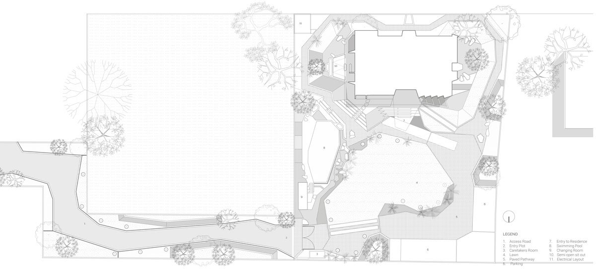[Text as submitted by architect] The bungalow is situated in the busy city area enveloping the landscape around it. Though the plot is surrounded by the open garden on one side and high-rise buildings on other sides the orientation of the plot is such that the garden area and north light to the main habitable spaces are in shade during the day. The cascading terraces create shadows for spill-over activities. The kitchen is on the east and the bedrooms are placed on the south-west for benefit of prevailing wind direction.