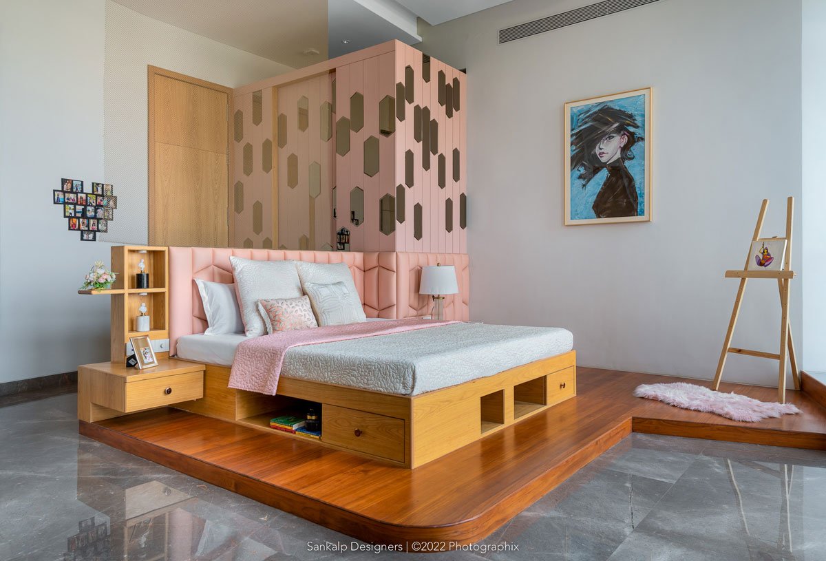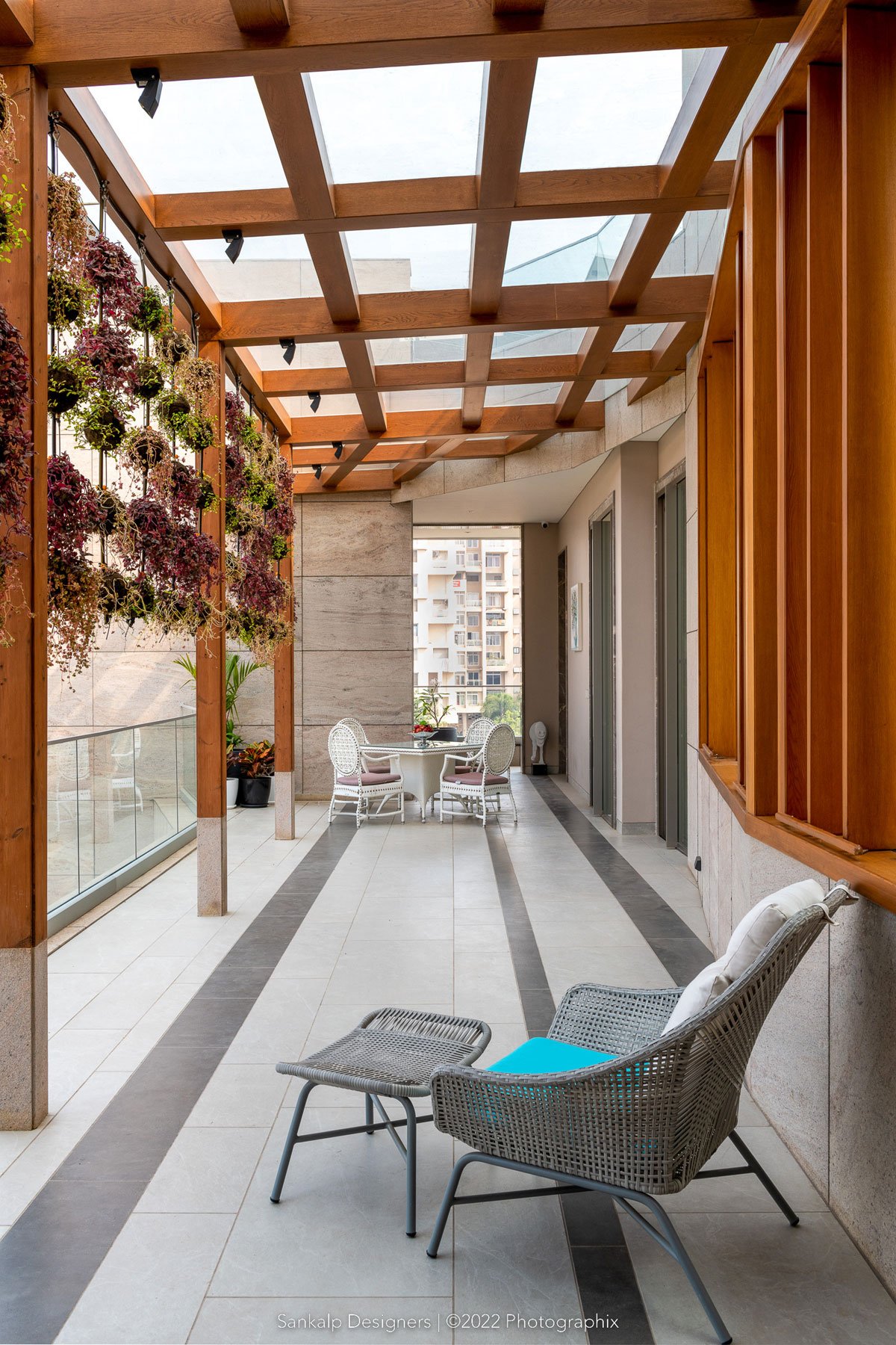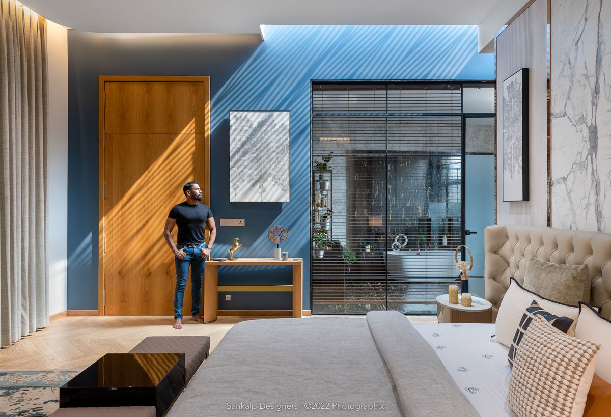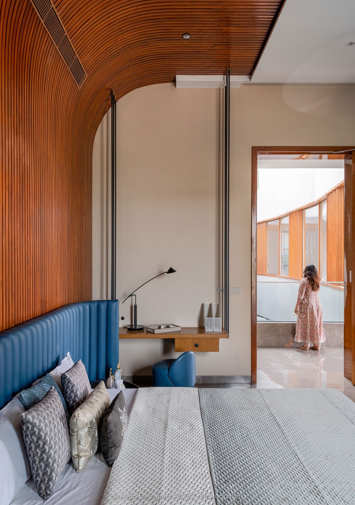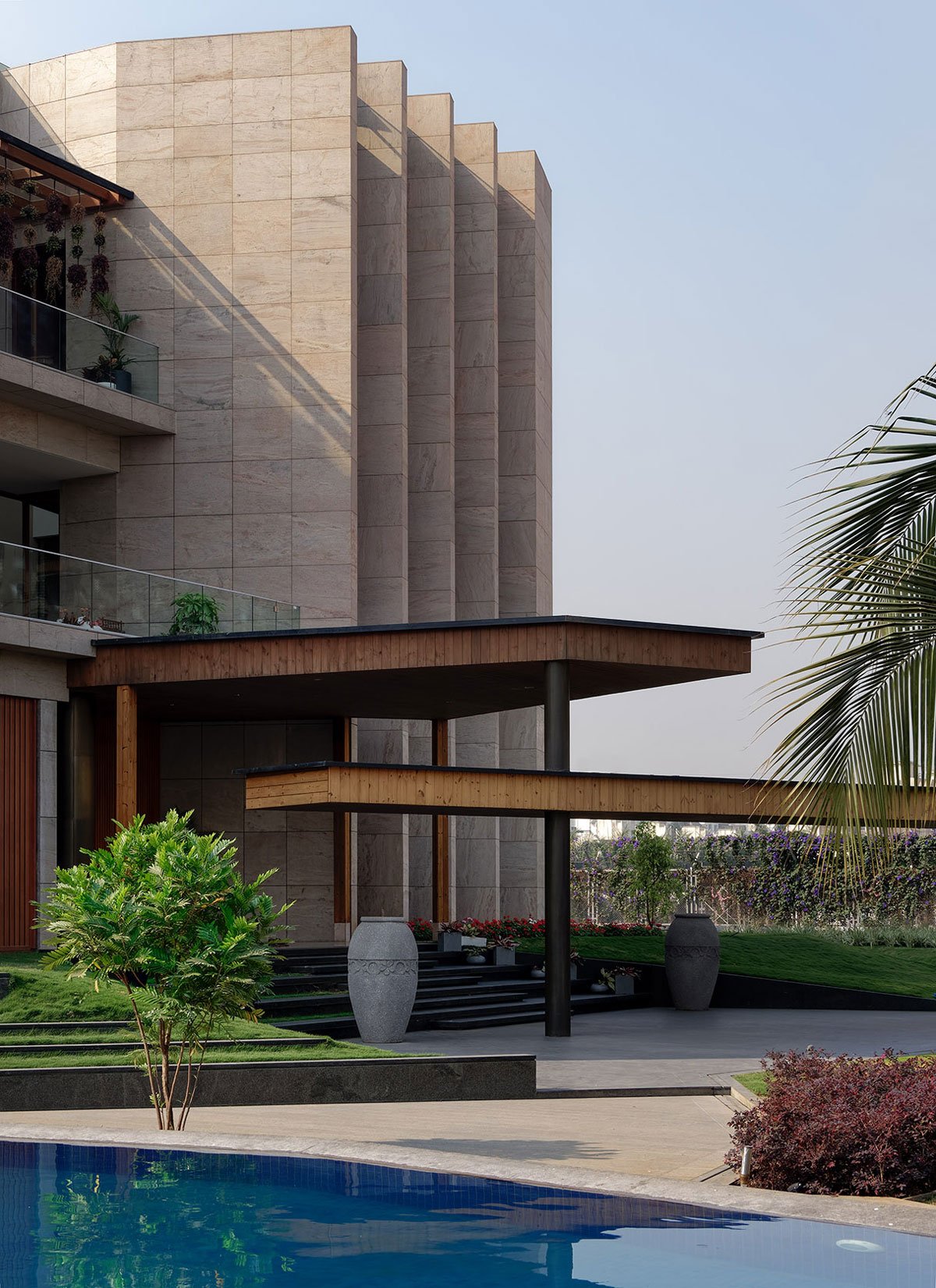 Open courtyard in the center connects all the floors. Through the tilted massive fins, the filtered light enters the living room area at all times during the day. The interior is a confluence of varied refined details from traditional arches, marvelous massive stone cladding, transitioning to Neoclassical style of living and warmth of wooden paneling of family room to the marbled flooring. Infused with distinctive materials, bold colors, customized rugs, curtains, the home speaks volumes about and is a testimony of the beauty in diversity of design style.
