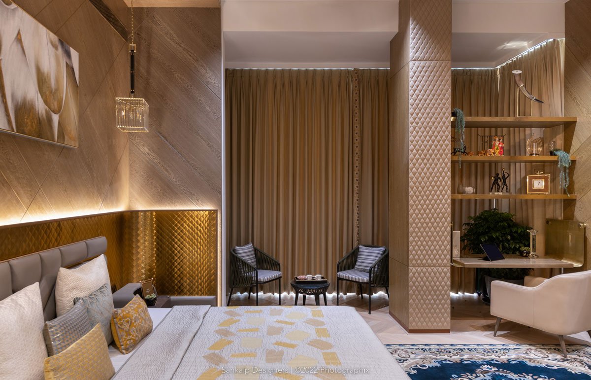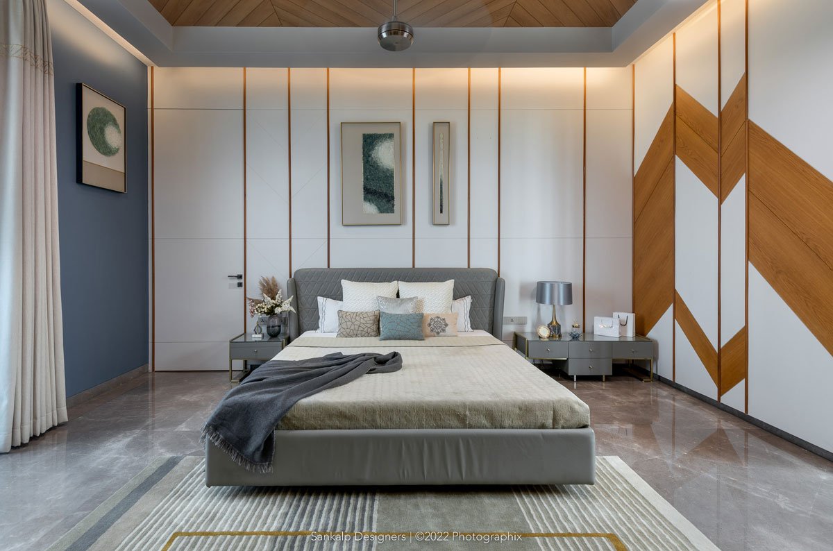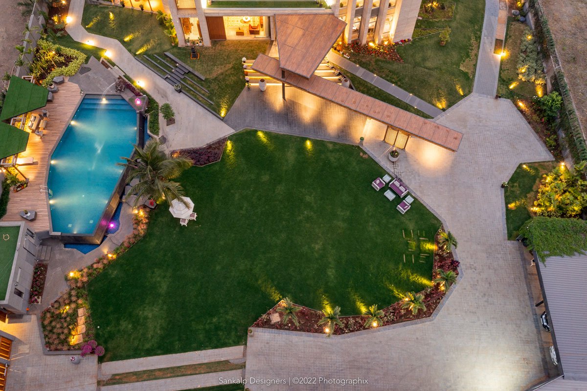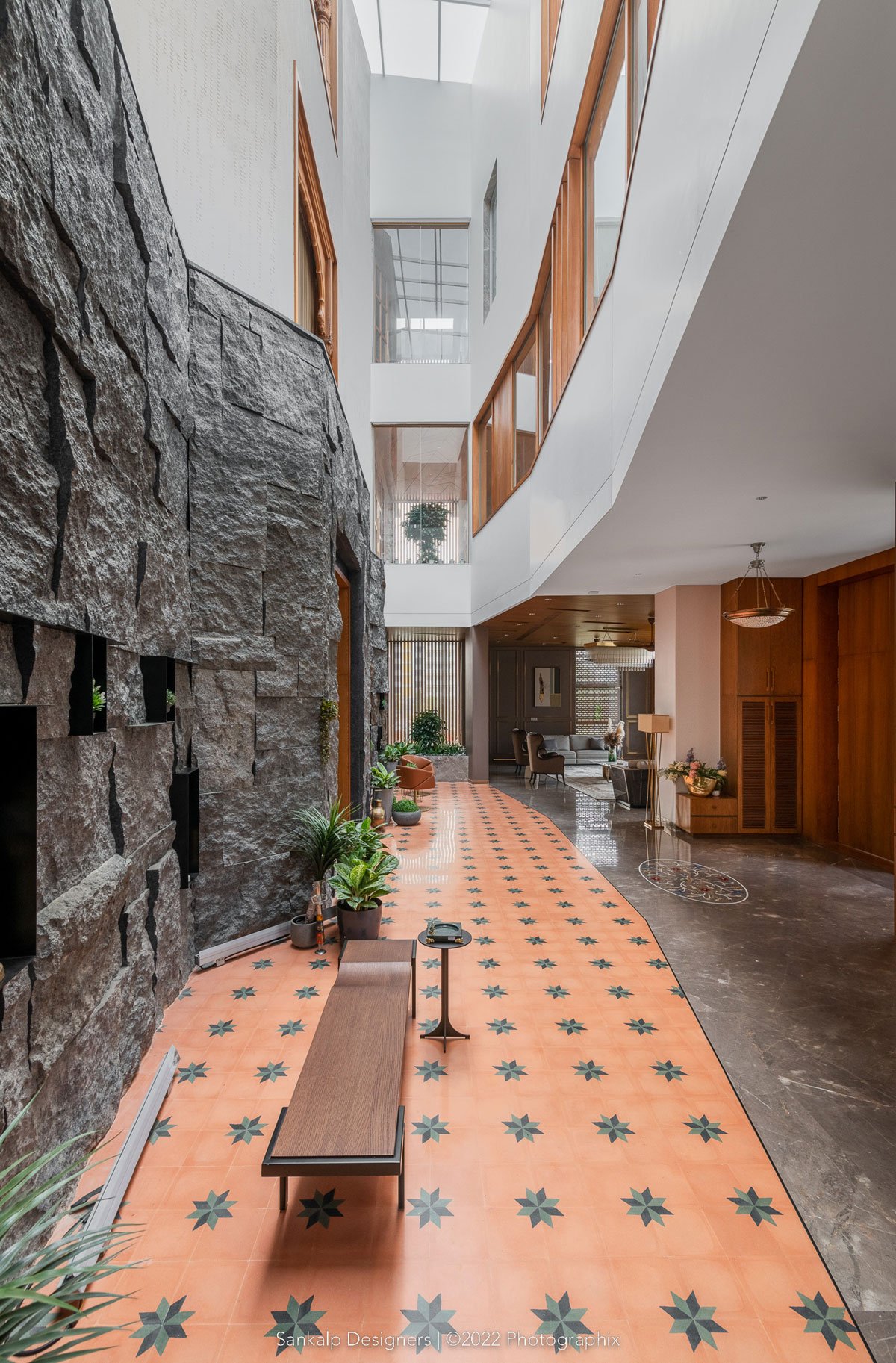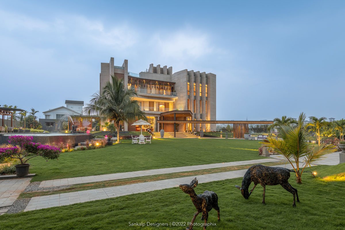 Excerpt: Finz House by Sankalp Designers is a project that majestically dominates and embraces the surrounding landscape, blurring the lines between indoor and outdoor spaces. An open courtyard in the center connects all the floors. The interior features refined details like traditional arches, massive stone cladding, Neoclassical living style, wooden paneling in the family room, and marbled flooring.