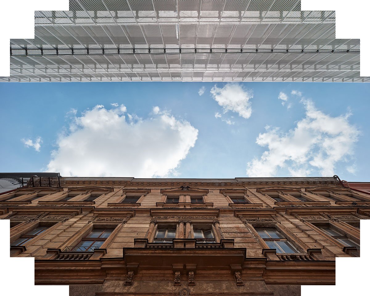 The design process followed the same logic. The new building mass relates directly to the site boundary. The boundary line is confirmed and underlined when the building reaches the line of the old block, or it’s softened when the building steps back, easing off street fronts or corners. A top-floor setback reduces the perceived height, finding a balance and a new dynamic in the wider context. The program has two parts that both fit the locality and the demanding environment. Ground-floor shopping was finally introduced to the area, together with offices, which were unavoidable due to the heavy traffic on Svornosti Street.