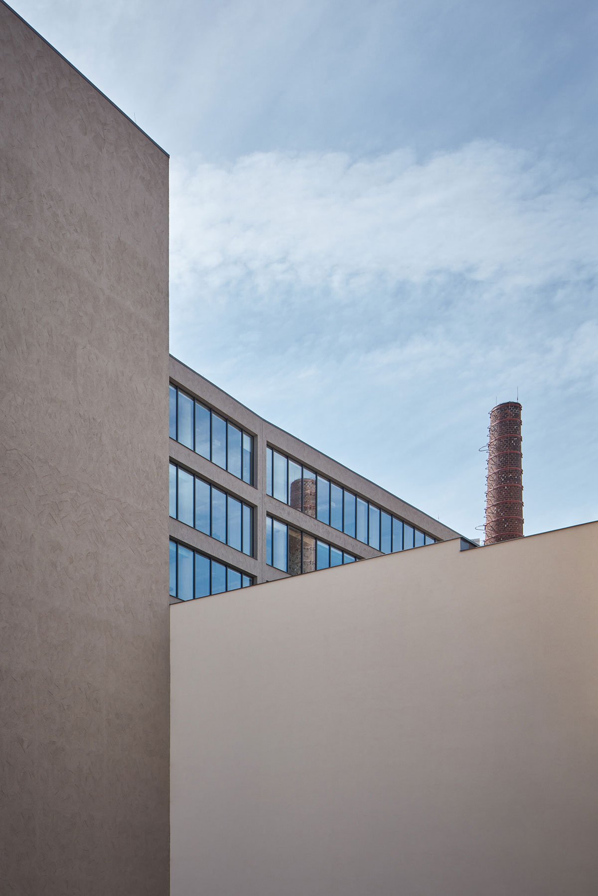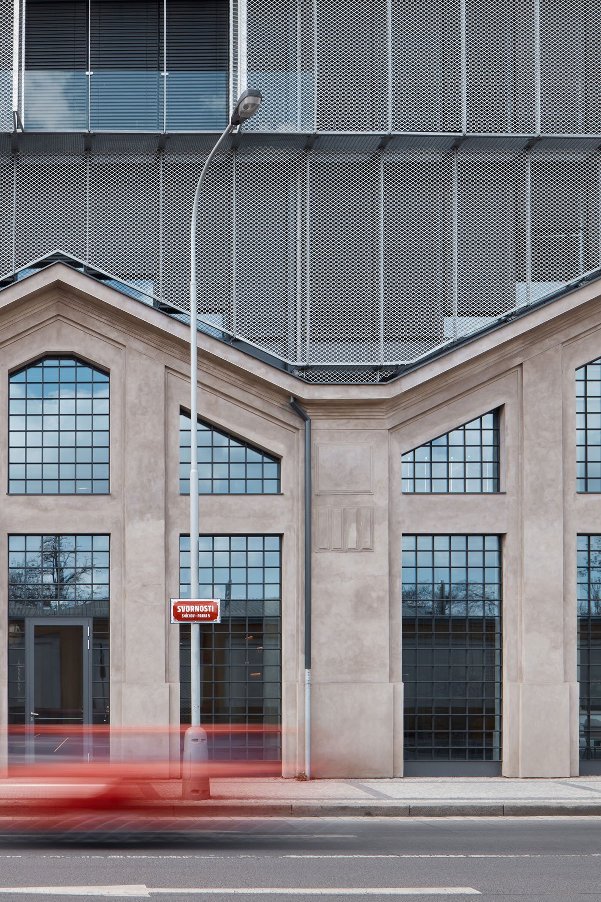 [Text as submitted by architect] History meets future,“ declares the fitting motto chosen for Project Five, located in Prague 5 – Smíchov. A tram depot building occupied the project site, but that could have been called a relic even when it was built. While forming a critical endpoint in the city transport system, complicated access had been its disadvantage right from the beginning. The depot building still looked almost exactly like when it was closed, years later when current renovations began. Previously it had proved too difficult to adapt to new use, so it remained in a sort of permanent provisional state.