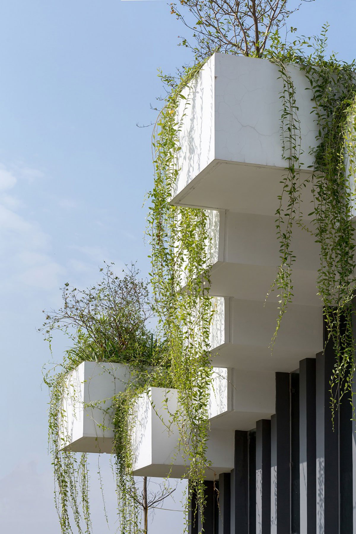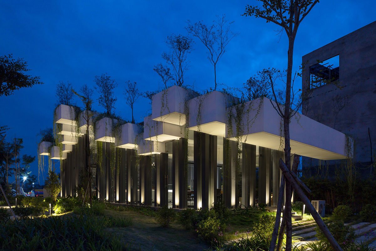 Bac Giang is mountain and Midland area of Vietnam. The architects approached, surveyed the project geography and they realized the inspiration from the curves created by the mountains and clouds here. And they created this combination by planting boxes. During the day the boxes will create the shape of the hills, but in the evening when combined with light, the boxes will create an image of the clouds.