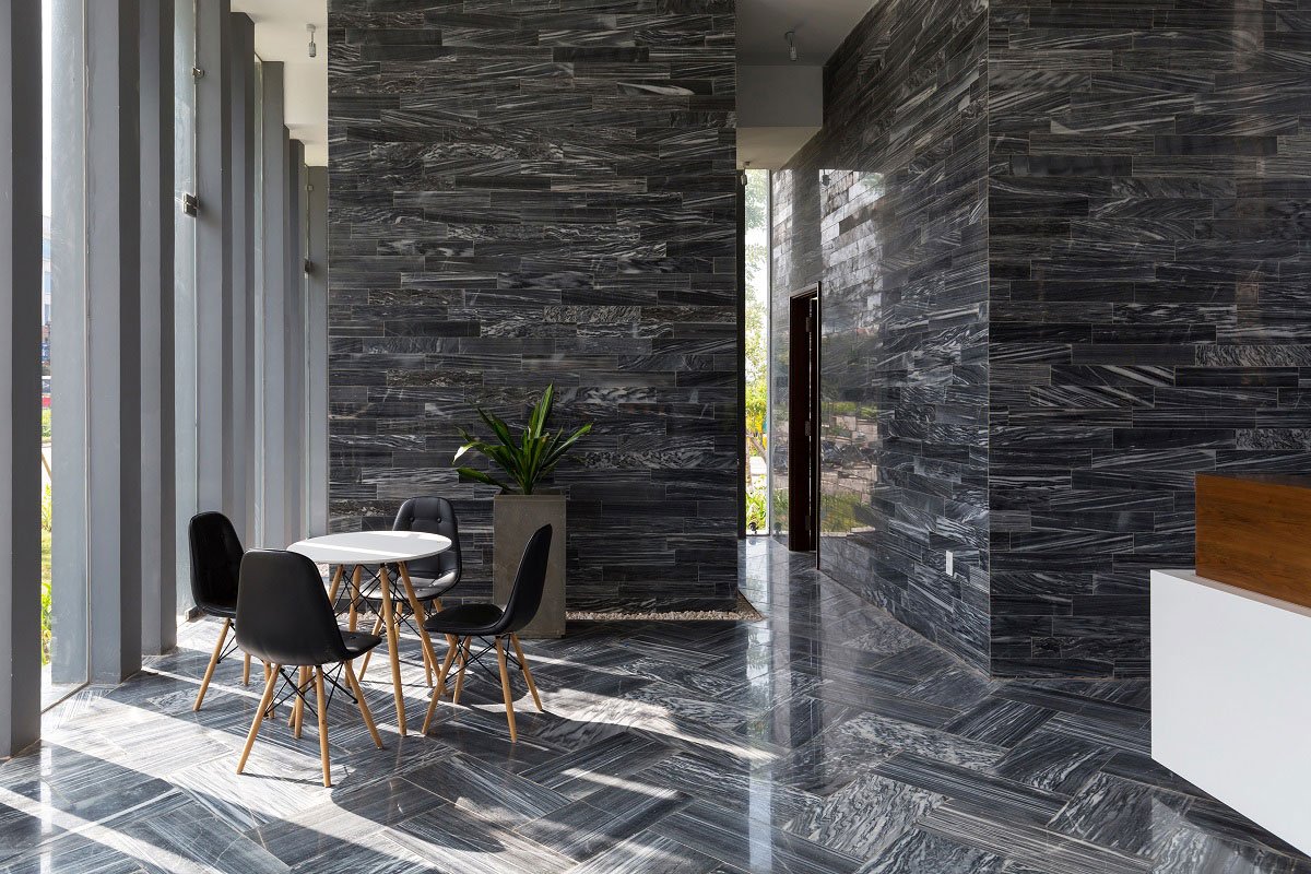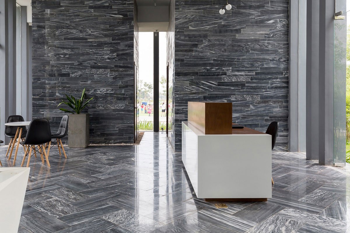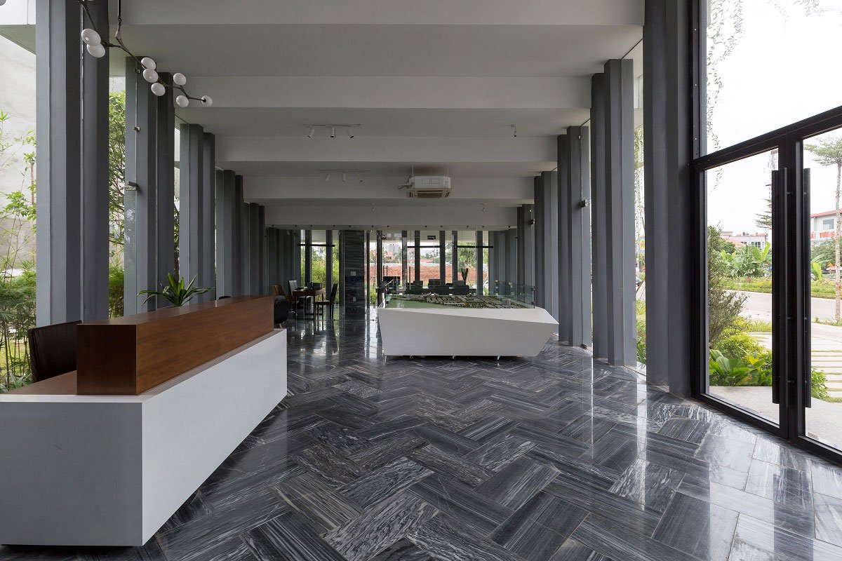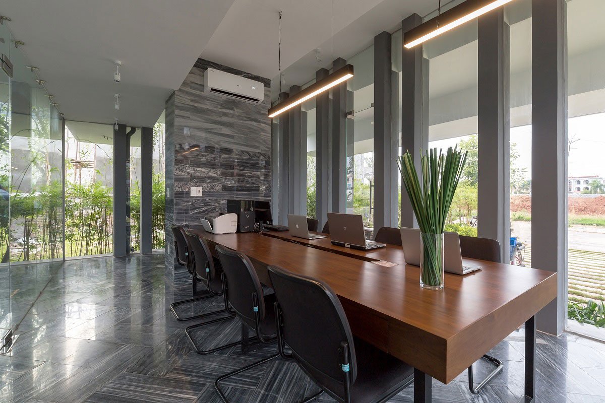 Inside is the reception and the area showcases the miniature urban model. The space of the exhibit is almost entirely opened by the glass to create the connection between man and nature. The glass doors divided space to ensure the natural ventilation. The working and operating space are also completely open to nature and the green spaces around to create more energy for the individuals working here. The wall of material is natural stone, combined with the change of height of celling as the terraced fields of the Midland area, creating a unique space for the works.