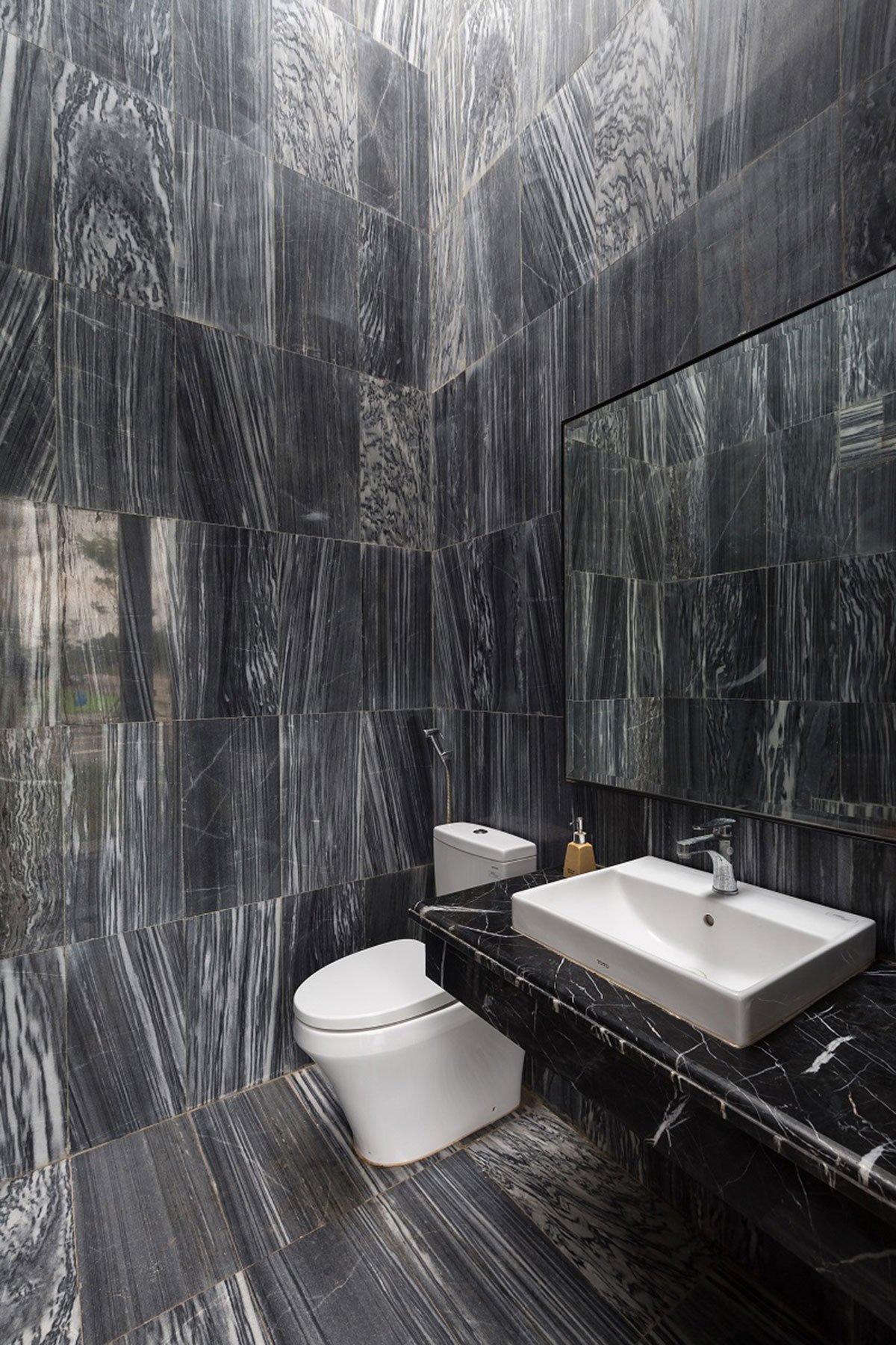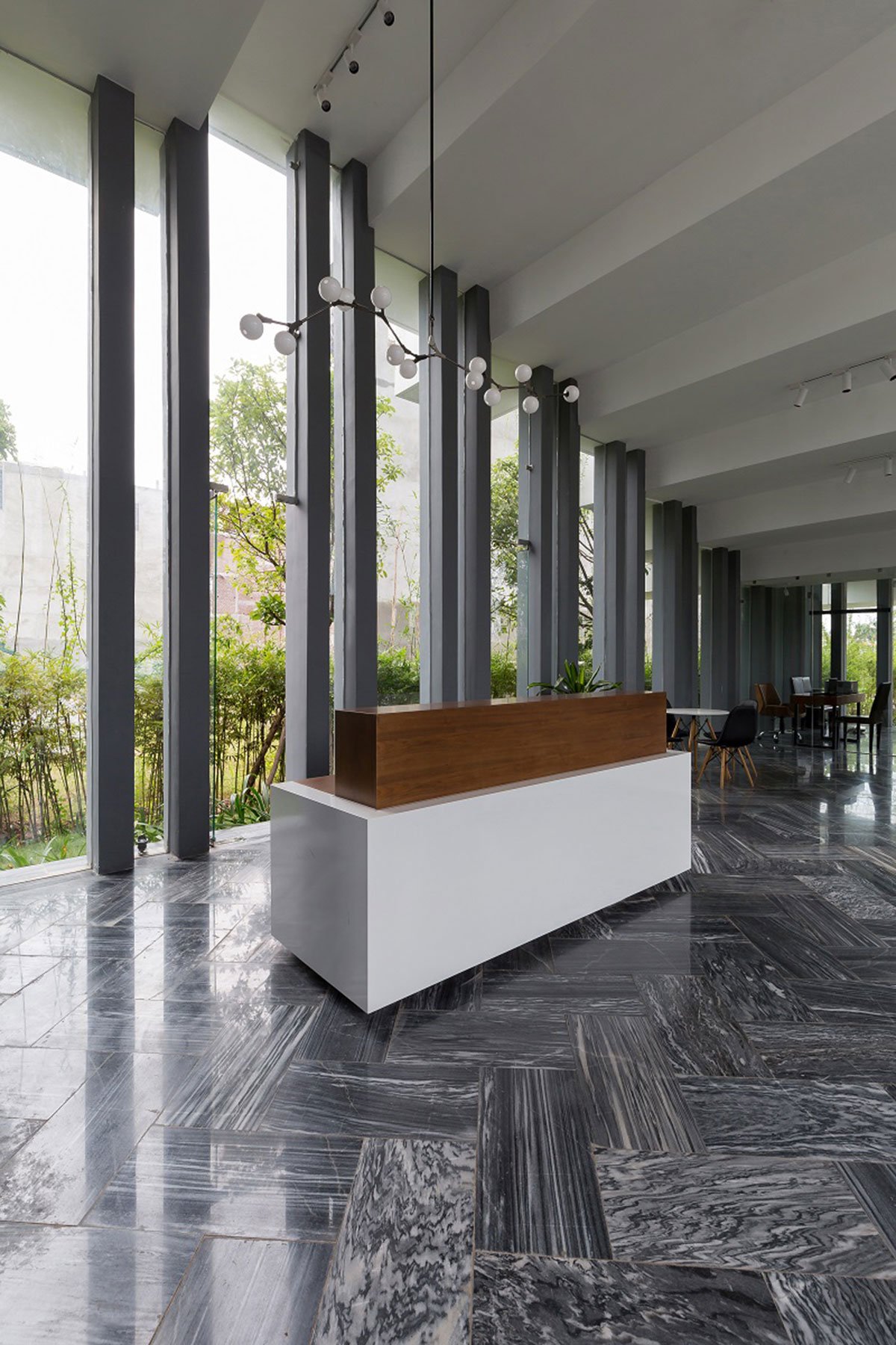 The main façade of the build is east, so the building was affected by the sunshine in the morning and afternoon. So, ARO’s architects have used the method is rotate the main façade of build to the southeast .reduce the amount of light while solving the problem of natural ventilation for the project to reduce the amount of power consumption by air conditioning, to reduce the light, solve the problem of natural ventilation and reduce the power consumption by air conditioning of building . With toilets, natural ventilation and natural light coming from the roof. The landscape is used by architects to create simple gardens and sun protection. The green spaces create a soft and natural approach.