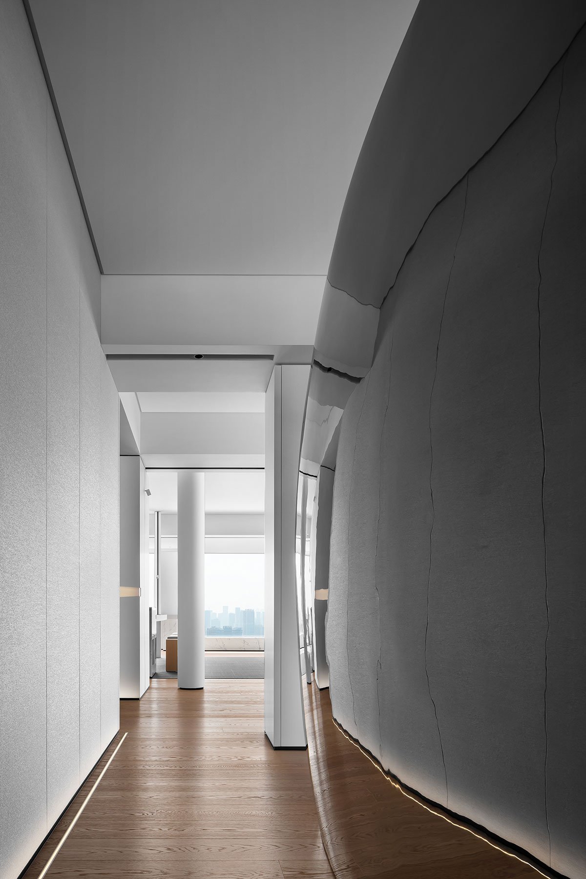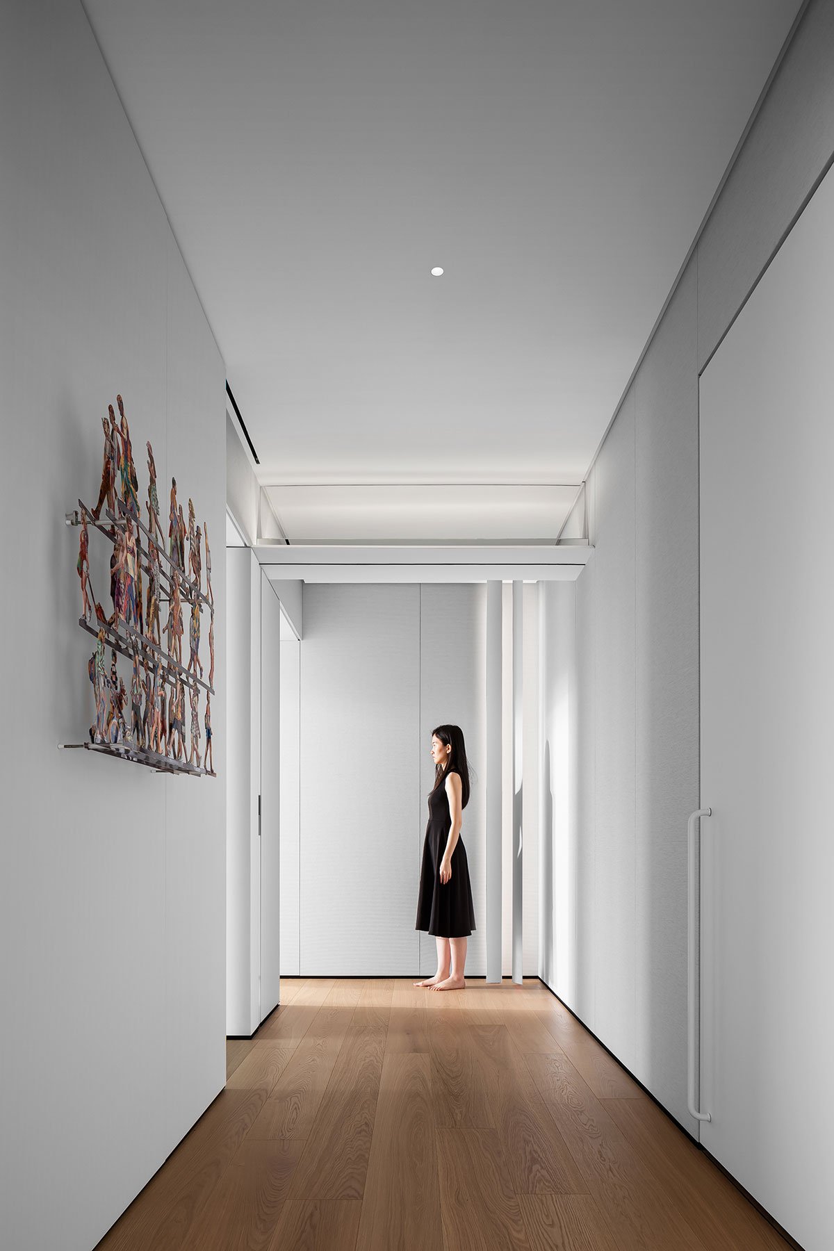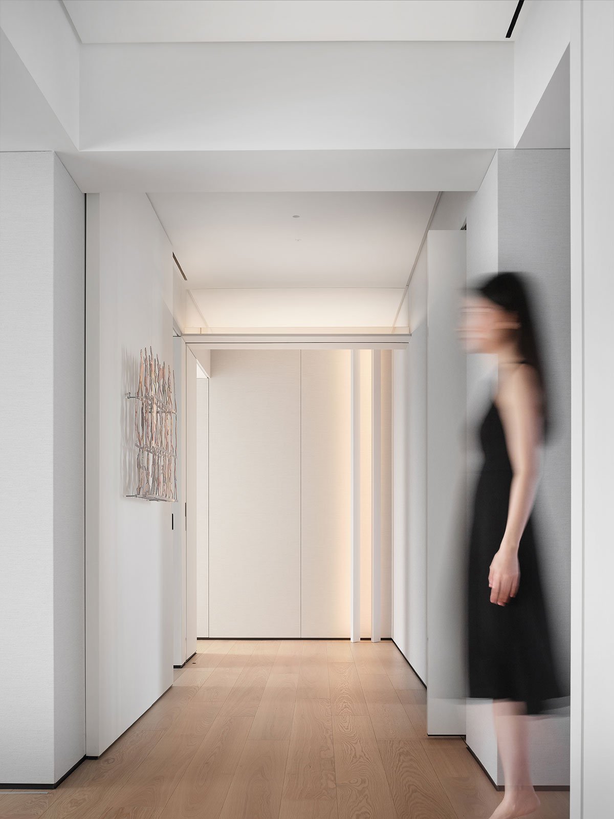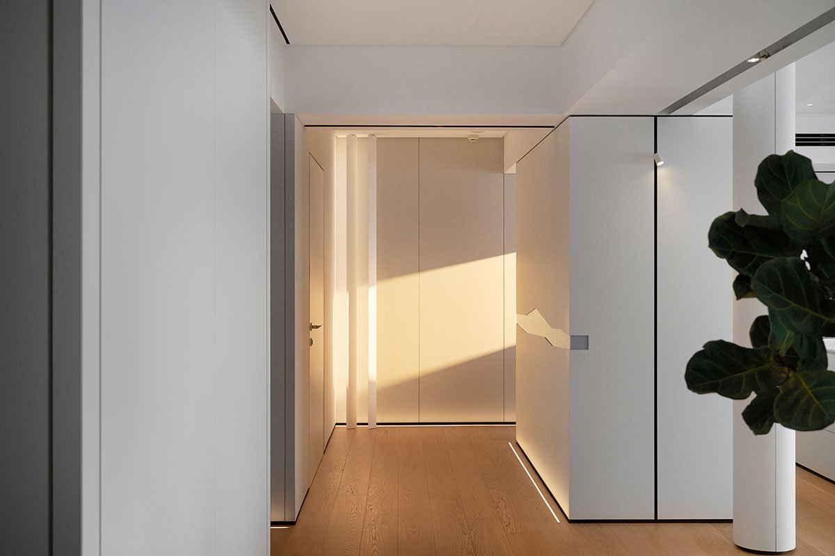Dawn Light: The hallway serves as the initial glimpse upon entering the home, and it plays a crucial role in setting the tone of the space. The wall is adorned with a mountain-patterned installation, while a sensor lighting system adds to the ambiance. As the dawn light filters through, dust particles dance in the air, creating a hazy glow. This phenomenon, known as the Tyndall effect, adds a touch of unparalleled romance to the atmosphere.