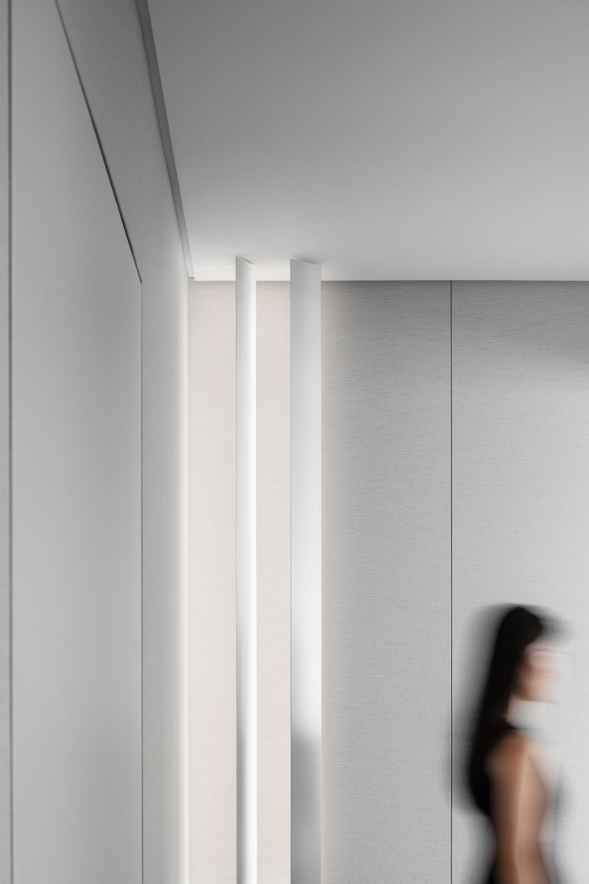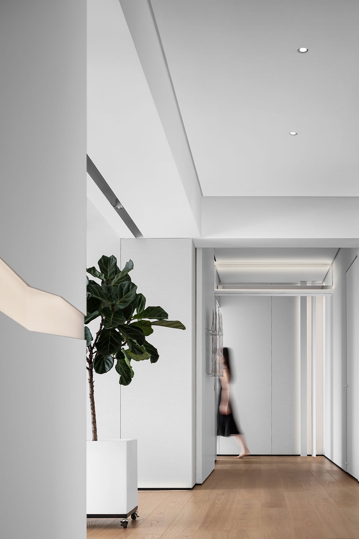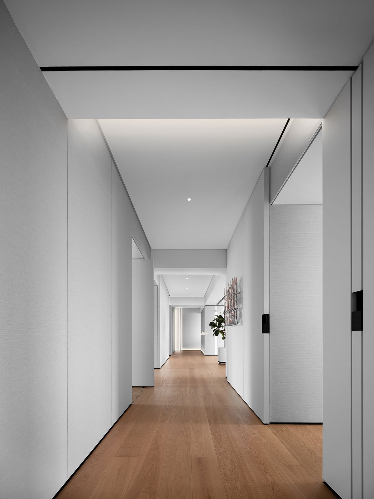 Dawn Light: The hallway serves as the initial glimpse upon entering the home, and it plays a crucial role in setting the tone of the space. The wall is adorned with a mountain-patterned installation, while a sensor lighting system adds to the ambiance. As the dawn light filters through, dust particles dance in the air, creating a hazy glow. This phenomenon, known as the Tyndall effect, adds a touch of unparalleled romance to the atmosphere.