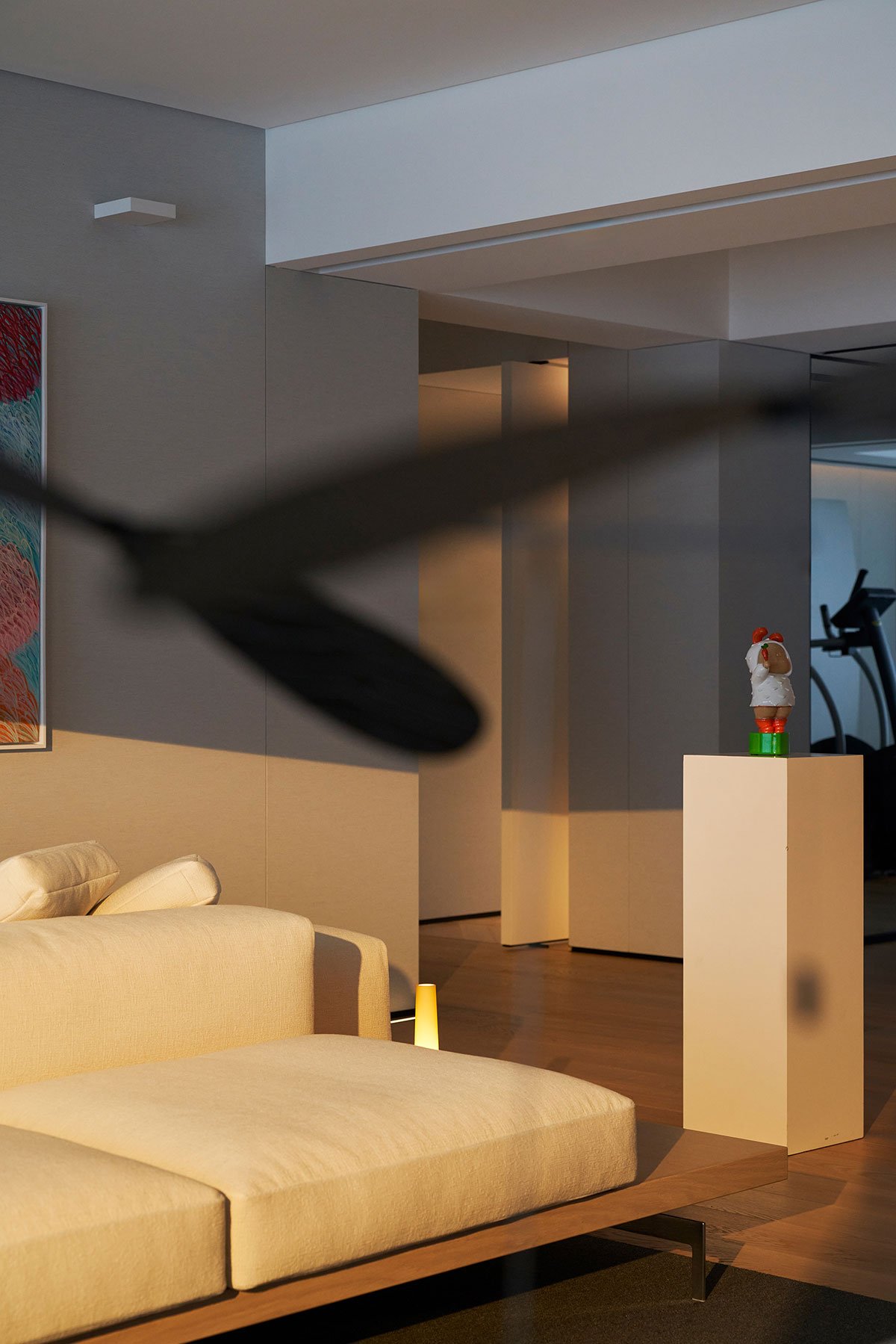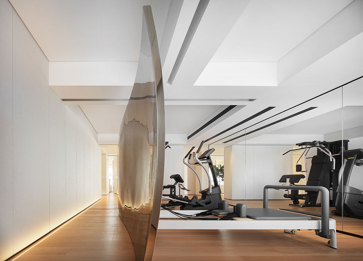 Vibrant Ambiance: The home gym and living room are separated by the wall and sliding doors, effectively creating distinct spaces. The gym features a curved stainless steel art installation that is reflected in the mirror, creating a fantastic visual effect.