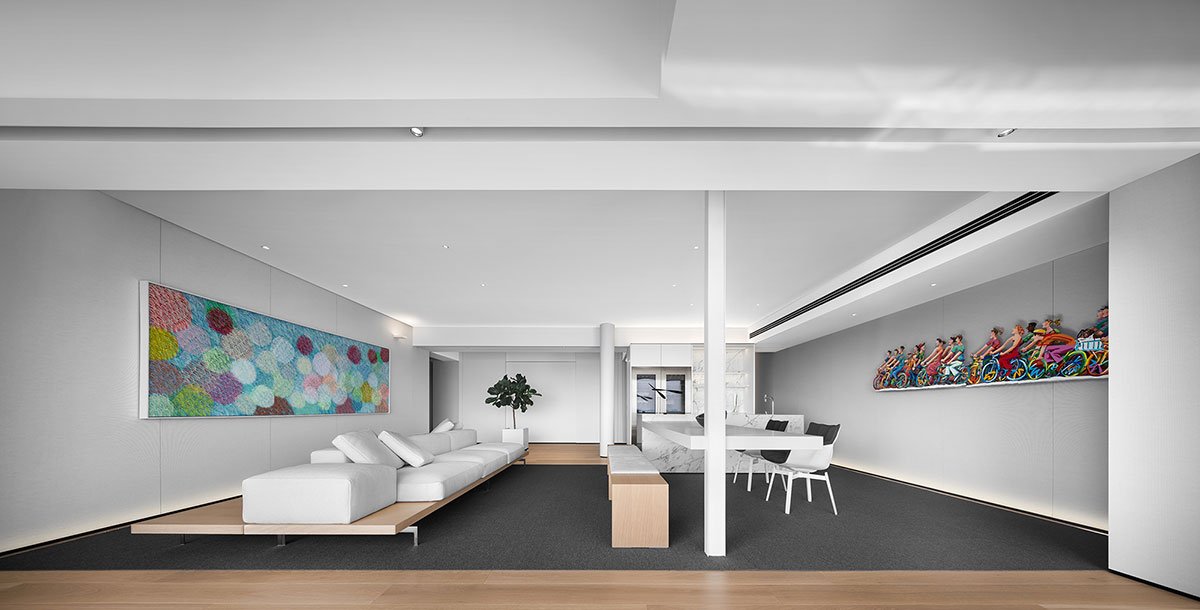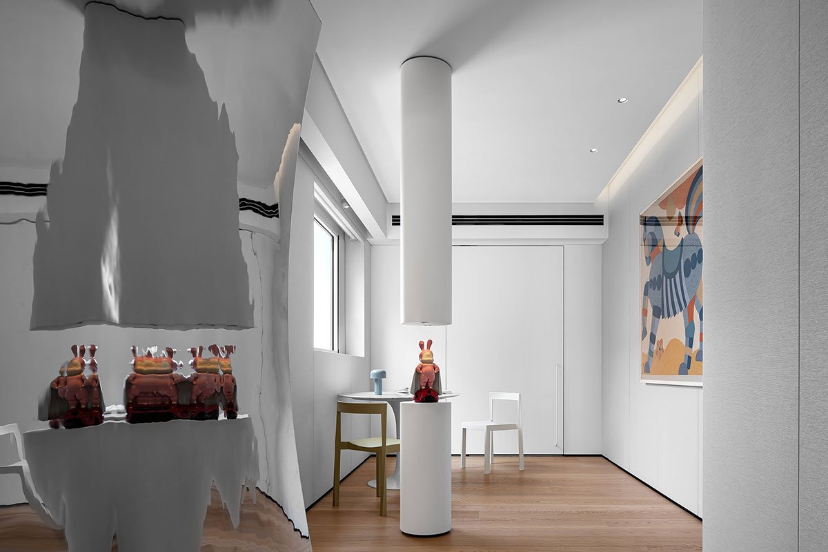 In this 230-square-meter spacious single-floor apartment, the design aims to blur the boundaries between different functional areas. All partition walls have been removed to maximize the introduction of natural sunlight into the interior. The original layout, consisting of 4 bedrooms, 2 living rooms, 1 kitchen, and 4 bathrooms, has been transformed and reorganized into a versatile space that seamlessly integrates socializing, leisure, working, and living. The flexible artistic lifestyle extends infinitely within the space.