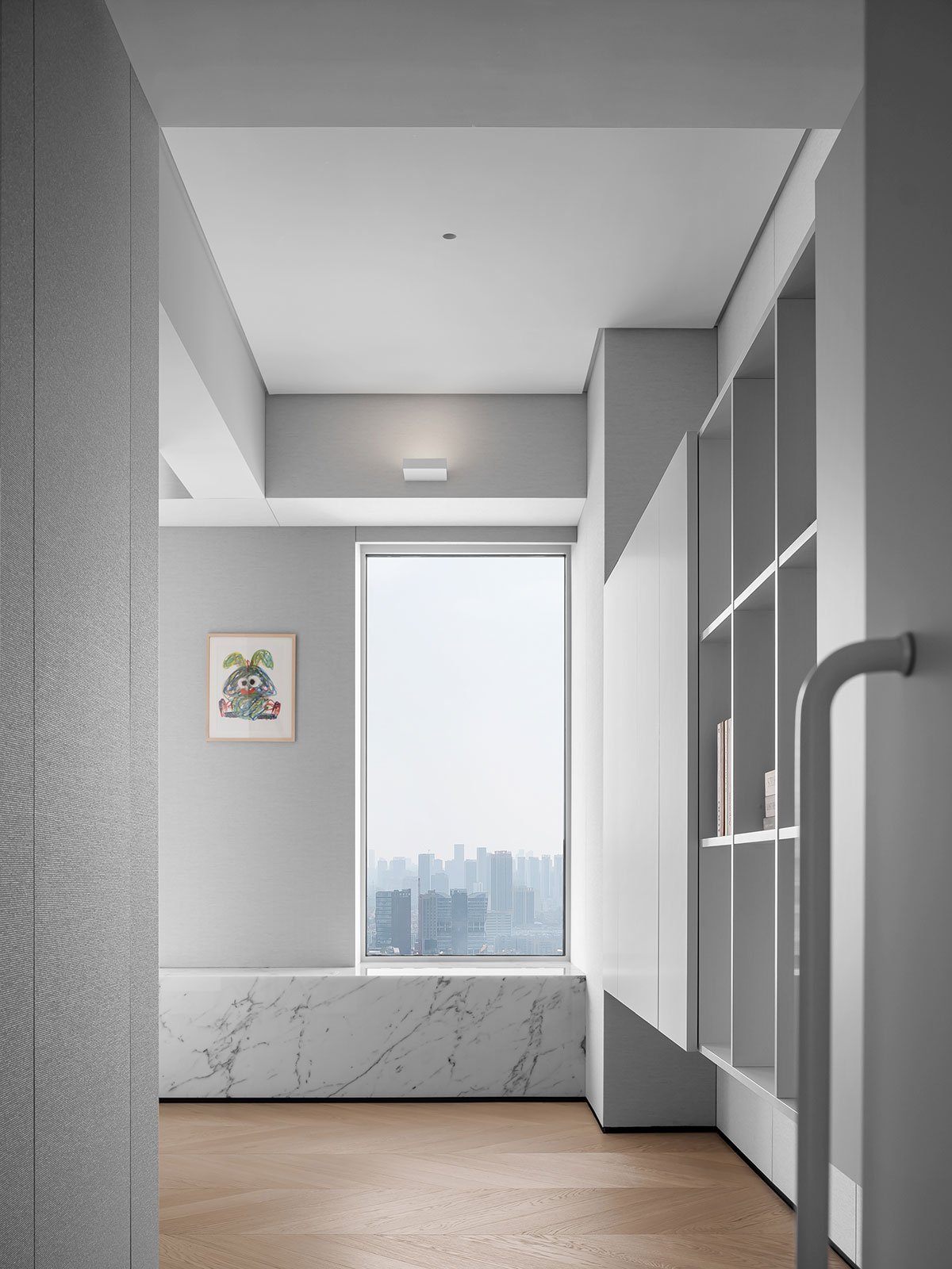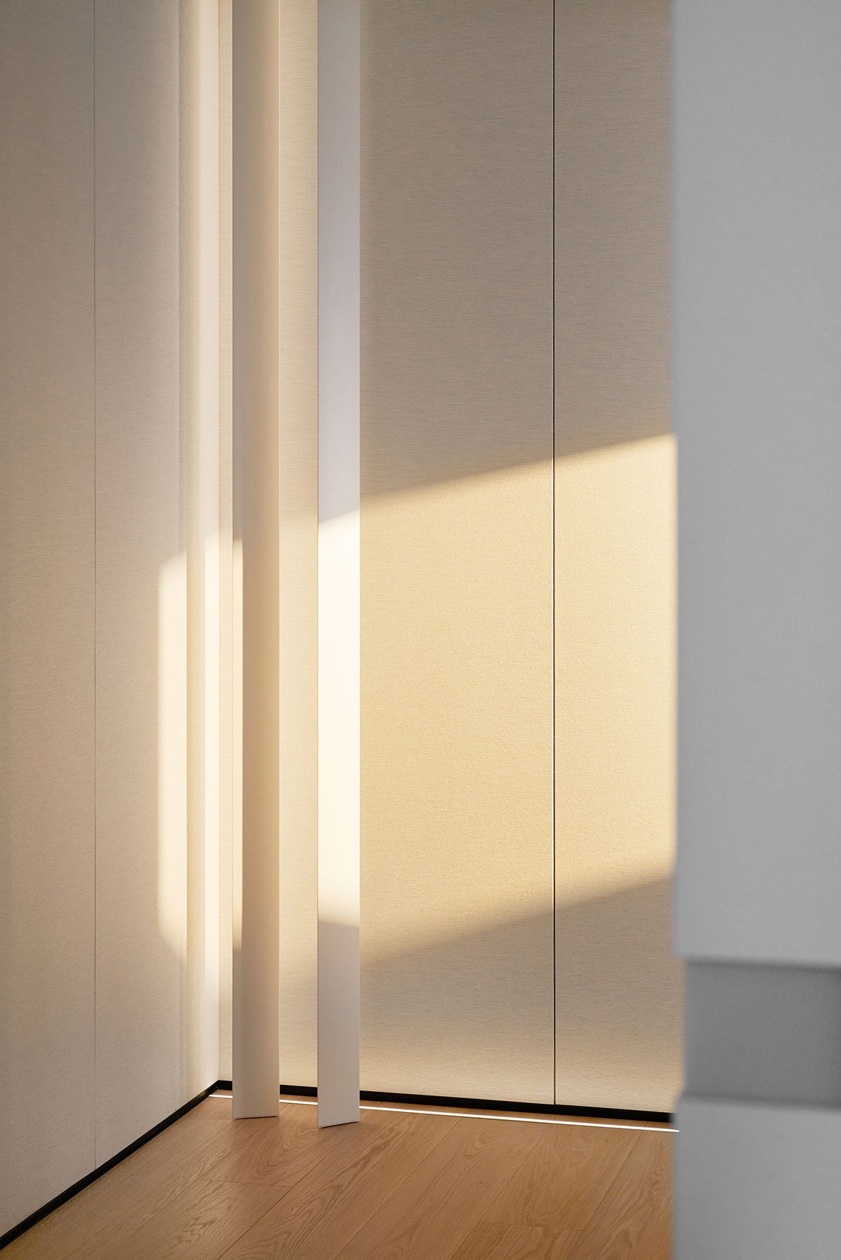 Dusk Glow: Home serves as a physical container, as well as a spiritual haven. The pristine white color scheme and elegant wooden flooring create a warm and inviting ambiance in the bedroom. Considering the living quality of each family member, the designer has designed three spacious suites, complete with private bathrooms and ample storage space, capturing the essence of an ideal luxurious residence.