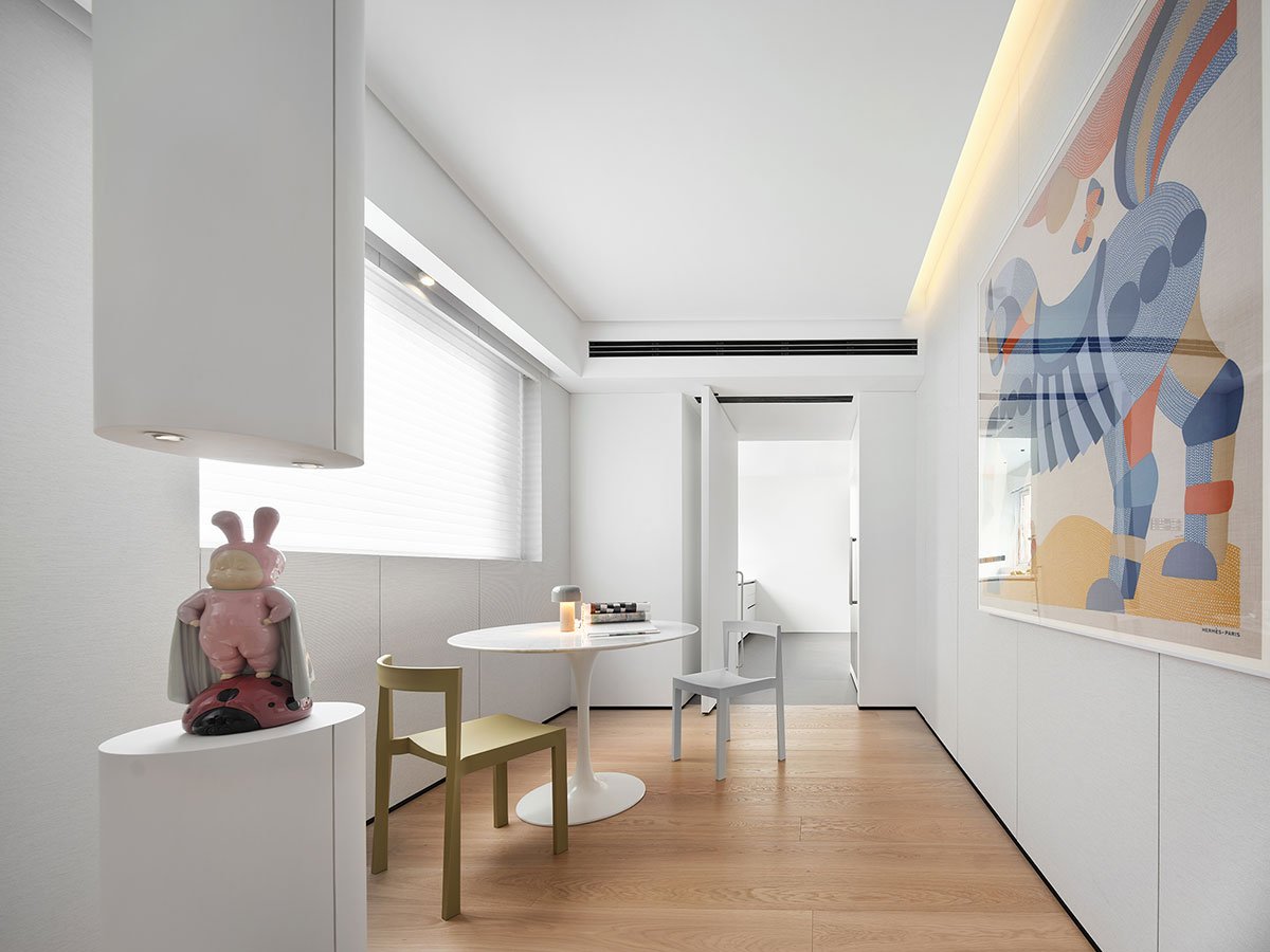 In this project, a significant number of walls were removed to create a more open and interconnected public space. The previously enclosed rooms now are open toward the living and dining room. Additionally, each functional area incorporates sliding doors with concise lines, which contribute to a minimalist aesthetic and provide a clean and uncluttered visual experience. The living and dining area has been redesigned to accommodate the residents’ lifestyle, replacing conventional TV sets with an island dining table as the heart of the home, serving multiple purposes such as dining, coffee-making, working, and reading. This integration of functionality and aesthetics has greatly improved the efficiency of circulation routes for daily activities.
