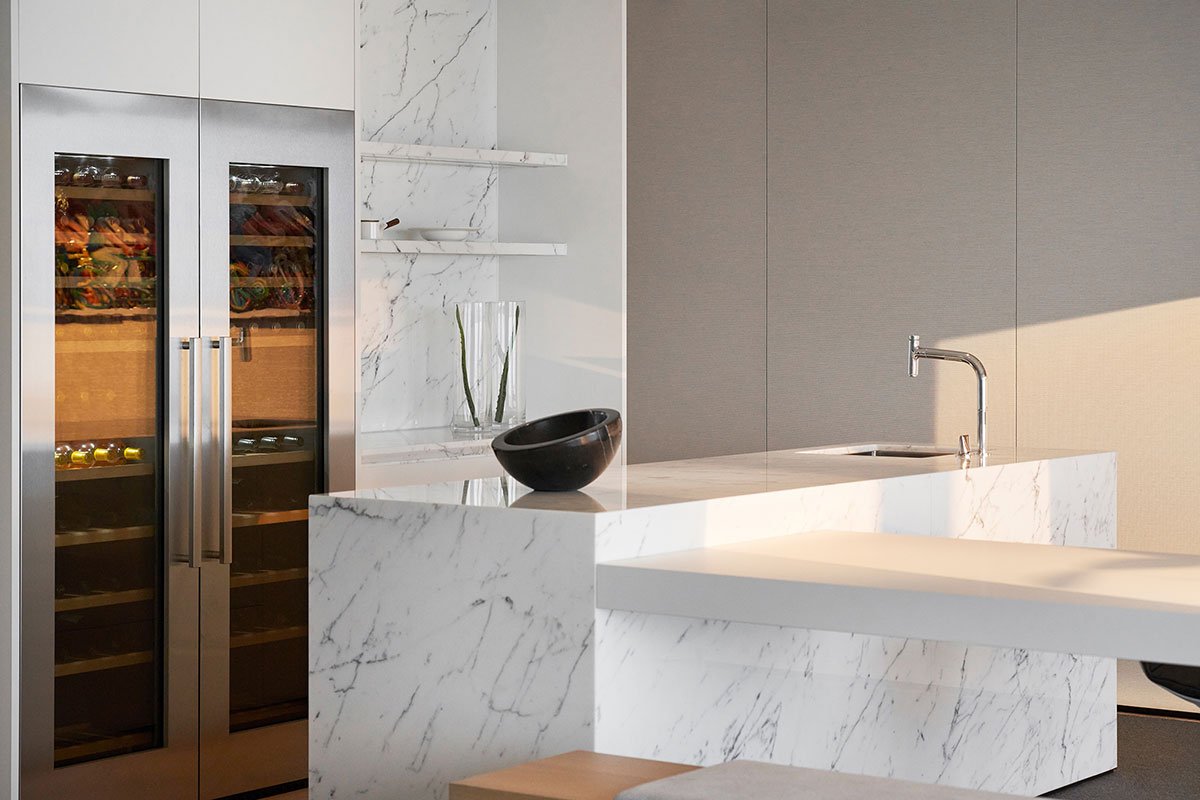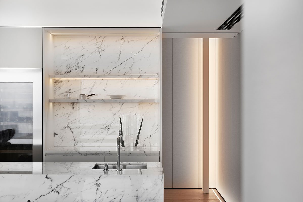 One side of the load-bearing wall in the hallway has been thoughtfully designed to serve as a versatile western kitchen and wine cabinet. This design not only meets the functional requirements of a western kitchen but also achieves a harmonious balance between openness and privacy. The kitchen island seamlessly extends into the dining table, creating a unified space for dining, enjoying coffee, and socializing. This layout provides ample opportunities for connecting with family, relatives, and friends. The dining bar, crafted entirely from raw marble with cohesive patterns, showcases a high-quality luxurious texture.
