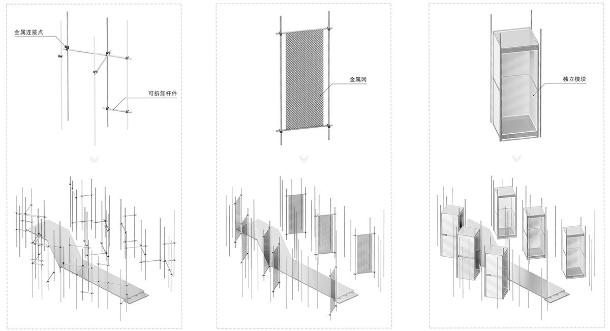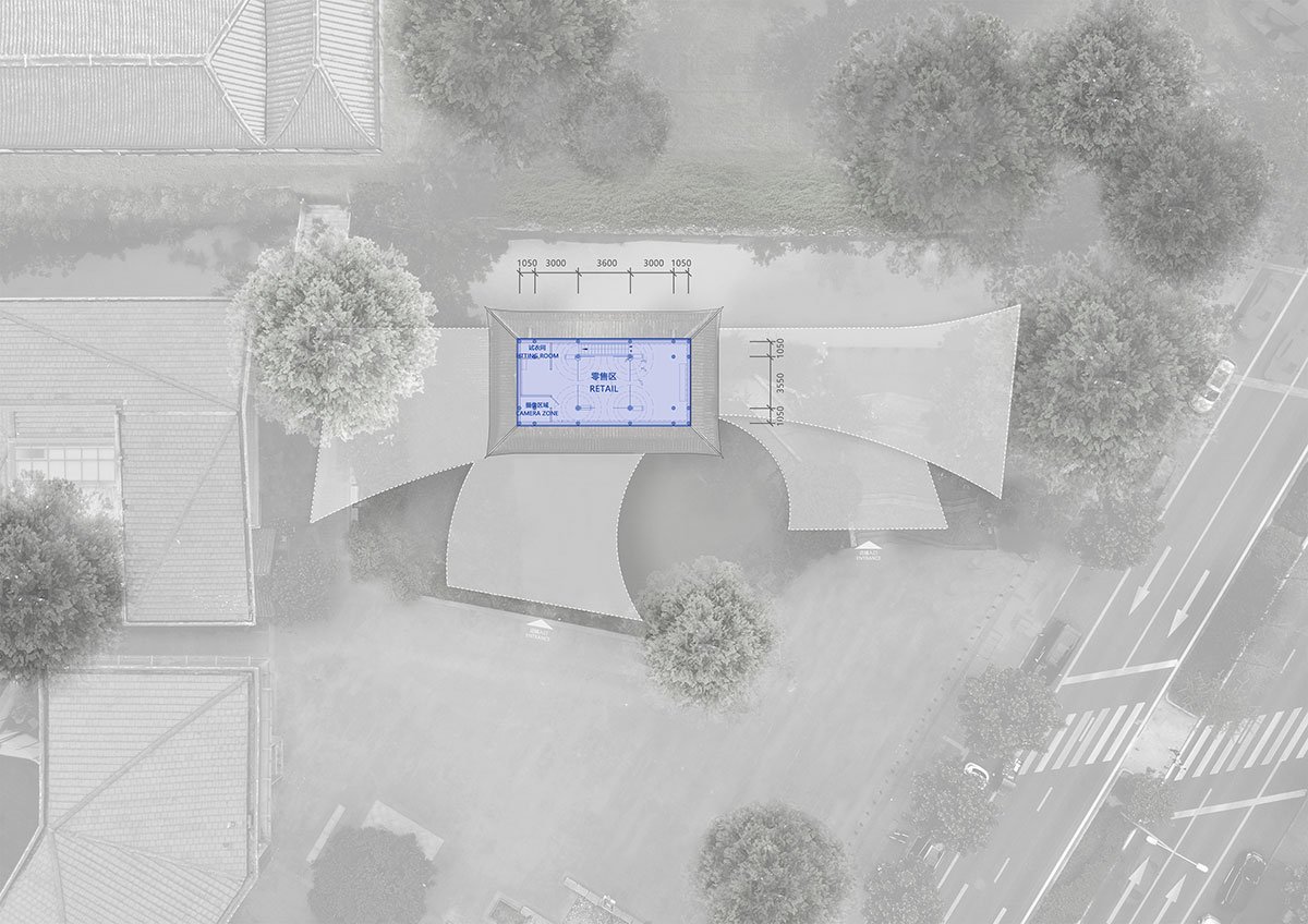 Within the transparent extension block, the scattered “bamboo forest” pillars ‘grow’ from the ground to the eaves top, supporting the weight of the roof with the natural posture, weakening the existence of the steel structure support and hiding it in the “bamboo forest”. Combined with the flexible and elegant white gauze curtain and shading curtain, the site is open and transparent, and meets the requirements of shading and privacy when shooting.