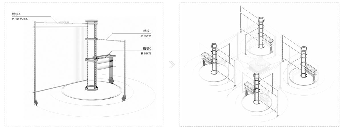 Stepping into the first theme retail space, the “metallic bamboo groves” presents a full sensation of modern Shu(Sichuan region culture) charm. By extending the metallic pole into the main component of the props system, a complete set of retail props system is formed with flexible fasteners and crossbars. The hidden fog system can well extend and enlarge the changes of light and shadow, and the goods will have a sense of tide and mystery under the shadow of smoke.