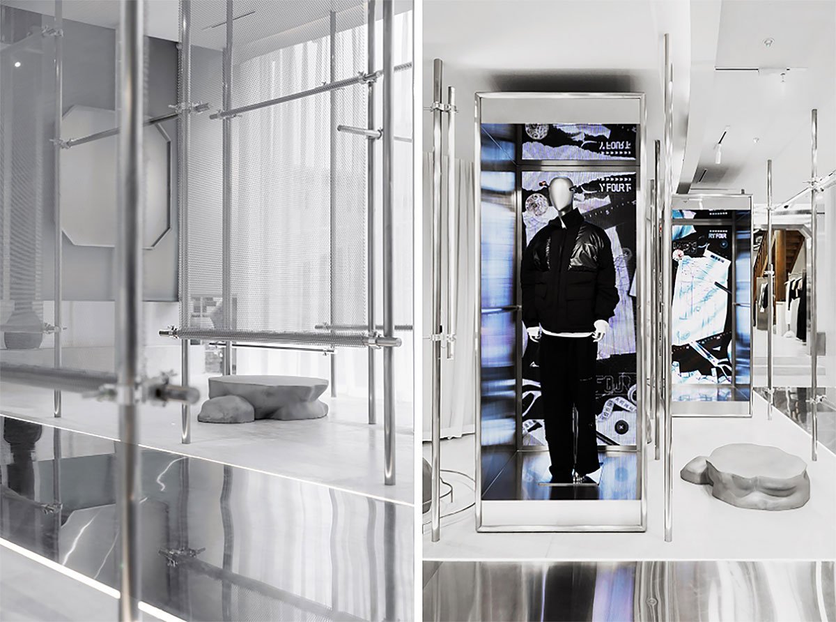 The “flow” ribbon, a huge 3D printing device, encloses the main entrance space of the building and guides one into ‘The Fourtry Space’ fashion experience space. The first place to arrive is the double-sided island unit of the coffee area. In the open space along the river, there are exclusive collaboration coffee tables and chairs designed by SLT and The Fourtry . In order to respect the context and memory of the original site to the greatest extent, the designers use metallic mirror material to restore the original winding stone bridge. The built-in landscape and the retaining of the two water auspicious beast statues (Gong-Fu, one of the nine sons of Loong) in the site express an ancient revival charm and give the original regional culture a new visual experience.