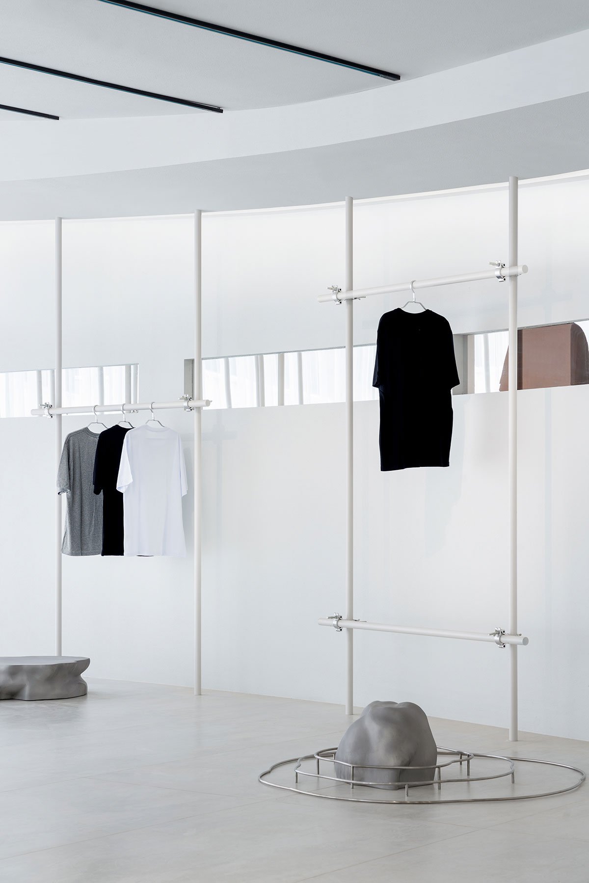 Gradually up to the second floor, the space symmetry and system of the original wooden building are preserved to the greatest extent. Linear light is used to increase the depth and dynamic of space in east-west direction. The newly added scene props and exhibition system around the wooden column reorganize the space through three high-level rods, high, medium and low, and cooperate with the slender screens hanging on both sides to create a trendy show atmosphere. Wearing and fitting here, the rich visual experience brings the trend vitality to the originally solemn and classic architectural space.