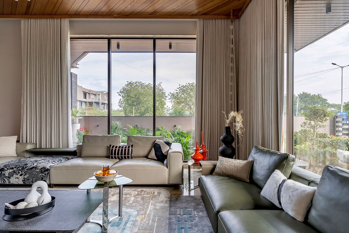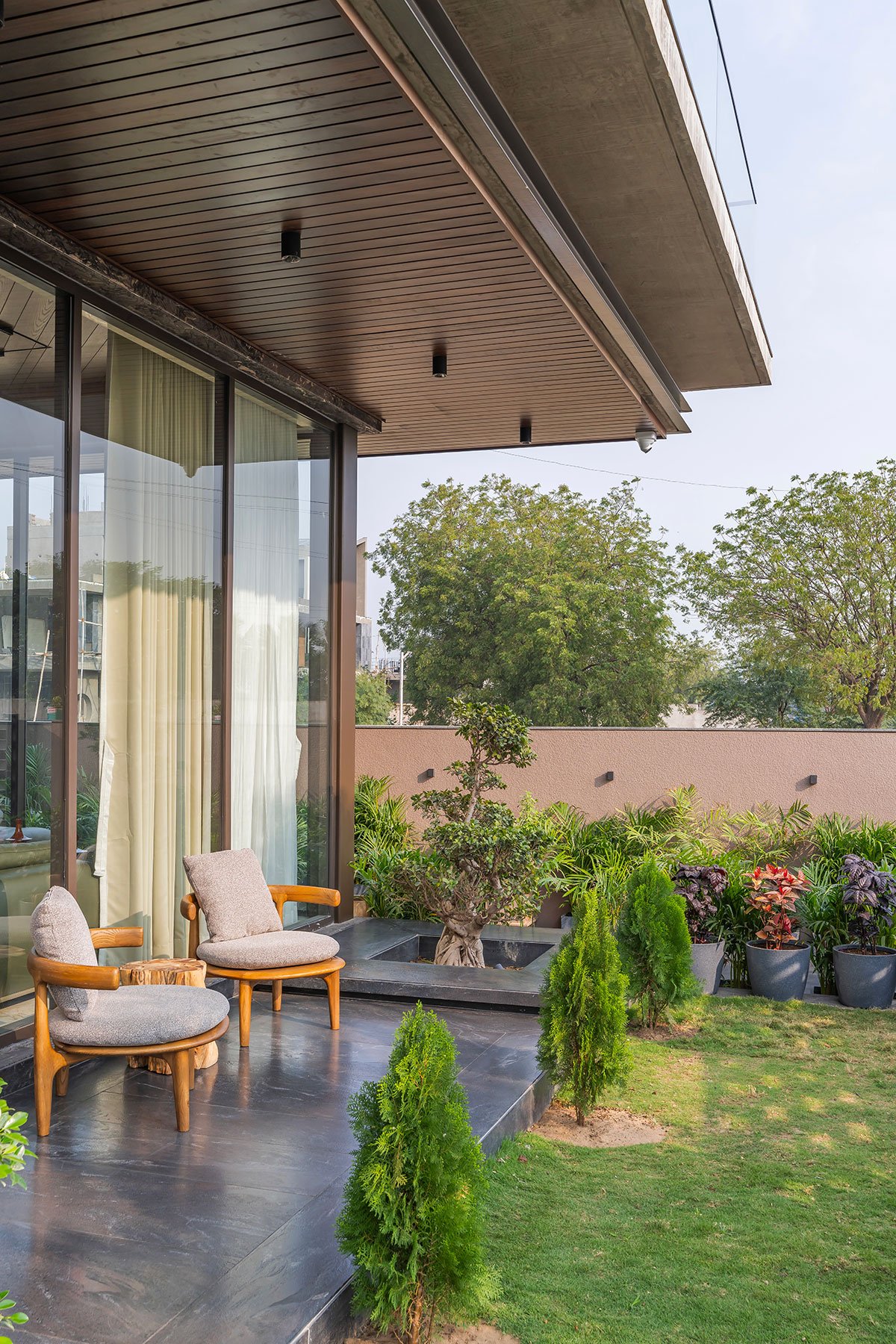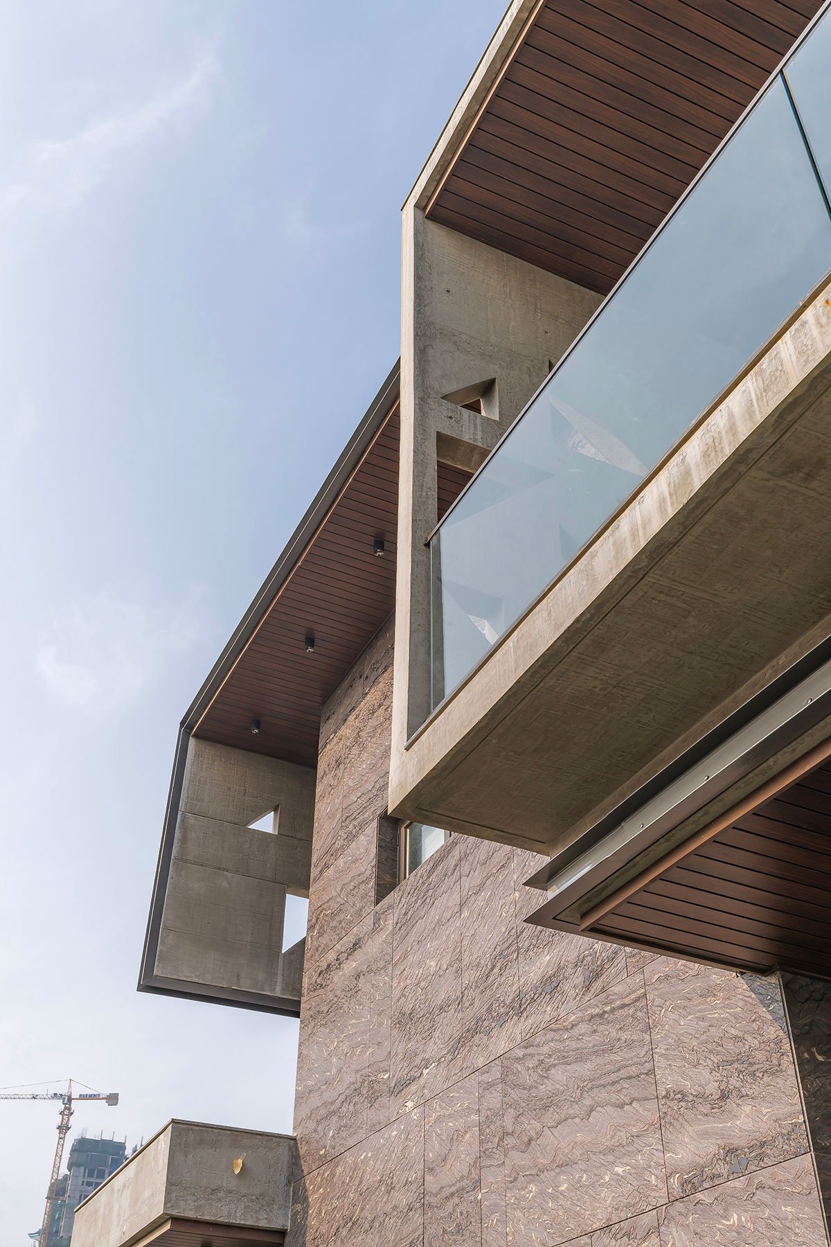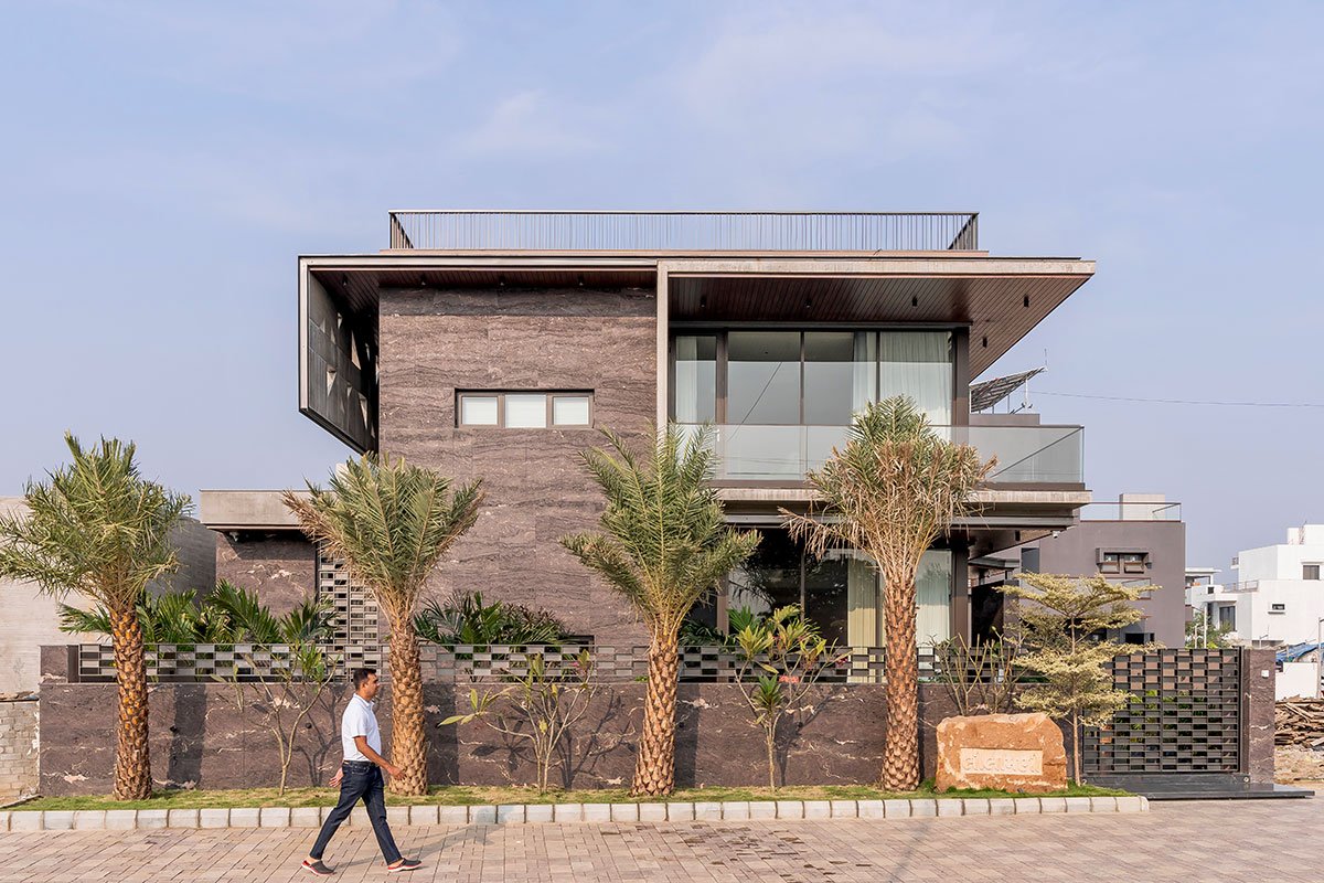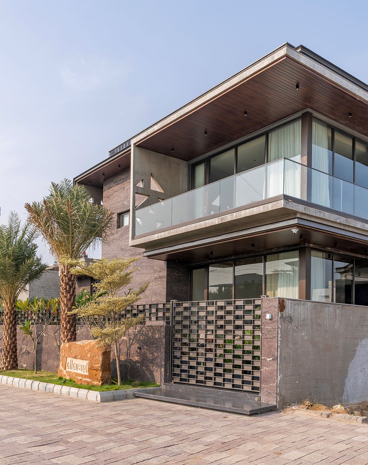 [Text as submitted by architect] The 6000 sq.ft. “Frame House” at Ahmedabad is a masterful fusion of modern architectural design and luxurious interiors, where sleek lines, high-quality materials, and intentional landscaping harmonise to create a striking and sophisticated residence. The exterior exudes contemporary minimalism, showcasing clean cubic forms, expansive glass windows, and well-defined balconies that effortlessly blend functionality with elegance. The facade is a captivating interplay of stone cladding, glass panels, and warm wood accents, achieving a perfect balance between industrial strength and natural warmth. The roof’s subtle overhang not only provides shade but also adds an artistic flair, while the glass railings on the second-floor balcony and frameless glass elements throughout the home enhance the seamless connection to the outdoors.