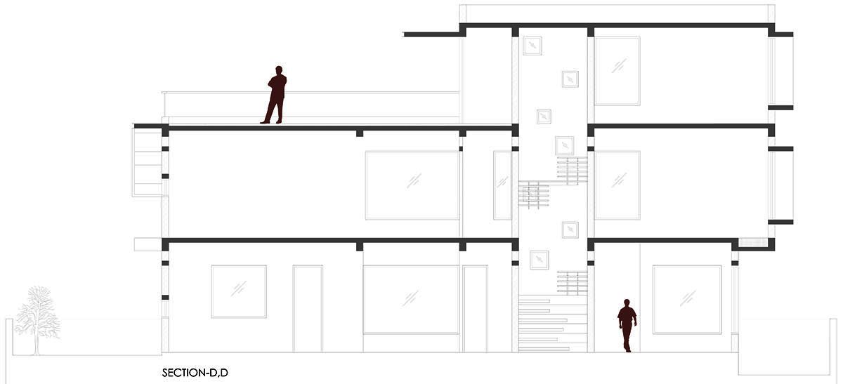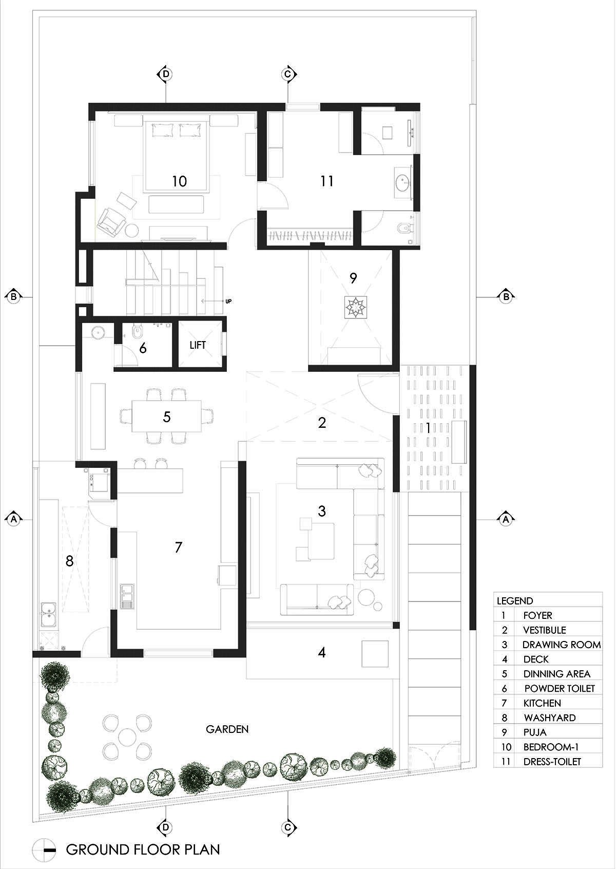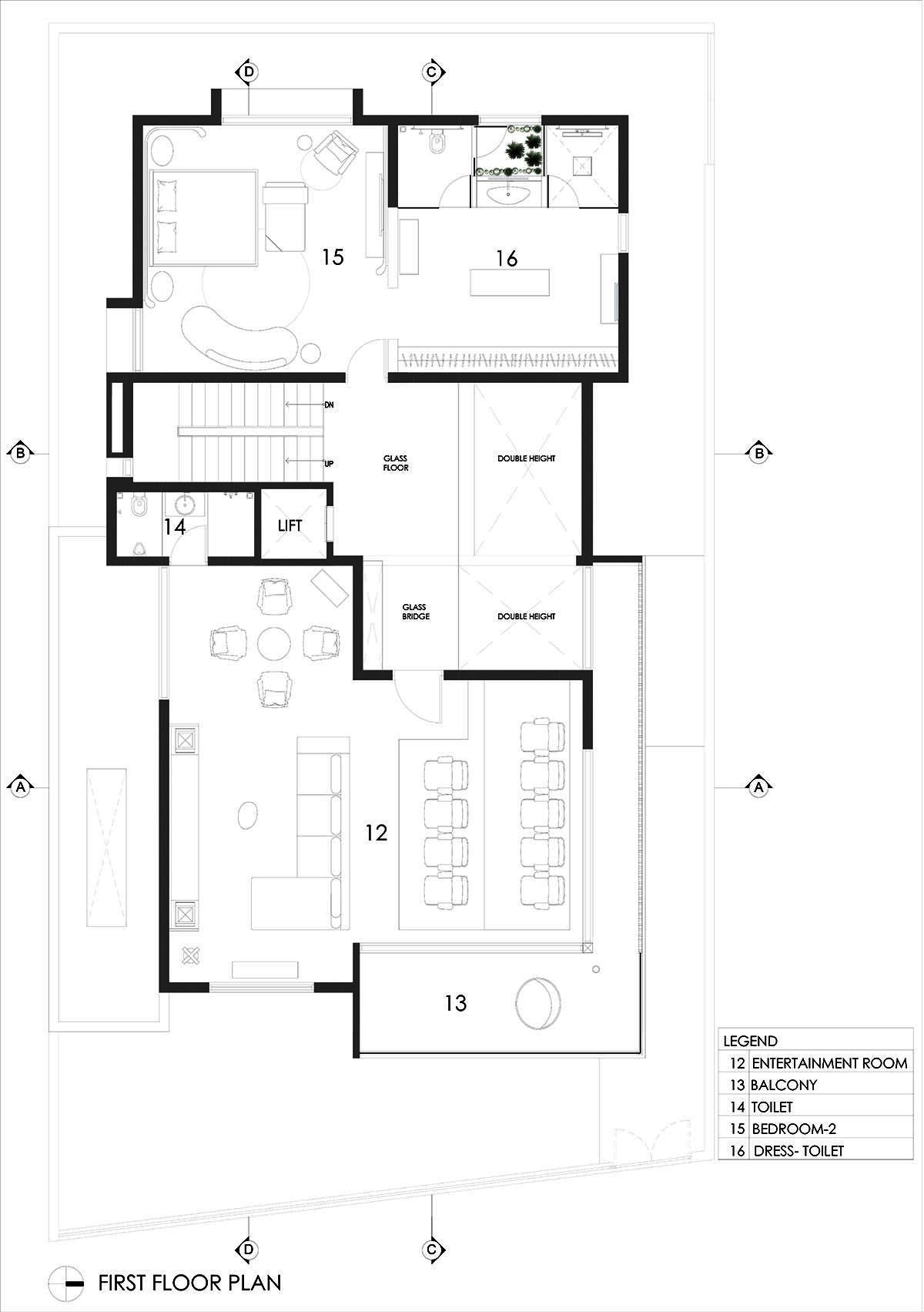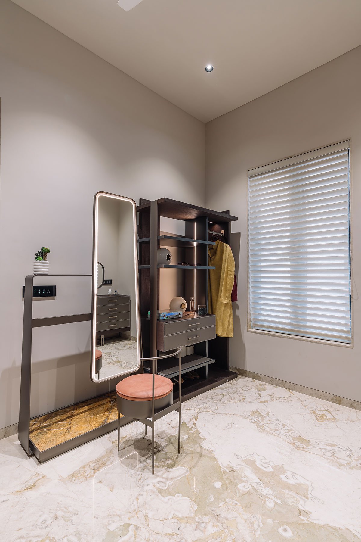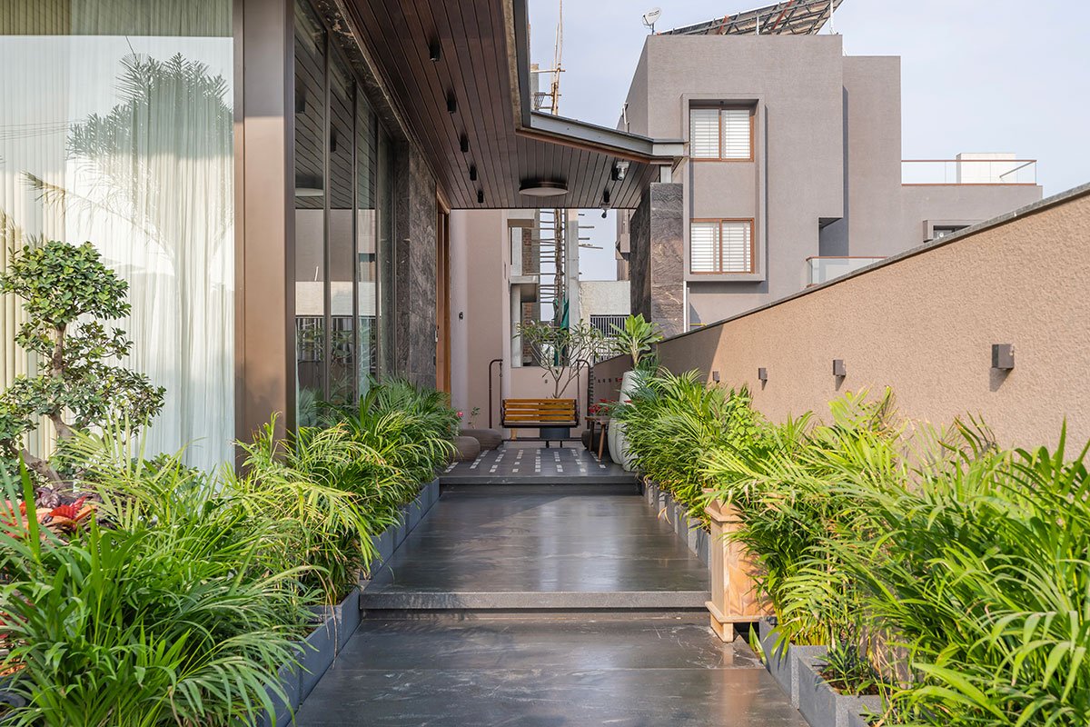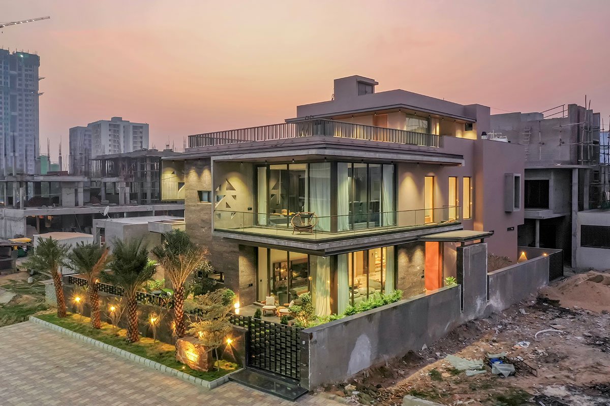 [Text as submitted by architect] The 6000 sq.ft. “Frame House” at Ahmedabad is a masterful fusion of modern architectural design and luxurious interiors, where sleek lines, high-quality materials, and intentional landscaping harmonise to create a striking and sophisticated residence. The exterior exudes contemporary minimalism, showcasing clean cubic forms, expansive glass windows, and well-defined balconies that effortlessly blend functionality with elegance. The facade is a captivating interplay of stone cladding, glass panels, and warm wood accents, achieving a perfect balance between industrial strength and natural warmth. The roof’s subtle overhang not only provides shade but also adds an artistic flair, while the glass railings on the second-floor balcony and frameless glass elements throughout the home enhance the seamless connection to the outdoors.
