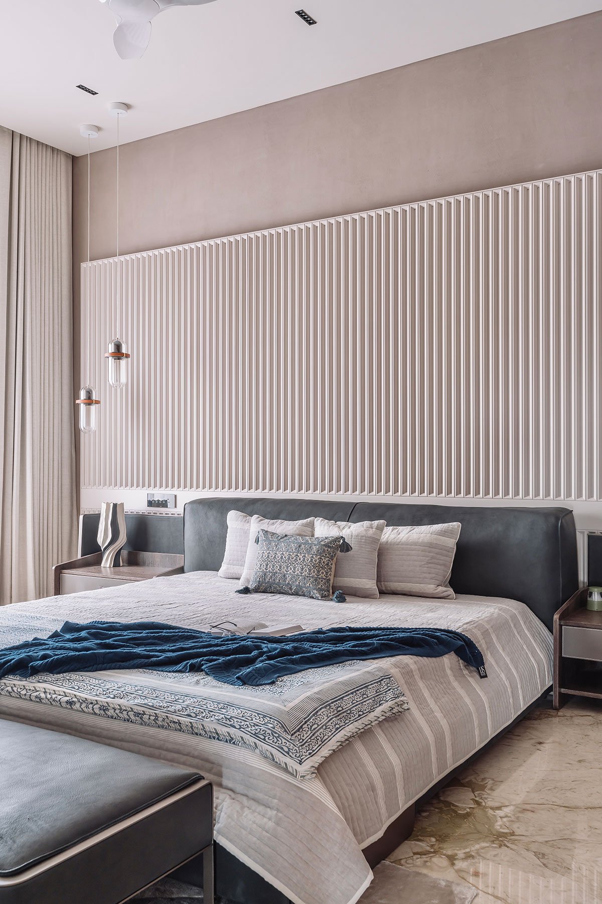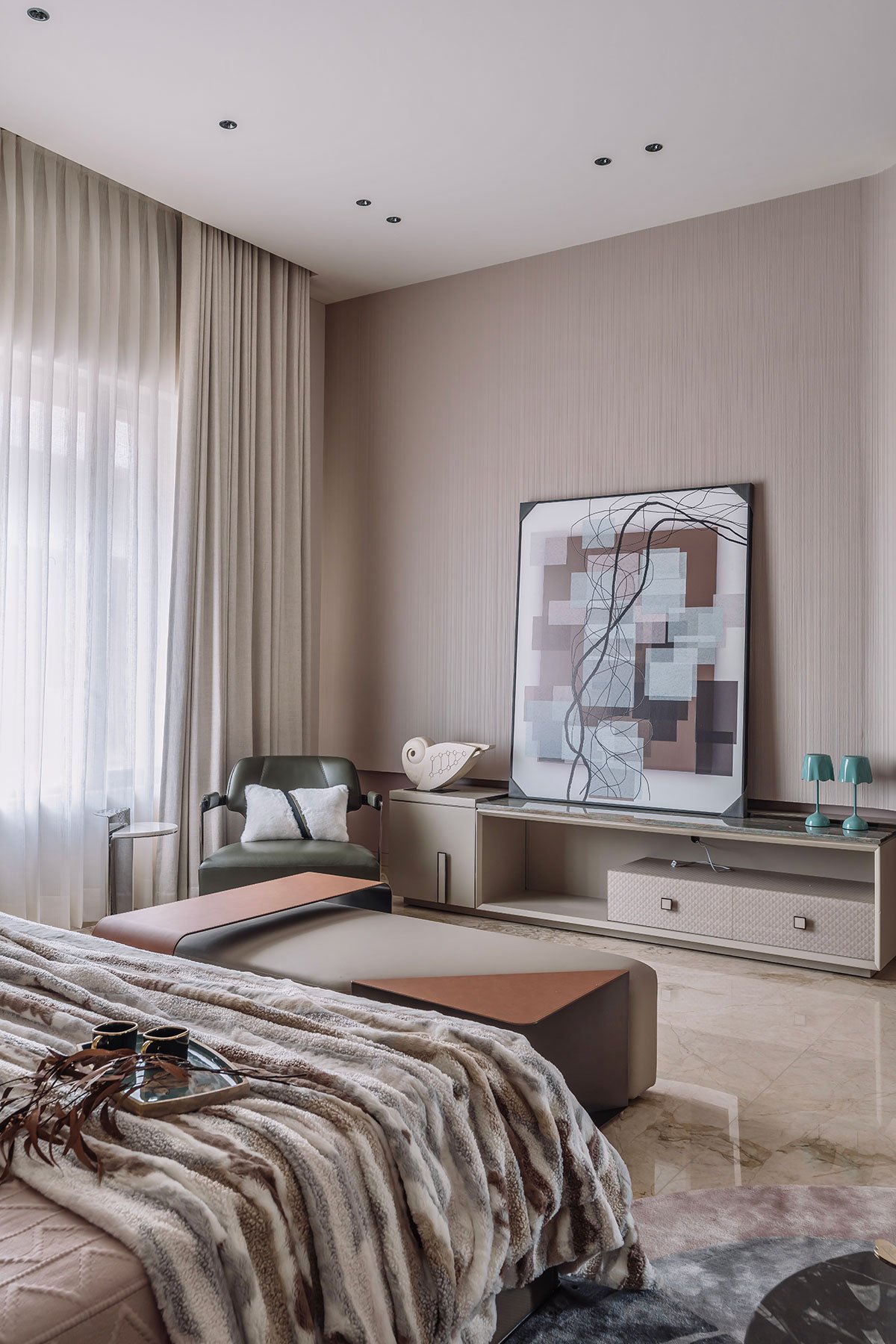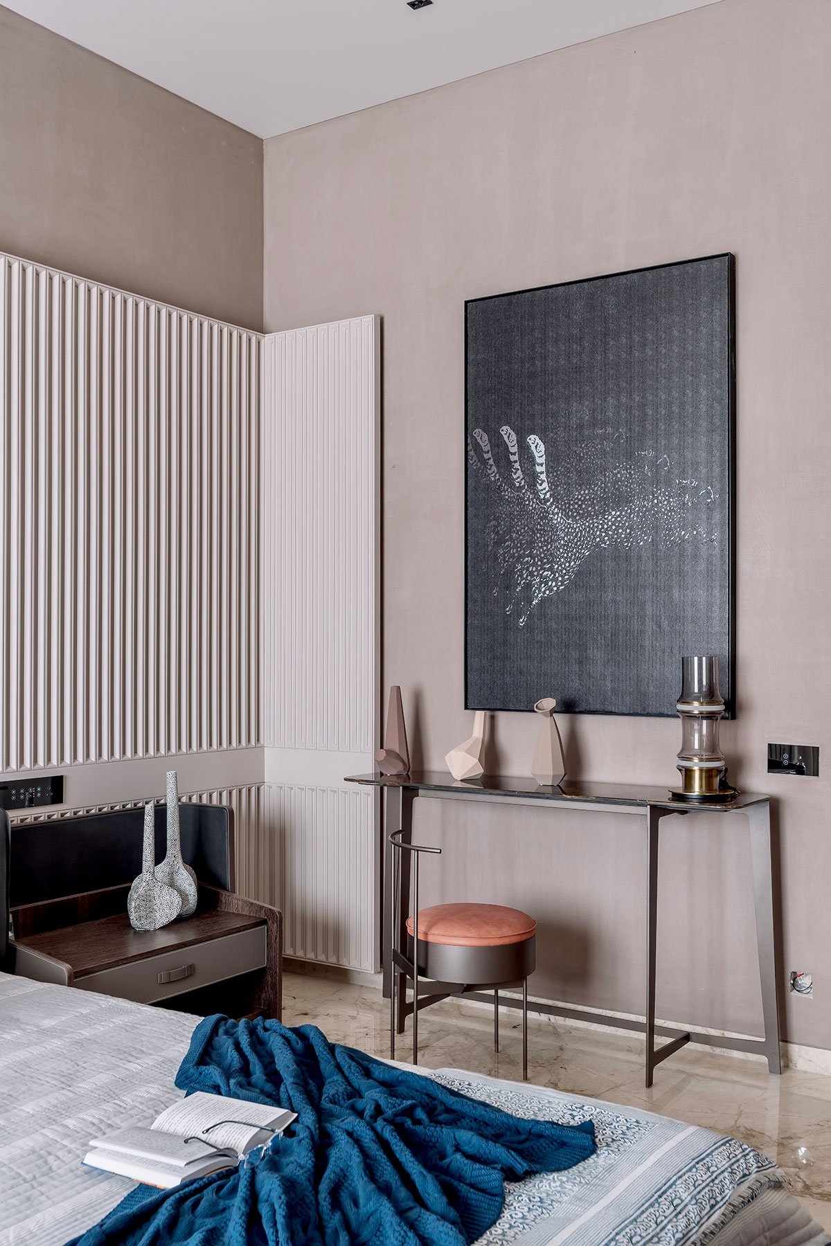 This sophisticated elegance extends seamlessly into the bedrooms, each a retreat of tranquillity. The first bedroom on the ground floor embraces minimalist luxury, featuring a textured backdrop of vertical slatted panelling that adds depth to the soft beiges and light greys of the decor. A plush bed upholstered in velvet beckons for restful slumber, while ceramic vases and contemporary sculptures contribute subtle artistic touches. A bold black abstract artwork serves as a striking focal point, contrasting beautifully with the neutral palette, while carefully integrated lighting creates a calm, restful atmosphere.