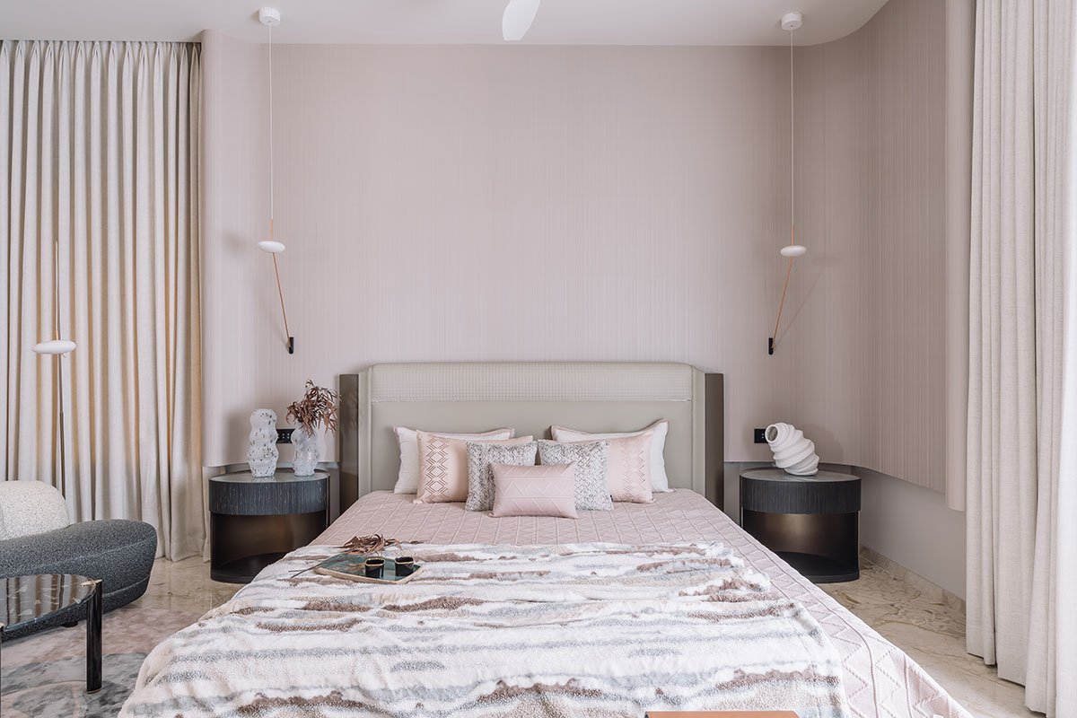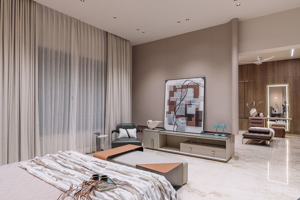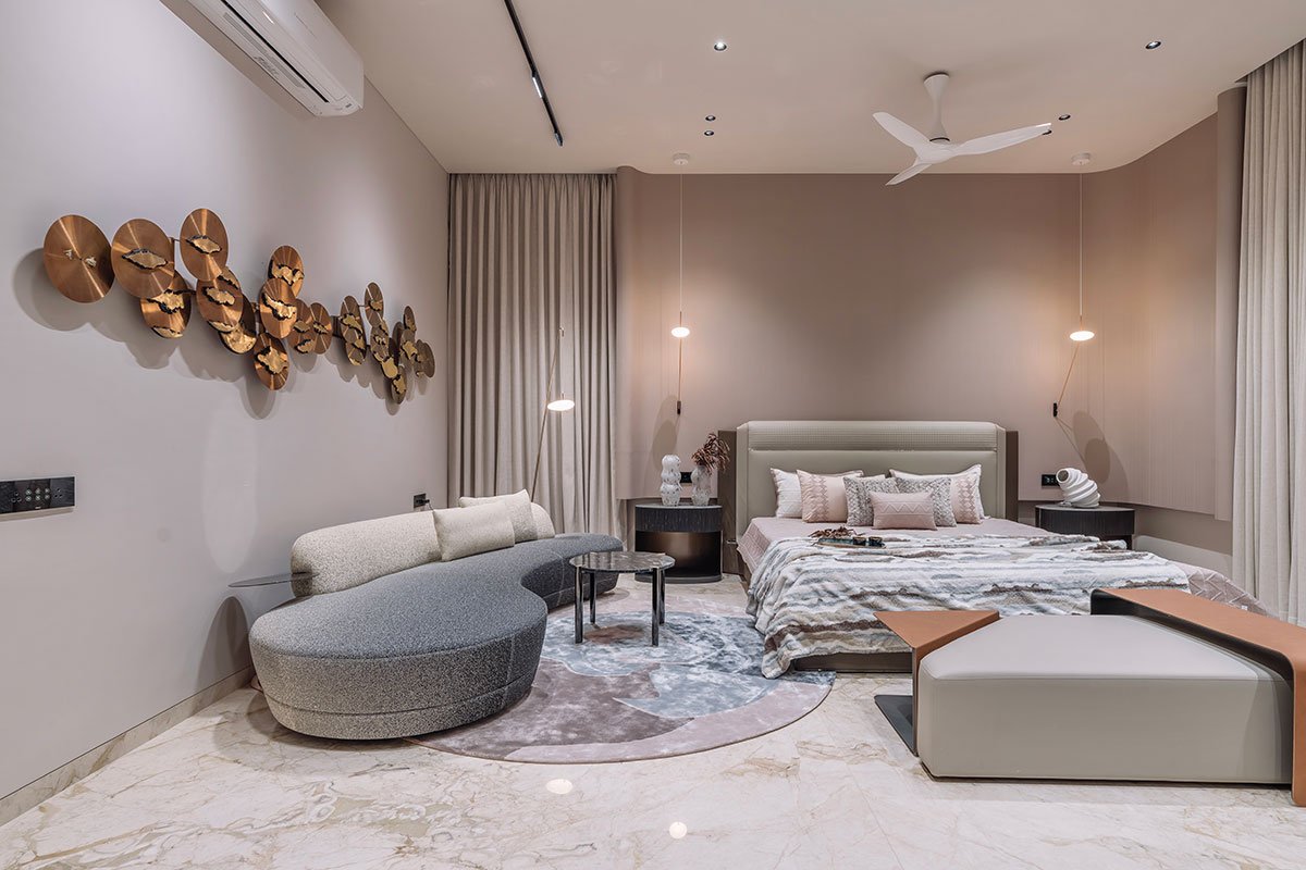 The bedroom on the first floor offers a haven of warmth and comfort. Here, soft greys, creams, and muted golds weave a tranquil tapestry, while rounded, plush furnishings encourage relaxation. A curvaceous sofa upholstered in speckled fabric provides a cosy nook, while the cushioned bed with its clean lines anchors the space. The room’s organic shapes are echoed in the circular chaise lounge and softly curved rug, creating a harmonious flow. Pendant lights cast a warm, intimate glow, and floor-to-ceiling curtains enhance the room’s sense of luxury, offering versatile light control through their sheer and blackout layers.
