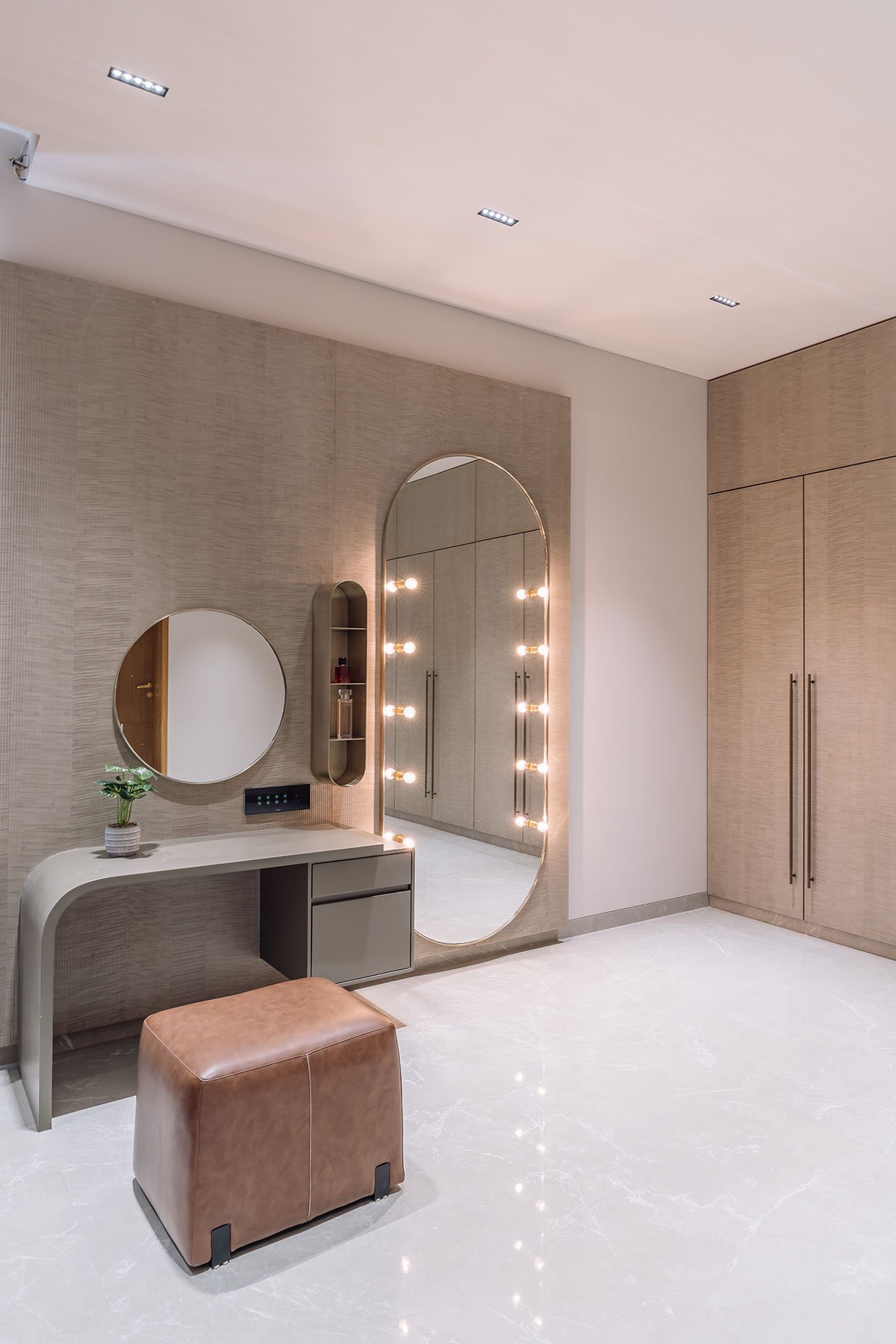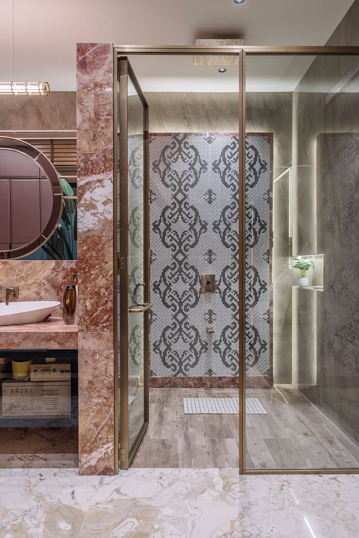 The bathroom stands as a sanctuary of opulence, adorned with rose-coloured marble veining that weaves through the vanity and countertops, exuding an air of high-end sophistication. Dark brown cabinetry provides a sleek contrast, while concealed lighting around the mirror ensures a modern, polished look. A tufted leather bench adds both comfort and style. Hidden storage solutions keep the space uncluttered and serene, crafting an ideal environment for relaxation and self-care.