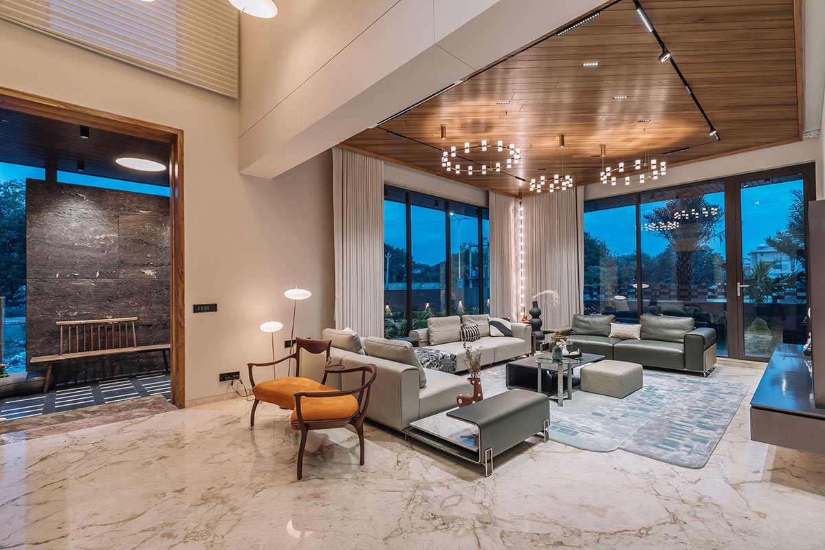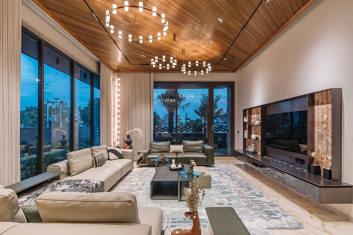 Stepping inside, the interiors reveal a harmonious blend of modern luxury and meticulous design, crafting a serene environment where every detail has been curated to enhance both form and function. The living area is awash in natural light, flooding in through the floor-to-ceiling windows that blur the line between indoors and outdoors. Plush, leather-like sofas in soft grey hues are arranged around a sleek, dark coffee table, creating an inviting conversation space. A soft, neutral area rug adds warmth beneath, complementing the polished marble flooring. Above, the wood-panelled ceiling injects organic richness, contrasting beautifully with the cool-toned furnishings. Elegant circular pendant fixtures cast a gentle ambient glow, further elevating the upscale atmosphere and inviting guests to linger.