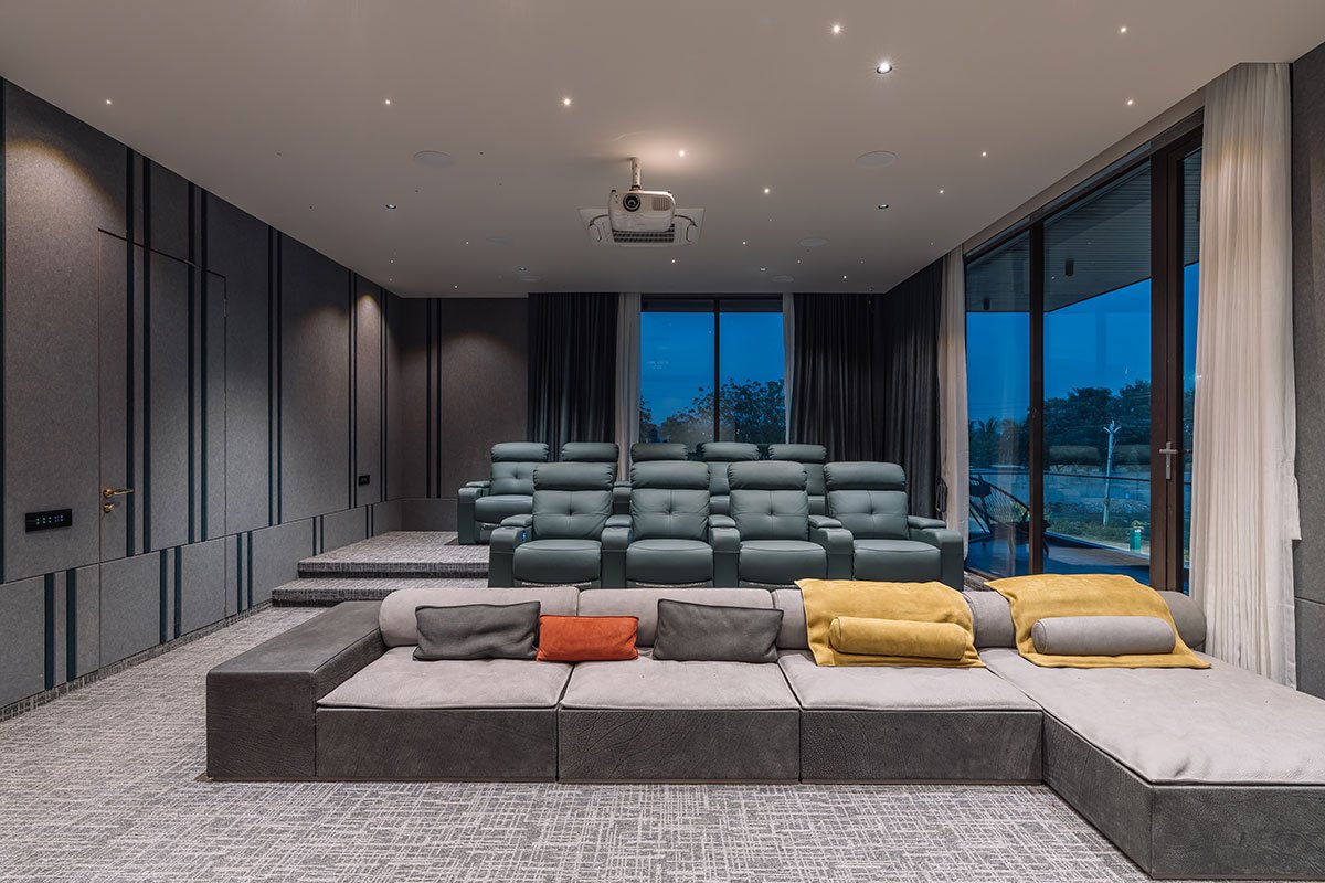 Here, there is also a modern home theatre that features two distinct levels of seating, an elevated back row with plush recliner chairs for optimal viewing, and a casual front row with a long sectional sofa adorned with soft cushions in muted tones. The minimalist walls, primarily dark grey with subtle vertical stripes, complement large floor-to-ceiling windows that bring in natural light, with curtains for lighting control. The ceiling is smooth with recessed lighting and a built-in air-conditioning unit for climate control. The carpeted floor has a neutral, textured pattern, enhancing the room’s acoustics and creating a cosy atmosphere. This adds a personalised touch to the modern, luxurious design intended for comfort and entertainment.