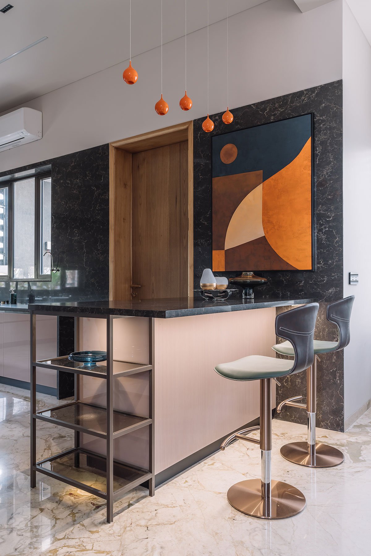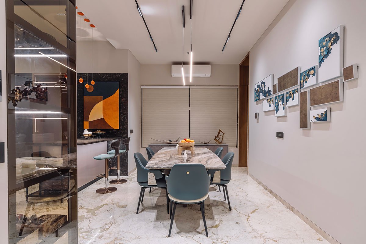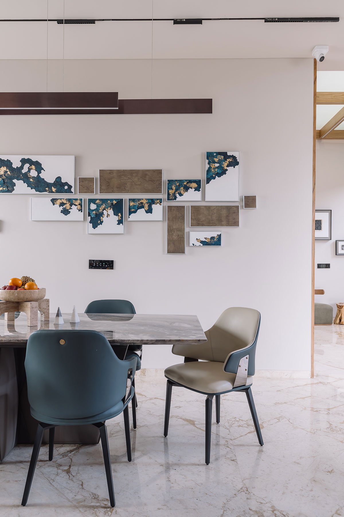 Flowing seamlessly from the living area, the dining space continues this luxurious theme, adorned with gleaming marble flooring and a minimalist stone dining table. Surrounded by soft leather chairs in muted tones, this area is ideal for both casual meals and elegant entertaining. A bold art installation featuring vibrant splashes of blue and gold provides a striking pop of colour, beautifully tying together the room’s modern aesthetic. Each piece of furniture and decor has been selected with precision, contributing to an environment that feels both visually captivating and deeply comfortable.