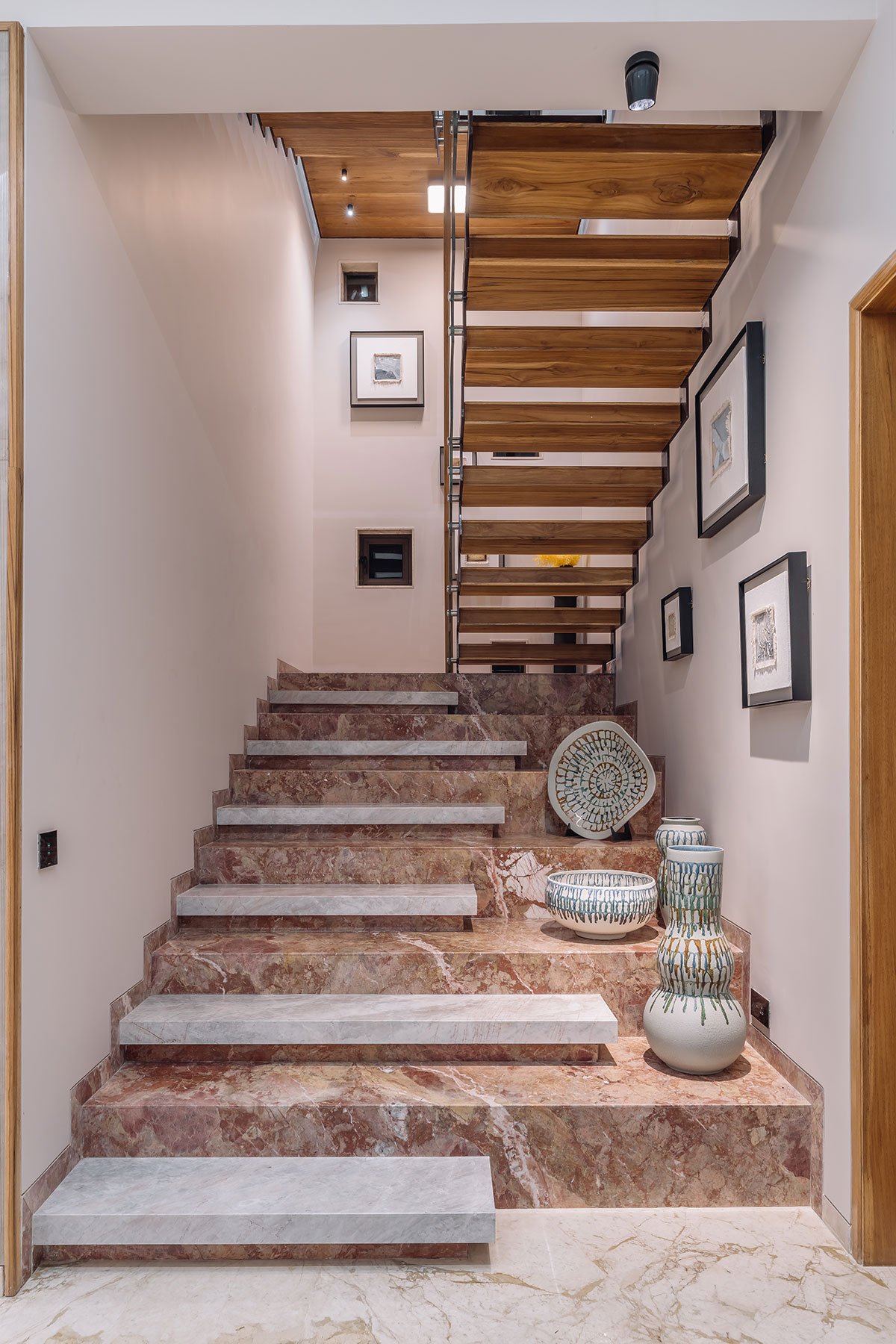 Furthermore, a stunning staircase ascends gracefully from the ground floor to the second floor, serving as a focal point of architectural elegance. Polished marble steps ascend with clean, linear precision, framed by transparent glass panels that offer unobstructed views of the spaces below. The warm wood railing and ceiling unify the materials, adding an organic richness to the sleek environment. Along the staircase walls, framed artwork adds personality and depth, while ceramic vases at the base infuse texture and artisanal charm, softening the modernity of the glass and marble.
