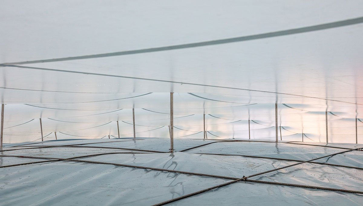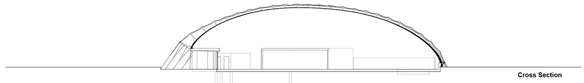 The Shaded Dome, placed on a concrete plinth with doors and windows, consists of a dome supported by air pressure, a network of steel cables and a roof made of hi-tech textile with a large span. The dome is made of an insulated inner and outer fabric, kept apart by spacers.