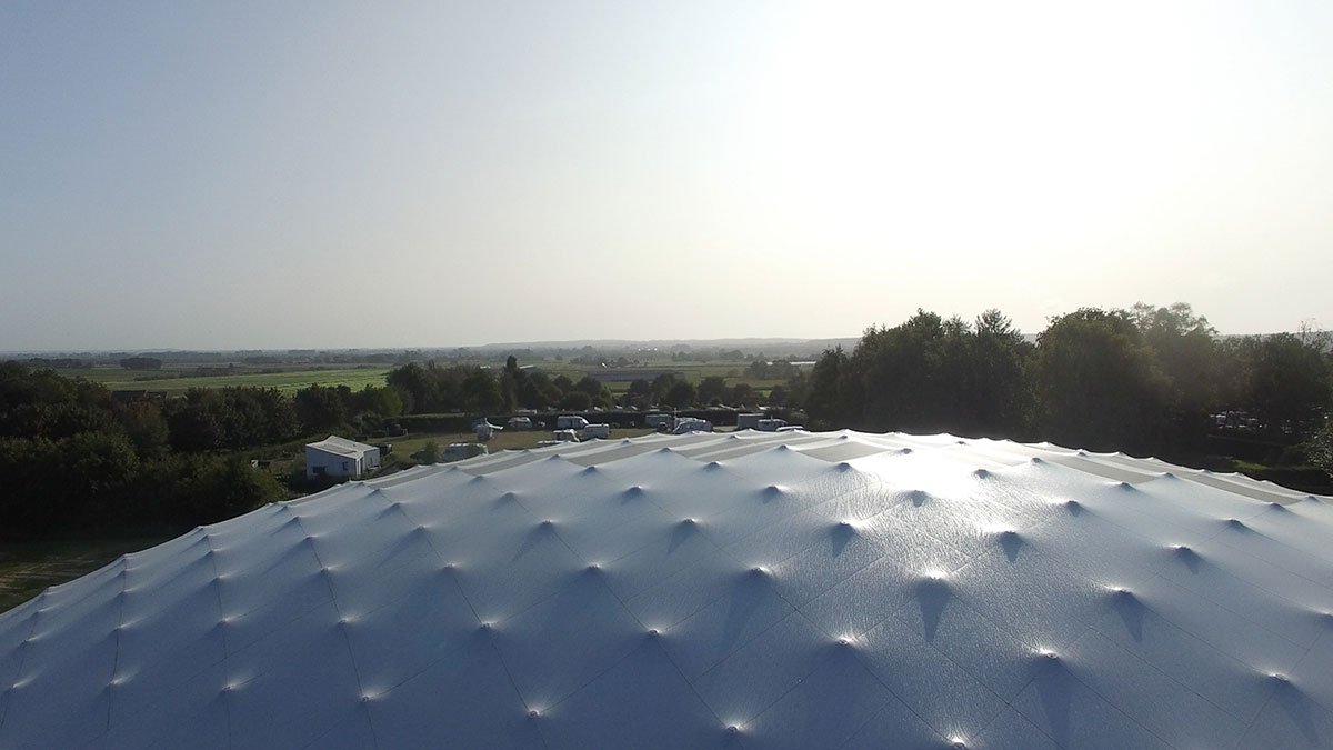 As the roof is inflated, the self-righting spacers become erect, creating a cavity between them in which natural airflow quickly and automatically carries away the heat of the sun. Because of its two-layered structure, with an inner and outer fabric and a 50-centimetre cavity in between, the Shaded Dome requires markedly less energy than existing tentlike structures to create a comfortable and healthy indoor climate.