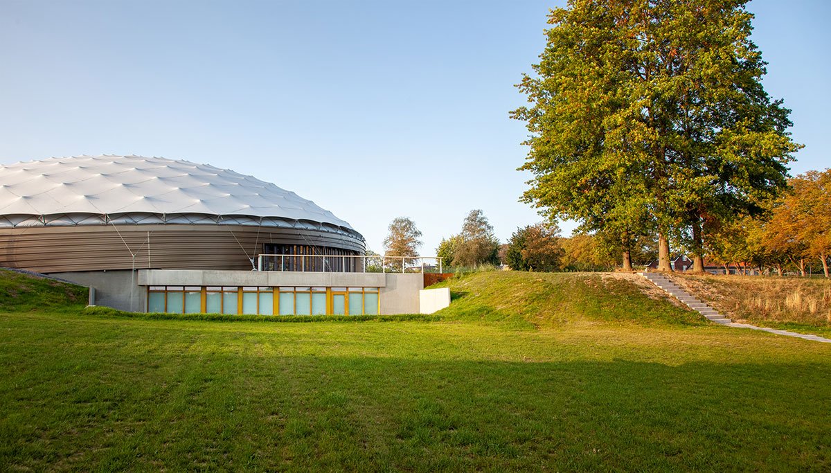 Seen from the road, the slightly tilted dome is positioned towards the back of the flat hilltop. This creates space for open-air events and for greenery between the museum and the Canadian military cemetery. The flowing shape, the use of materials and the skin, which evokes associations with the parachutes of the liberating forces, ensure that the Freedom Museum fits into this rolling landscape with its winding roads and verdant vistas.