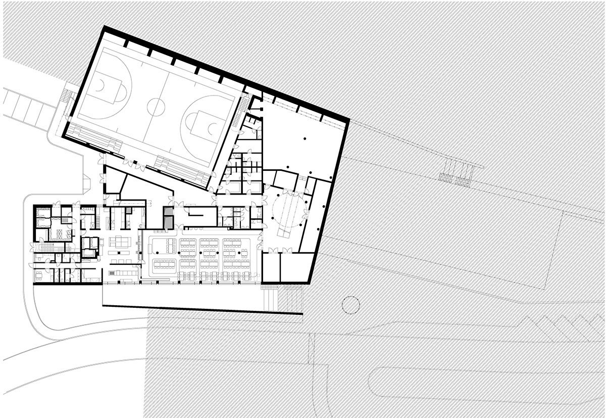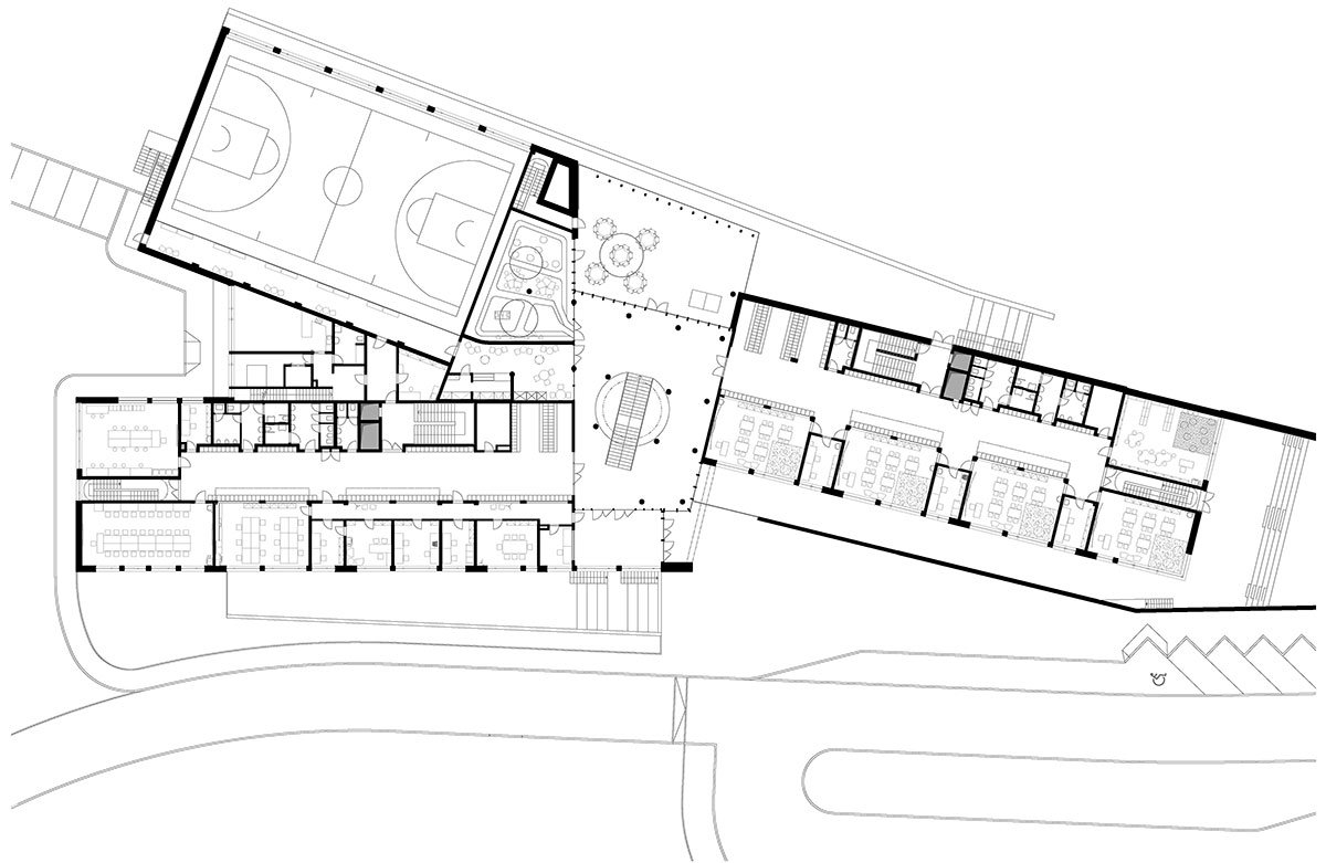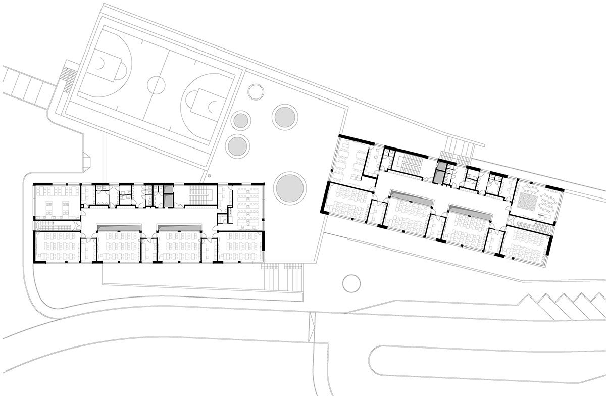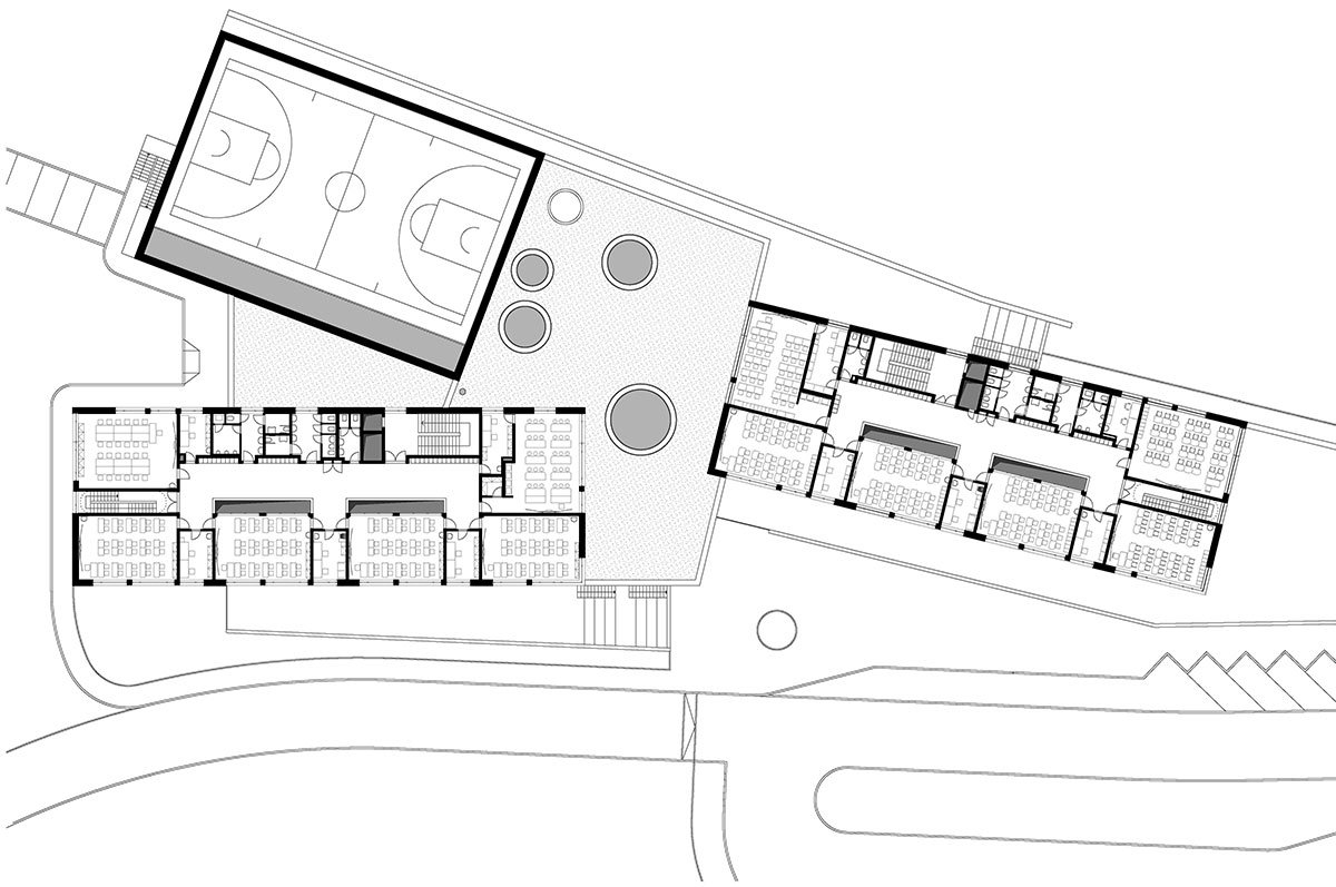 The aim was to ensure that the new school would integrate harmoniously into the village context of small family houses and gardens. The school is divided into three distinct volumes to avoid a monolithic appearance. The first, for younger pupils, includes general classrooms, art and music rooms, after-school spaces, and a library. The second, for the upper grades, similarly features standard classrooms, six specialized classrooms, a cafeteria with a food service area, and administrative offices. The third section, partly embedded into the slope, contains the sports hall. All three main buildings are connected by a lower structure that provides space for the entrance foyer, a vestibule, and a covered outdoor area used for breaks and informal teaching during warmer months.