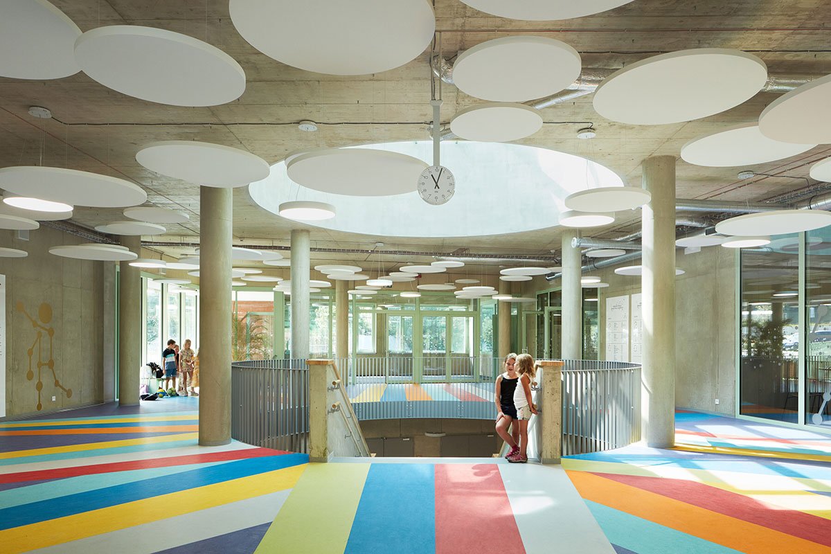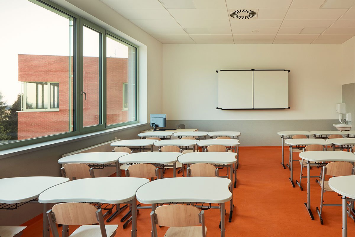 Color and pattern enrich the interiors. In collaboration with artist Pavla Gregorová Šípová, the floors were designed to evoke starry skies and ideas of communication—both spatial and human. In social spaces like the canteen and school club, comic-style speech bubbles decorate the floors, while the entrance foyer features a stylized star whose rays extend into the corridors and classrooms. Classroom floors use brighter colors for younger pupils and more muted palettes for older students and staff areas.