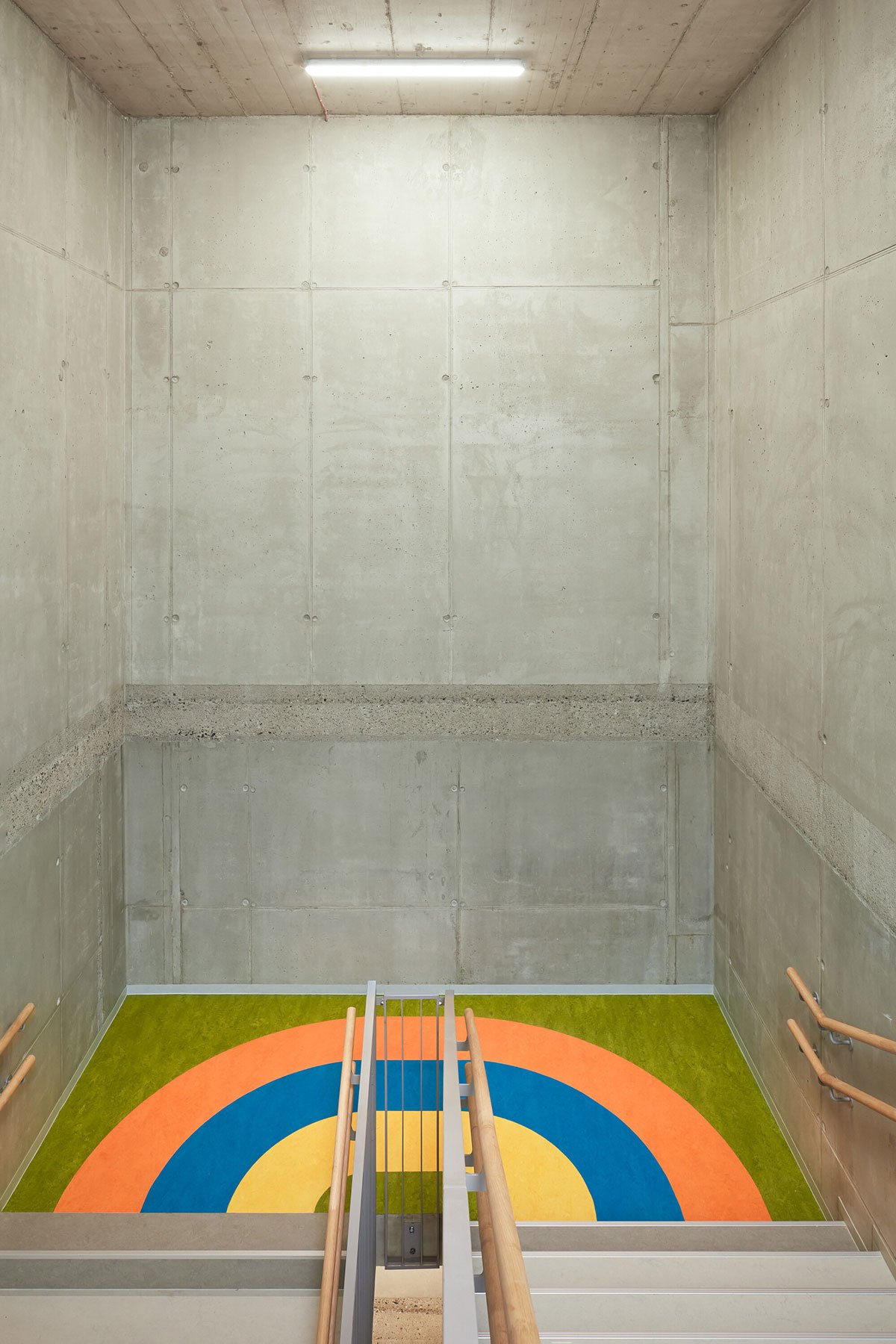 Interior planning emphasized clarity and daylight. On the entrance level, dedicated changing rooms were incorporated, while lockers are placed throughout the corridors on upper floors. One key challenge was the central corridors, positioned within the core of the building. To bring in light and air, north-facing skylights were introduced. These serve multiple functions: daylighting, passive ventilation, and—on their south-facing slopes—a platform for photovoltaic panels. The building is constructed to passive house standards, making it highly energy efficient. Ground-source heat pumps draw energy from twenty boreholes, each 140 meters deep, located behind the building. Ventilation is handled by mechanical systems with heat recovery, but operable windows remain available throughout to provide fresh air on demand.
