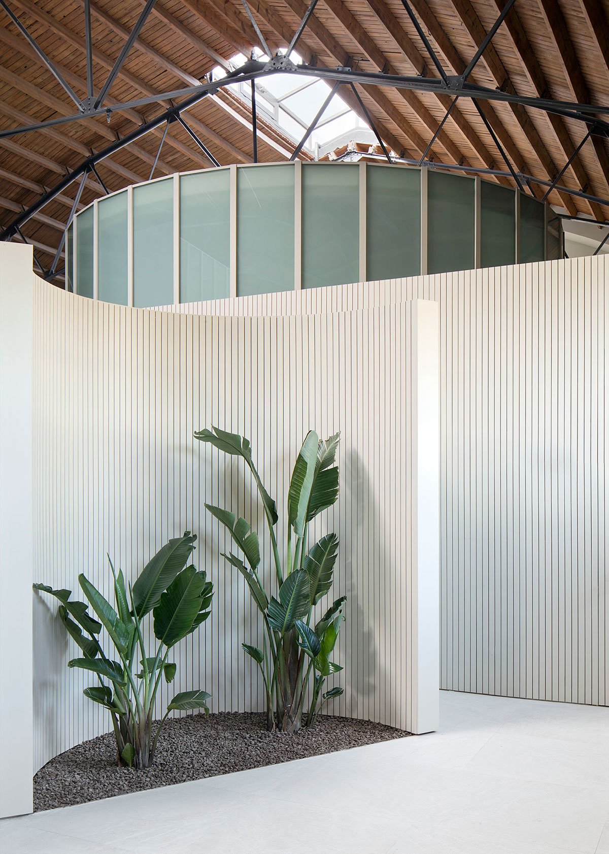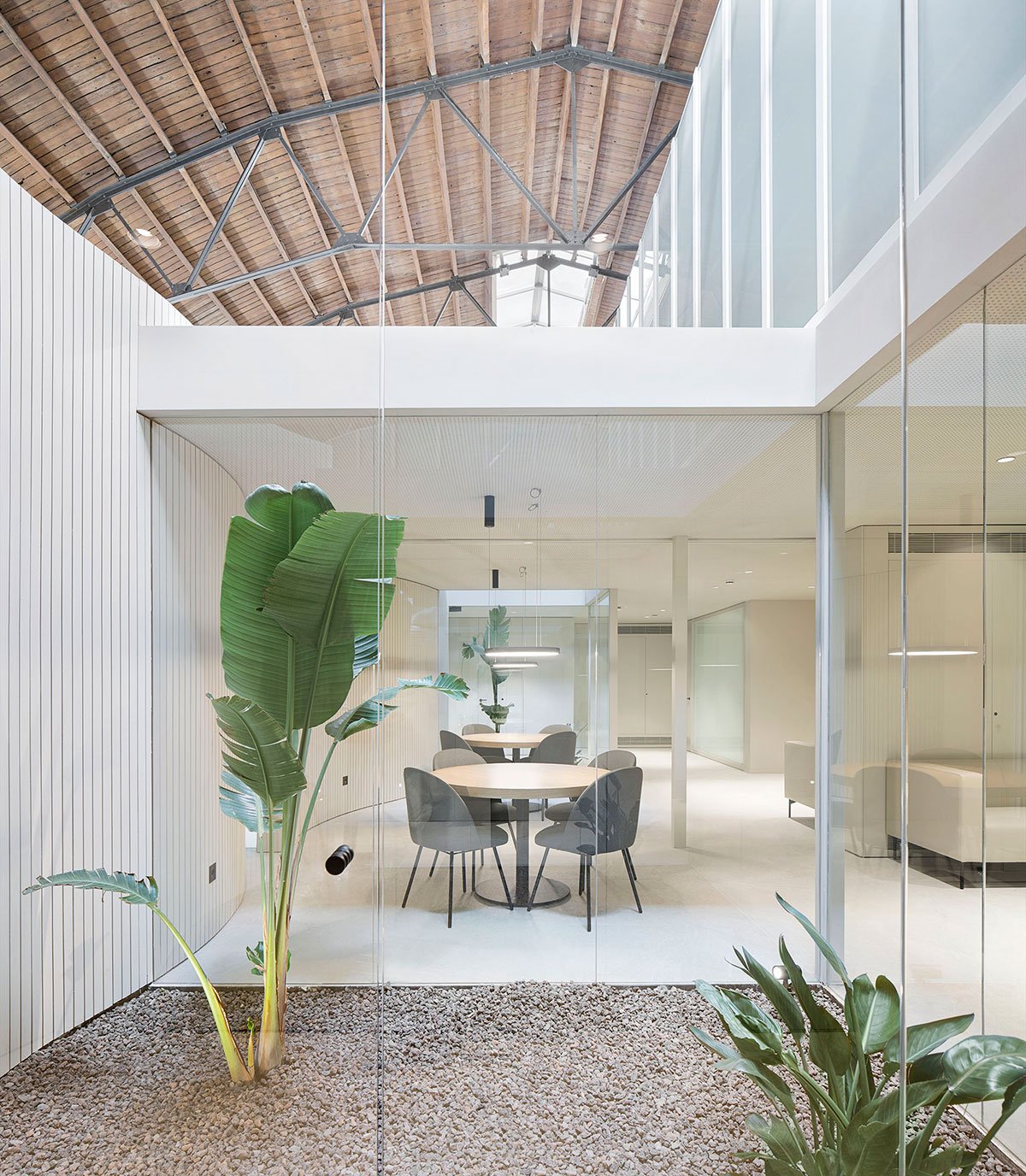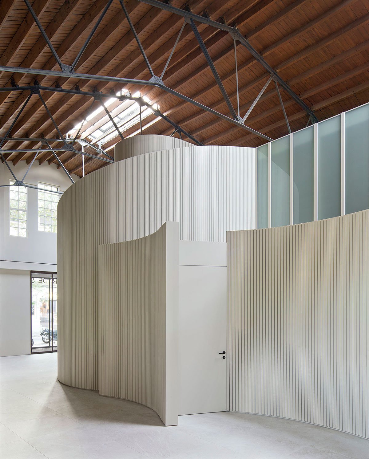 Excerpt: Funeral Home by MIRAG Arquitectura is an interior design project that aimed at creating a contrasting structure within a historical structure. The proposal restores the building’s original architecture while incorporating new additions that respect its past while enhancing its functionality for new uses. The industrial building serves as a container for a new funeral home, with a wooden roof with metal trusses serving as a protective element.