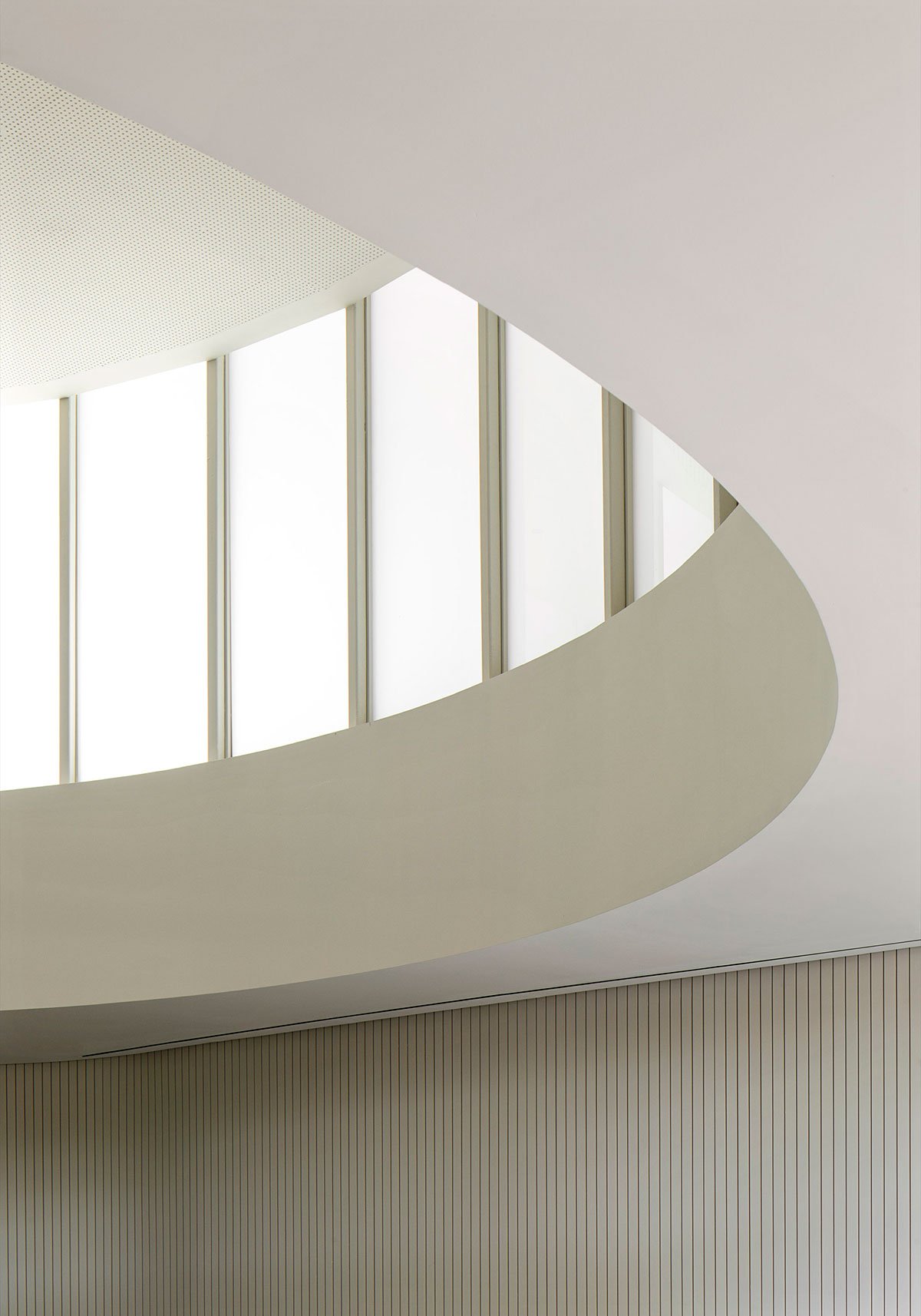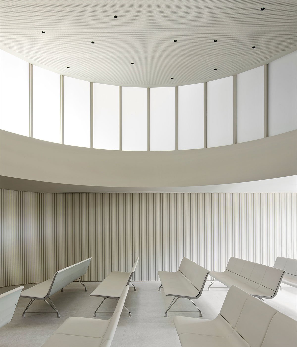 The walls of the family rooms are traced in a sinuous and organic way to become a sculpture that seems almost temporary with organic shapes that welcome the users. On the other hand, the volume of the offices and the roof of the ceremony room are two regular volumes that represent purer shapes linked to spirituality. The achievement is that the new building contrasts with the old one, yet does not compete and respects it at the same time.