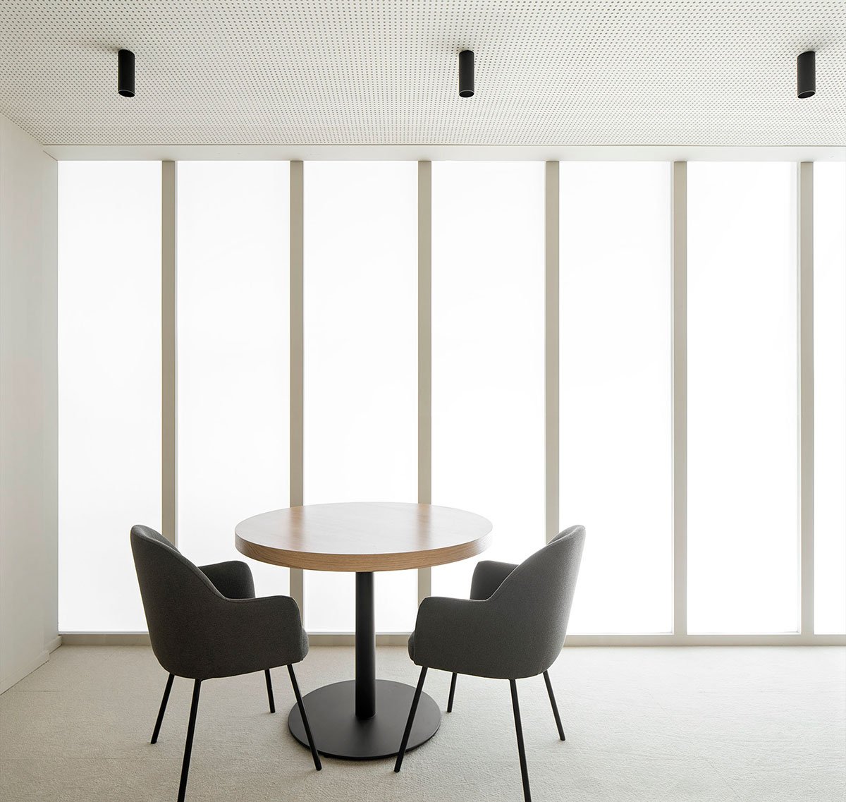 At the end of the building, there is the ceremony room, which takes advantage of the space between the trusses to generate a double-height space that receives light from its upper part. The entrance of the building is located on the Carrer dels Comtes de Bell-lloc, where the round shaped communications hub gives access to the first floor where the offices and administration are located.