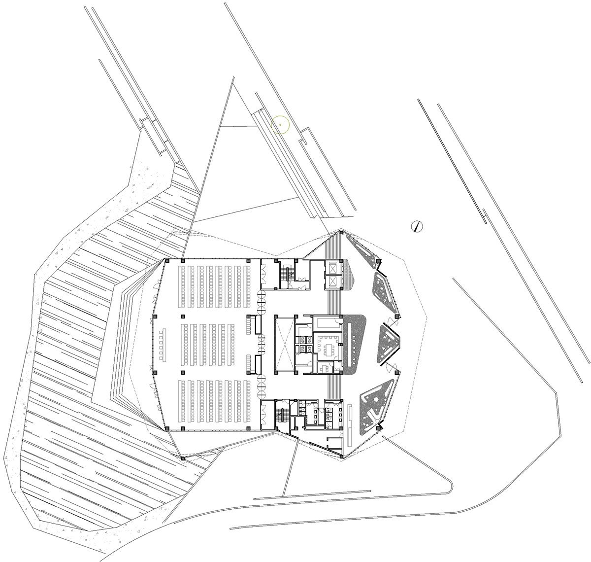 The key attraction of the resort is an extensive spa with a wide range of different water experiences. This spa building wraps around a hill at the center of the site, overlooking the valley. The building’s shape and therefore the experience of the spa are informed by this hill. As you progress through the stages of bathing, you are offered differing views across the changing landscape.