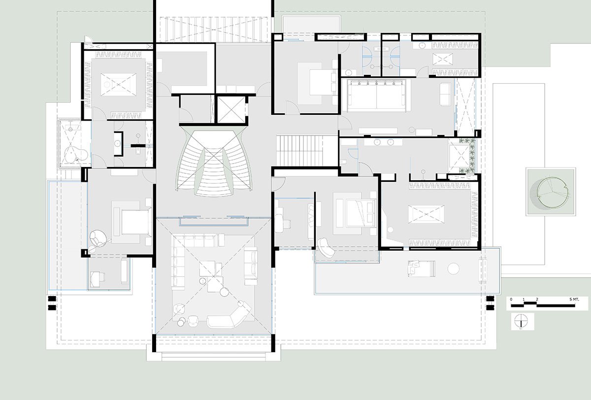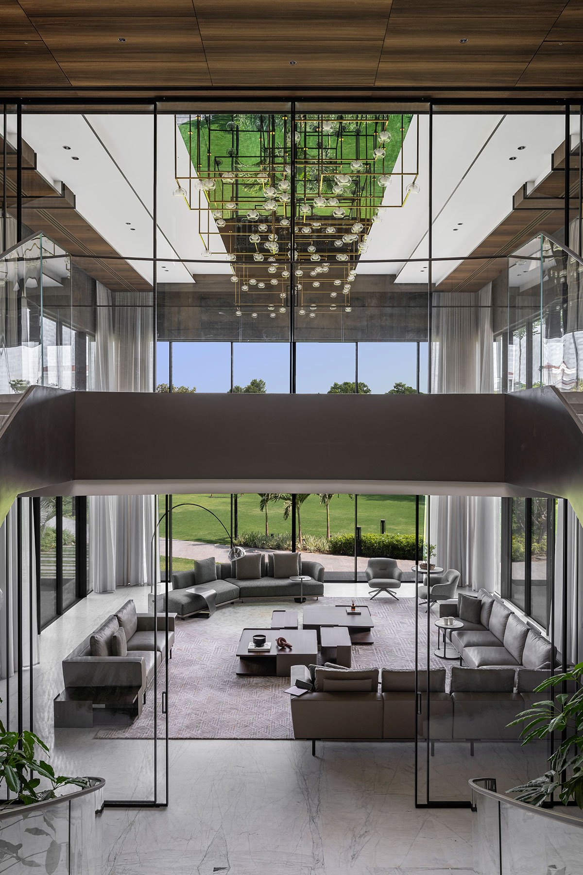 The villa’s design maximizes natural light and green spaces, creating a bright and serene atmosphere. The use of high ceilings, large windows, and skylights ensures that the interior feels spacious and welcoming.