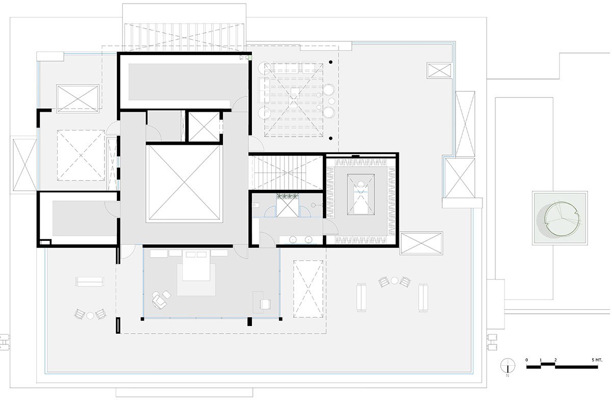 Sustainability Considerations: Sustainability played a crucial role in the design of Fusion Court. The villa’s north-facing orientation maximizes natural light, reducing the need for artificial lighting. Large windows and skylights ensure that the interior remains bright and well-ventilated. The integration of gardens, indoor plants, and rooftop greenery promotes a connection with nature, creating a peaceful living environment while improving air quality.