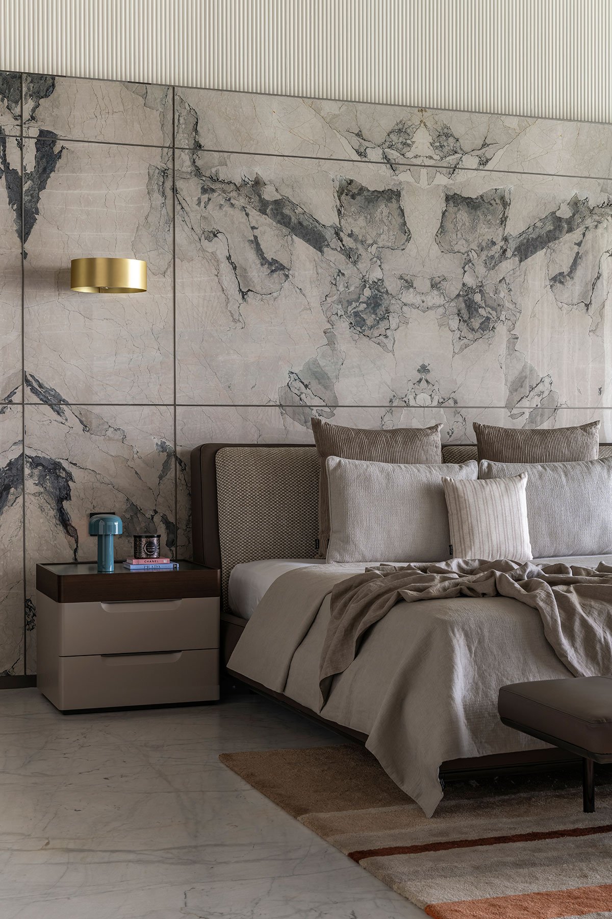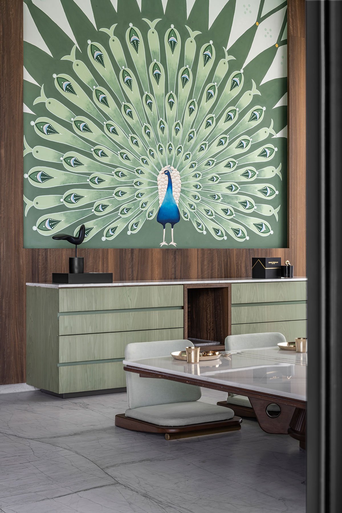 Furniture choices also reflect the blend of cultures and lifestyles, with contemporary and traditional dining tables coexisting harmoniously. Bespoke furniture enhances the luxury of the space, while chandeliers and lighting fixtures add elegance and depth to the interior.