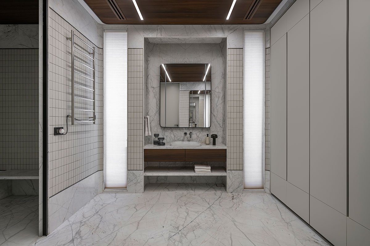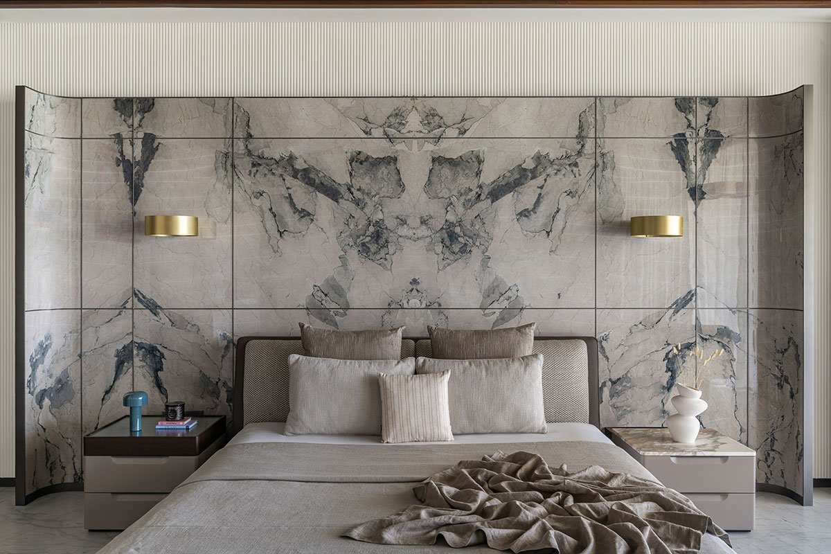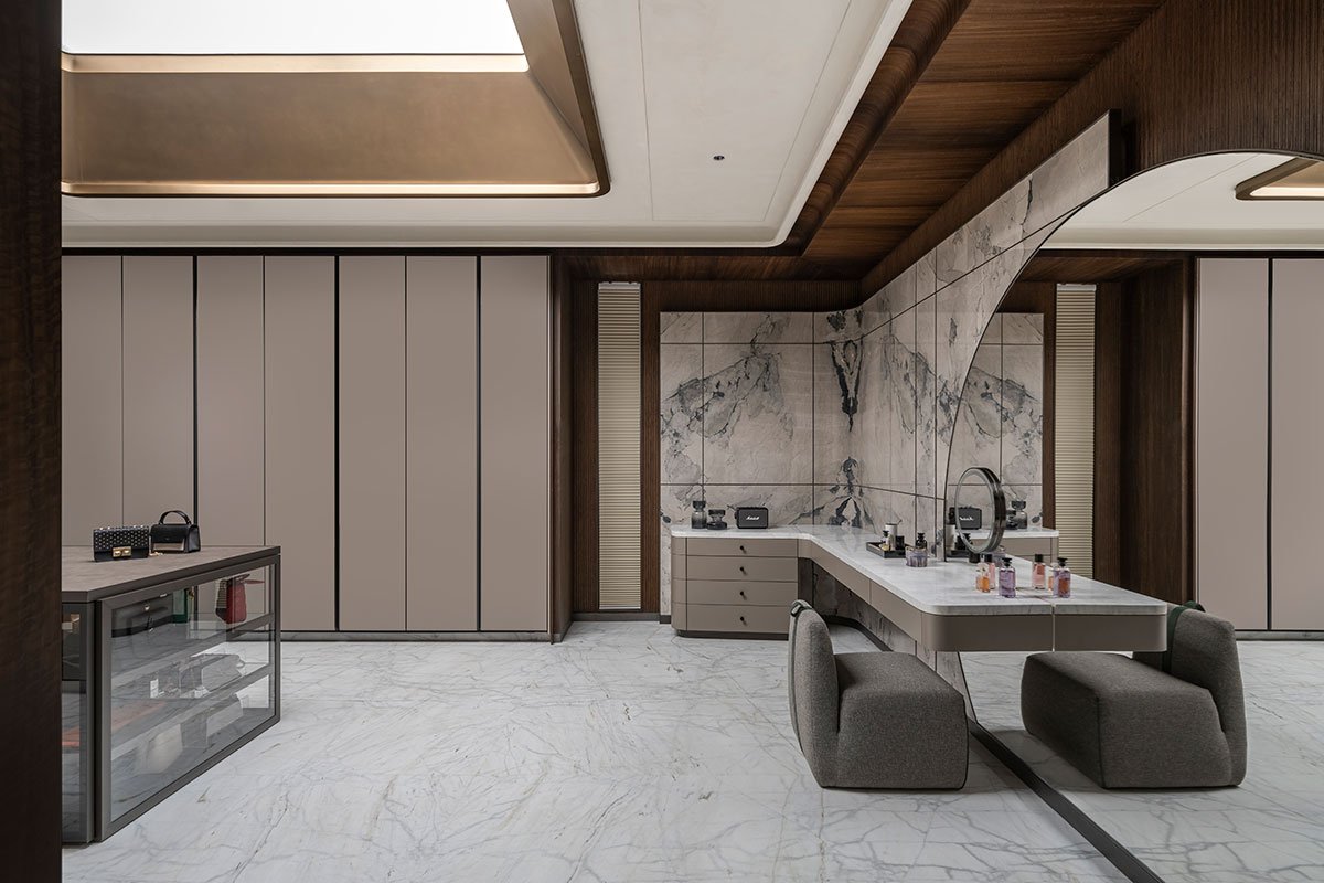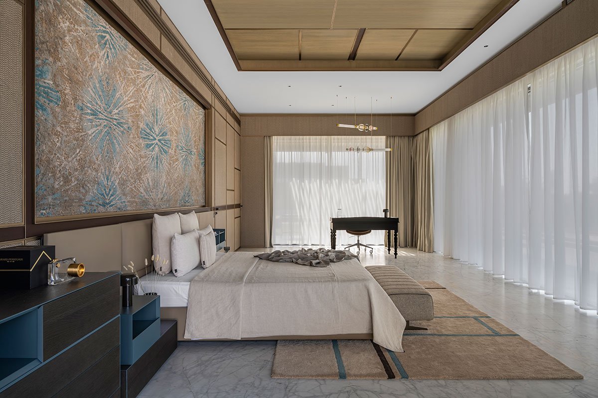 Smoky grey and white marble with a milky coral finish give the facade a luxurious yet durable appearance. Serrated teak wood adds warmth and craftsmanship, especially in the Oshri. Inside, beige textured paint and eucalyptus veneer create a calming atmosphere, while high-quality marble flooring elevates the overall look. The double-height formal living room, enhanced by large aluminum sliding doors, connects indoor and outdoor spaces, further emphasizing openness and grandeur. Skylights in the central courtyard and master dressing rooms flood the interiors with natural light, creating an airy ambiance throughout the villa.