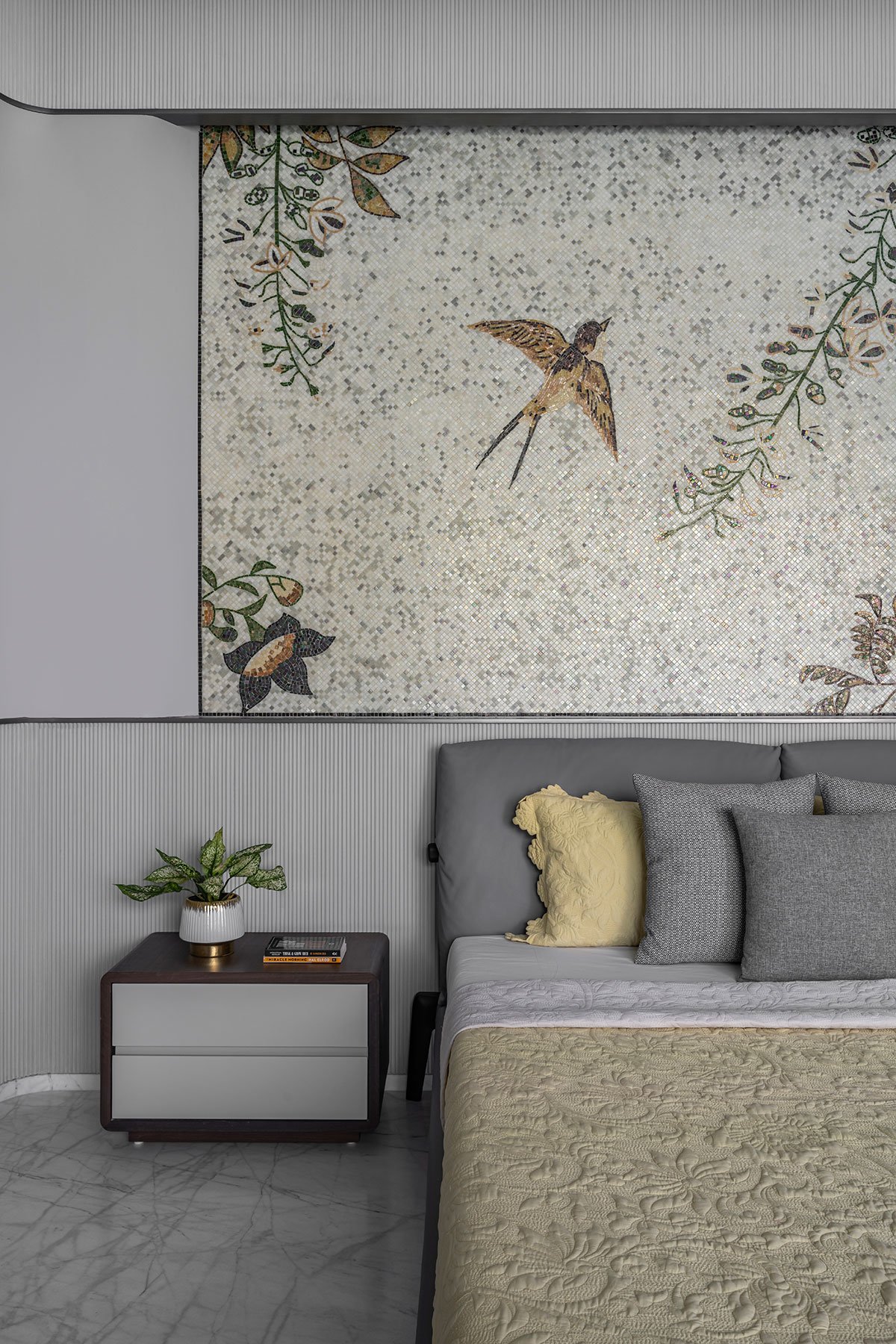 Color Palette and Lighting: The color palette of Fusion Court features muted tones and earthy hues, emphasizing tranquility and elegance. Shades of grey, beige, and soft whites provide a neutral base, while coral and green accents add warmth and contrast. The careful selection of these tones, complemented by natural light from strategically placed windows and skylights, creates a seamless flow between different areas of the home. This consistent use of color enhances the villa’s serene and sophisticated atmosphere.
